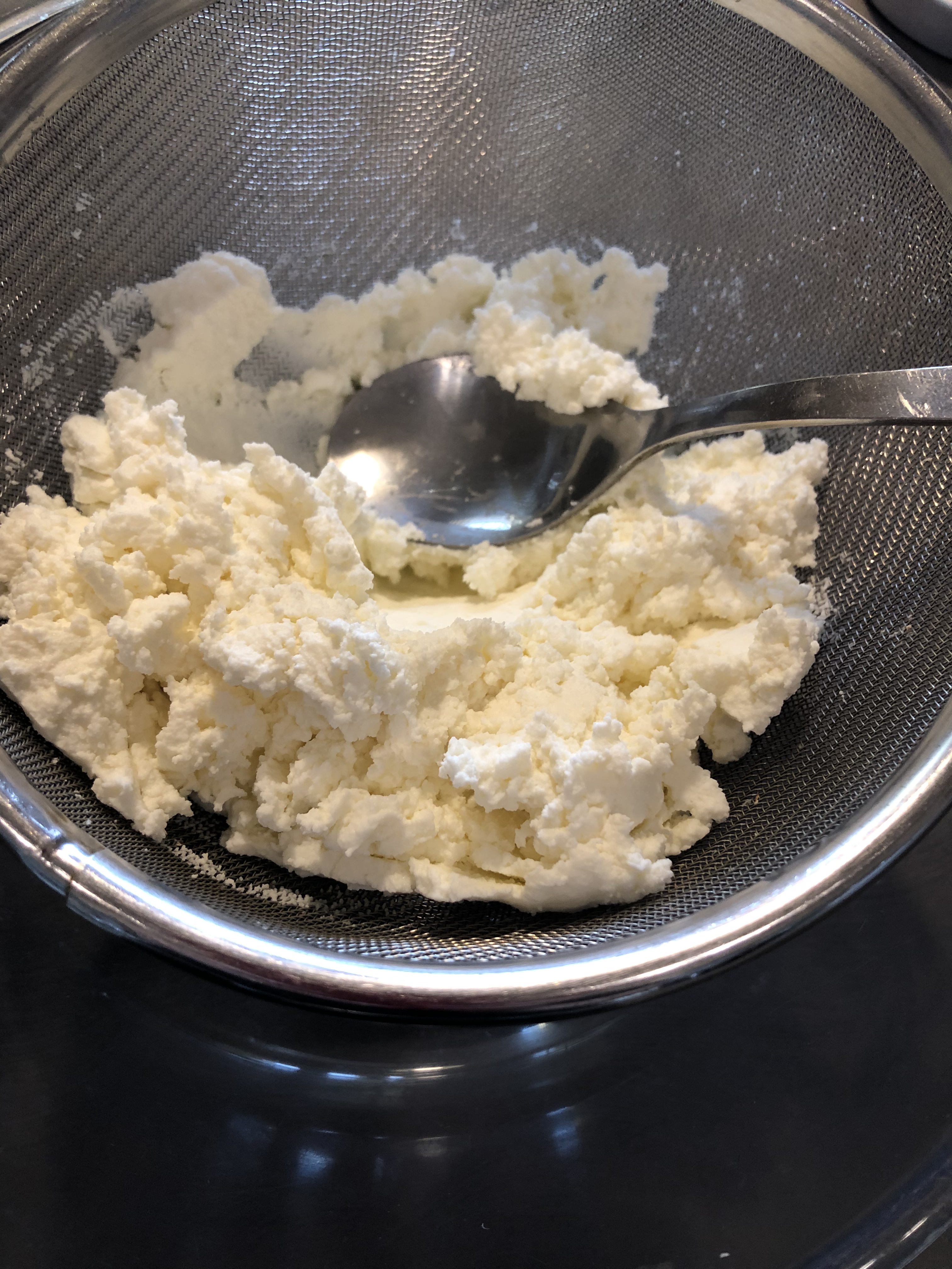 In un colino verso la ricotta e la setaccio, scegliete una ricotta piuttosto asciutta