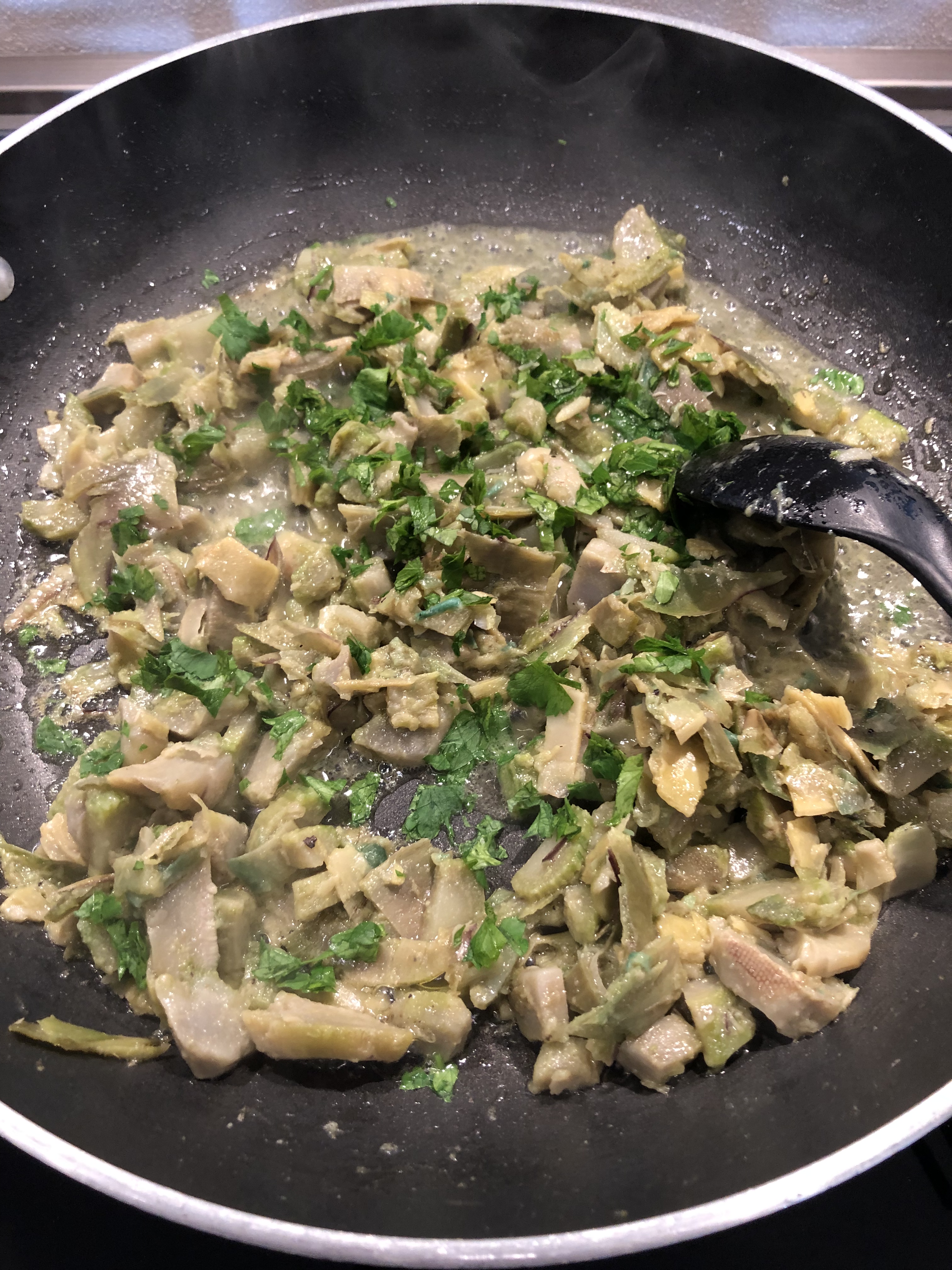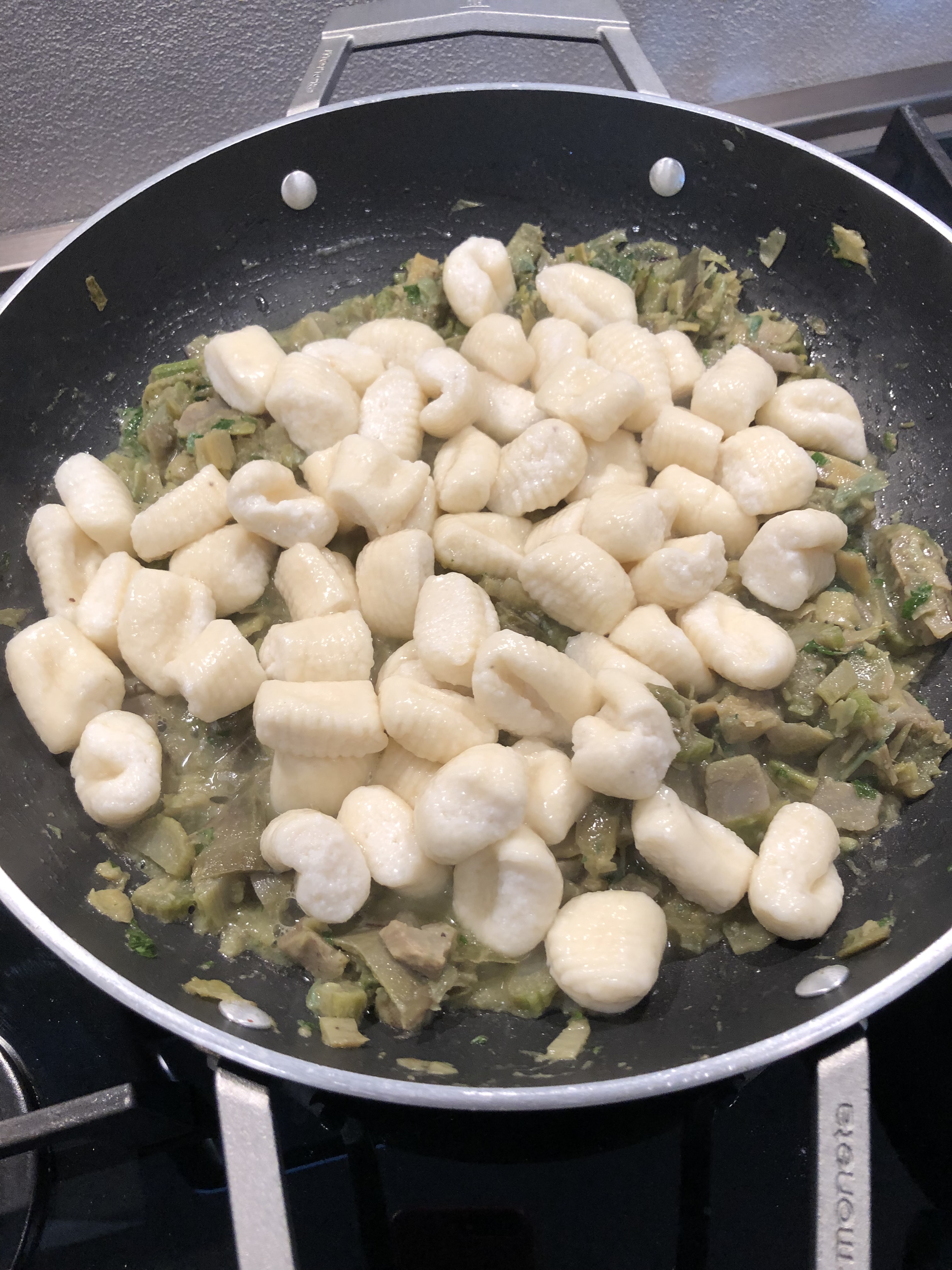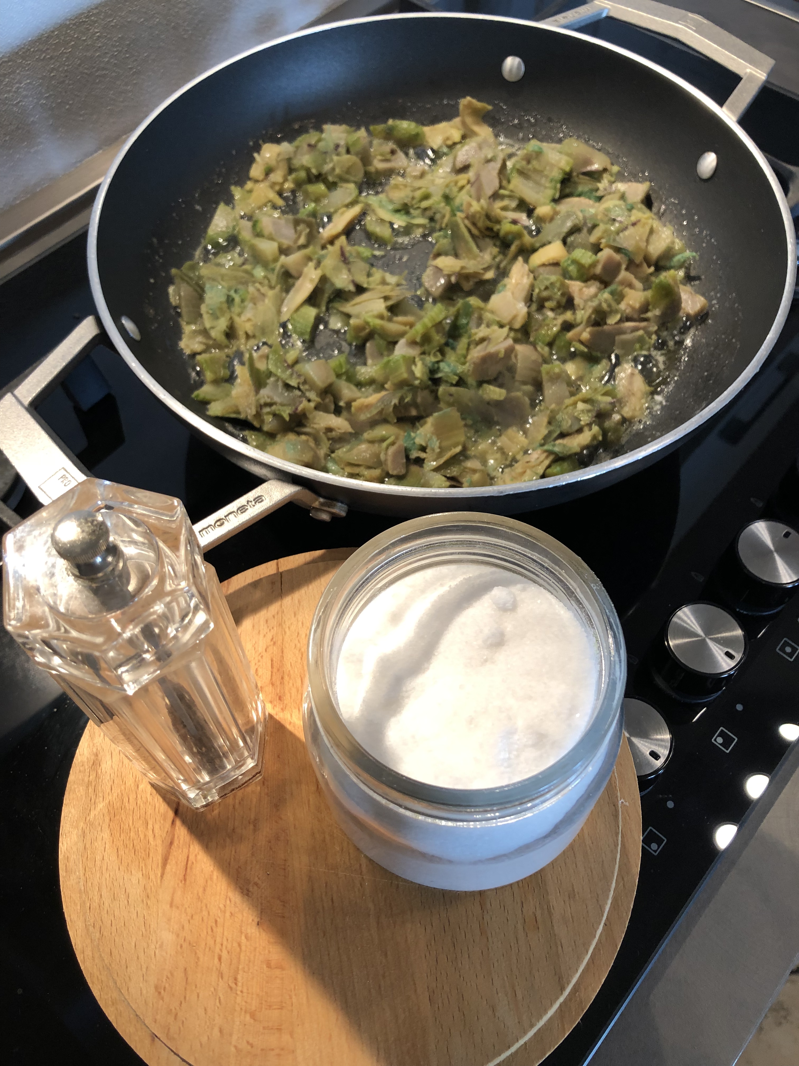 Quindi in una larga padella verso dell”olio extravergine e il burro, lascio sciogliere e aggiungo i carciofi, sale, pepe e lascio cuocere per una decina di minuti aggiungendo alcuni cucchiai di acqua di cottura degli gnocchi