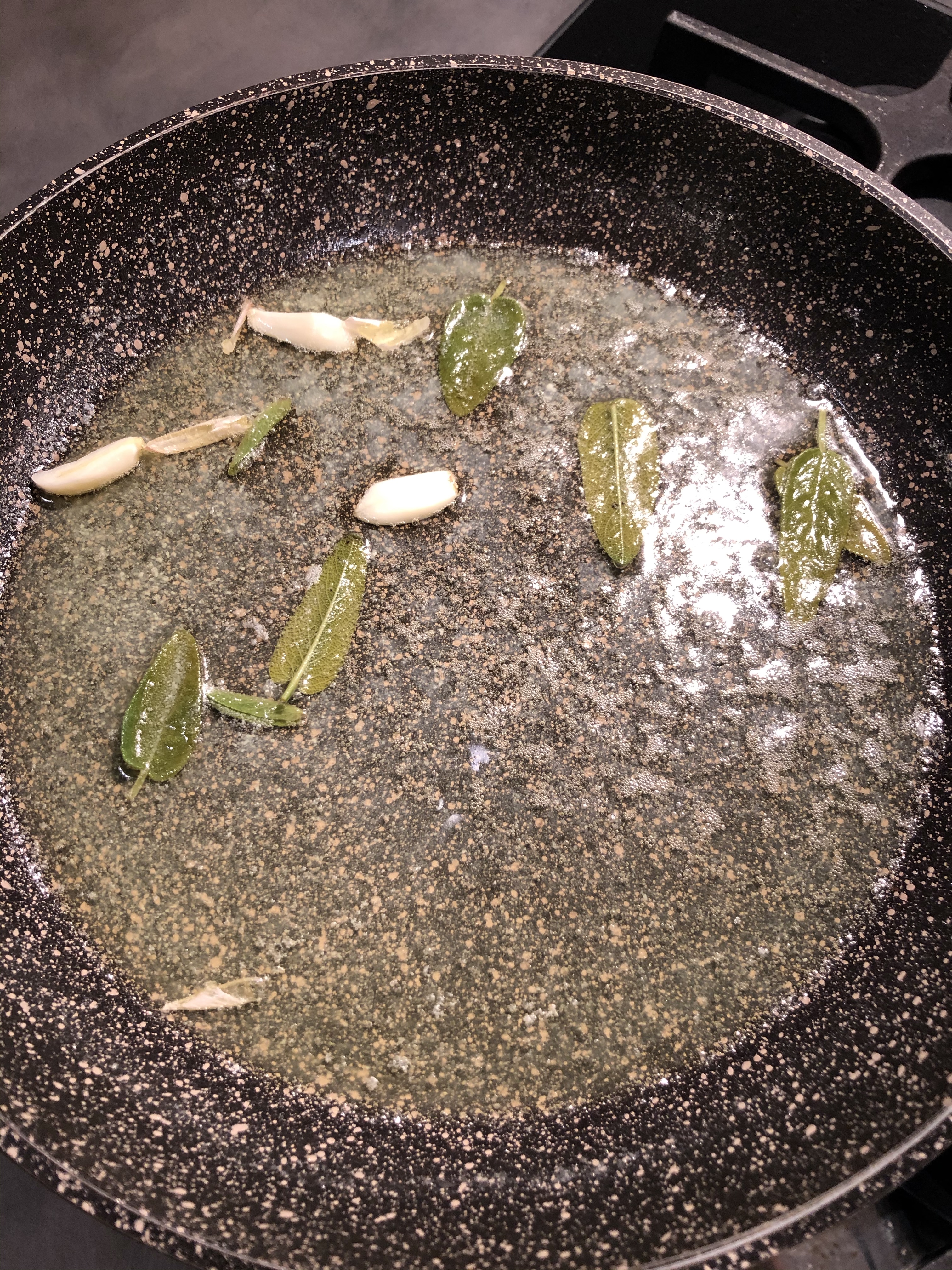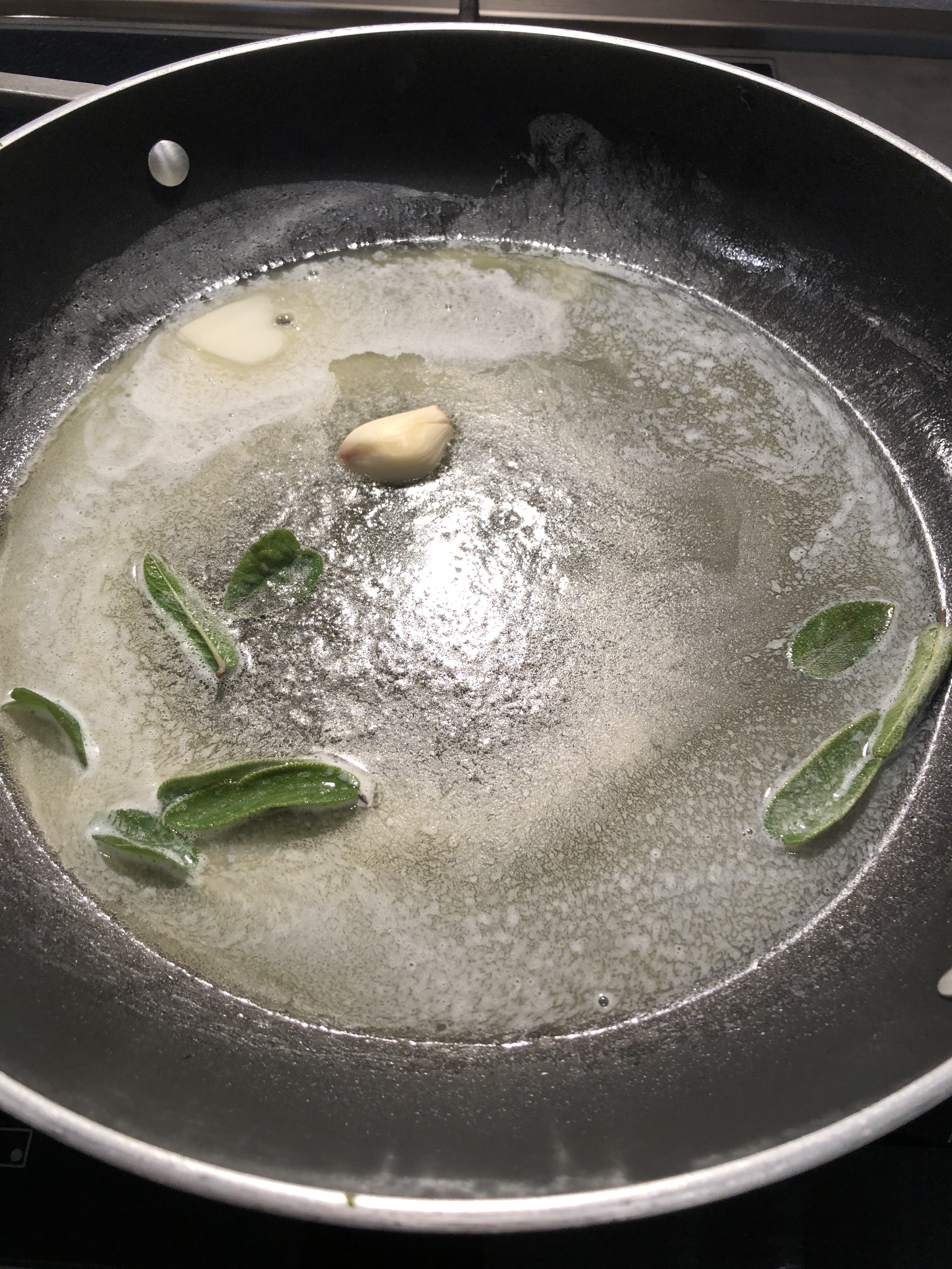 In una padella metto il burro, poco olio, la salvia e 2 spicchi di aglio e lascio soffriggere
