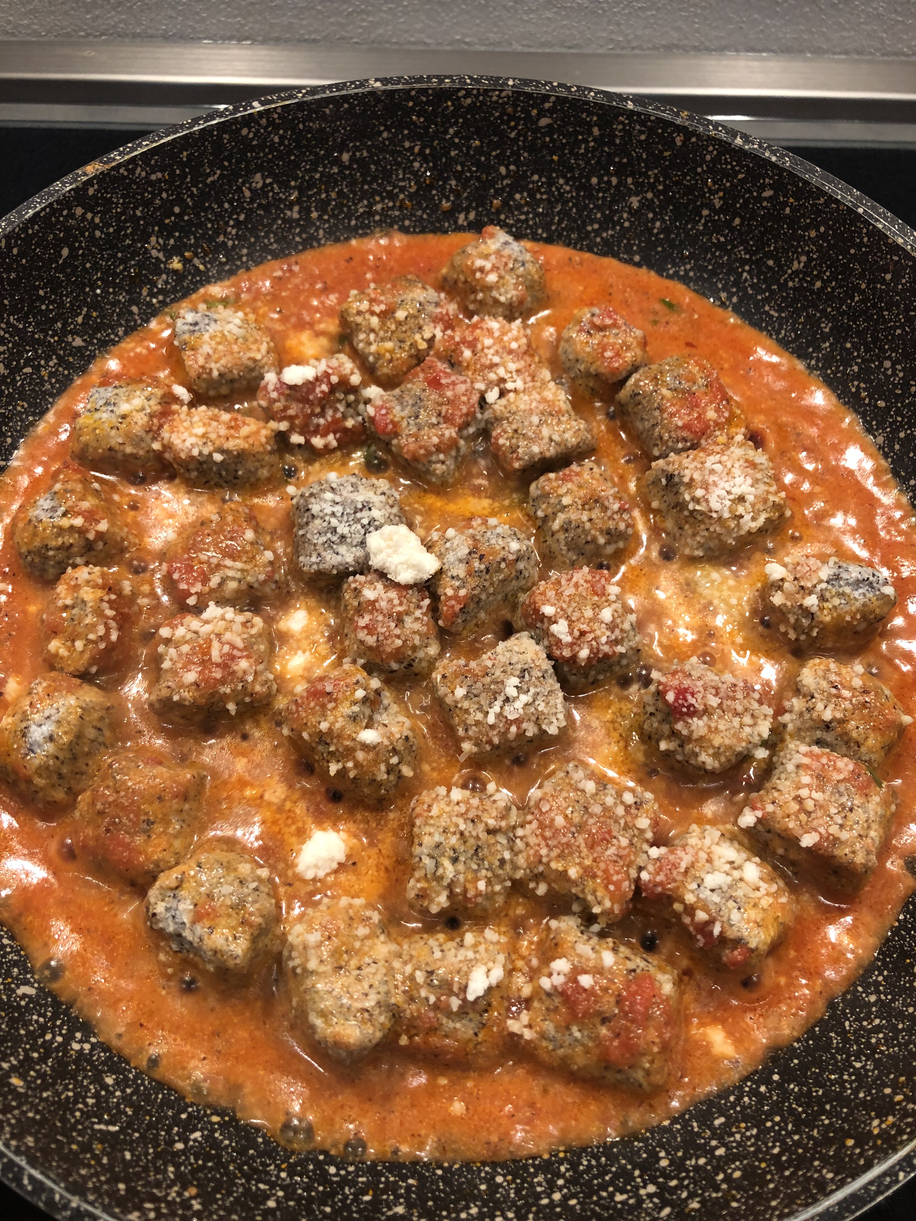 Aggiungo ancora del sugo e un mestolino di acqua di cottura, muovo delicatamente la padella, sono comunque delicati, una spolverata di parmigiano grattugiato