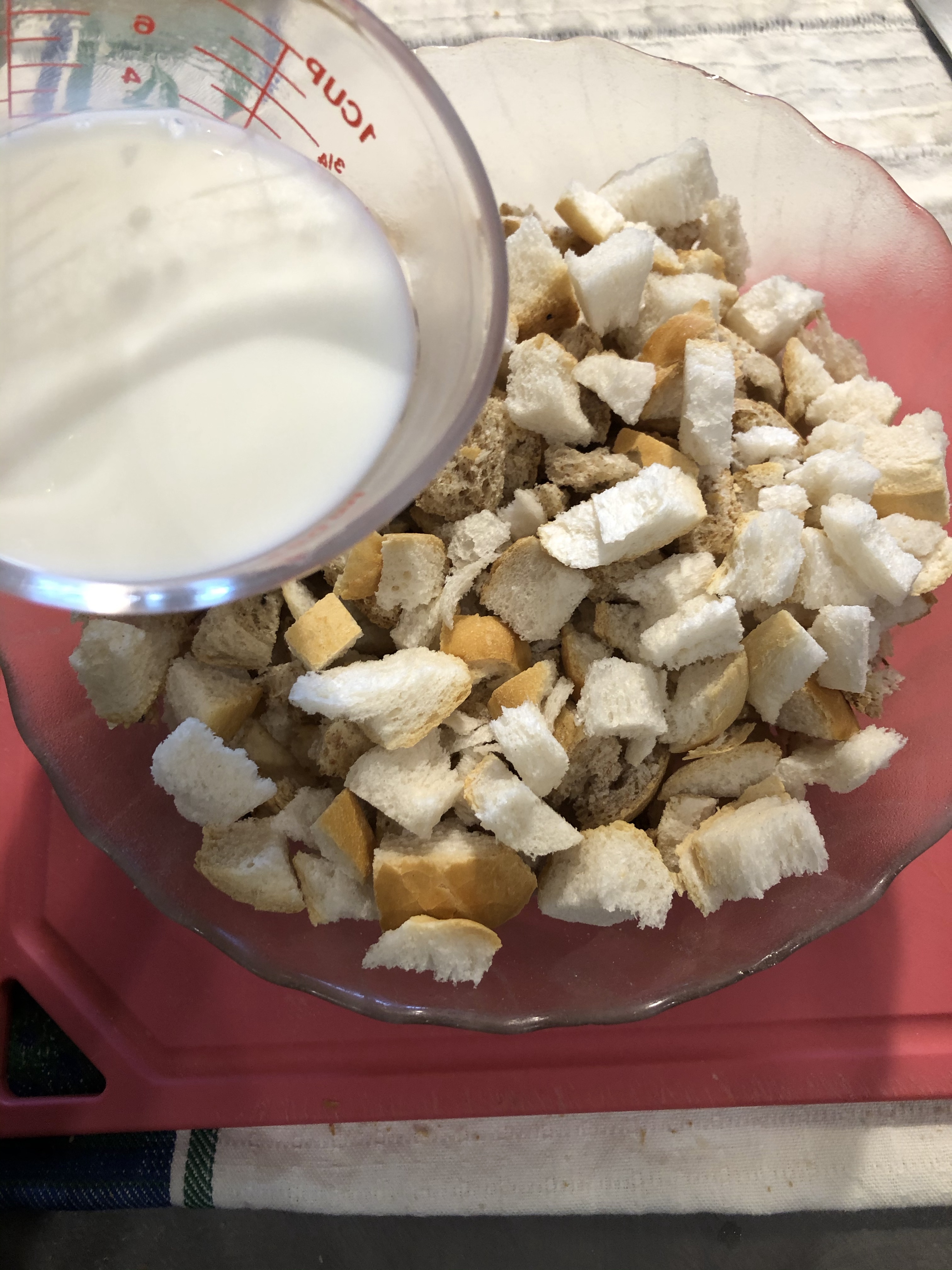 Taglio il pane raffermo a cubetti piccoli e li bagno con latte tiepido, lascio un po’ a riposare in modo che il pane si ammorbidisca