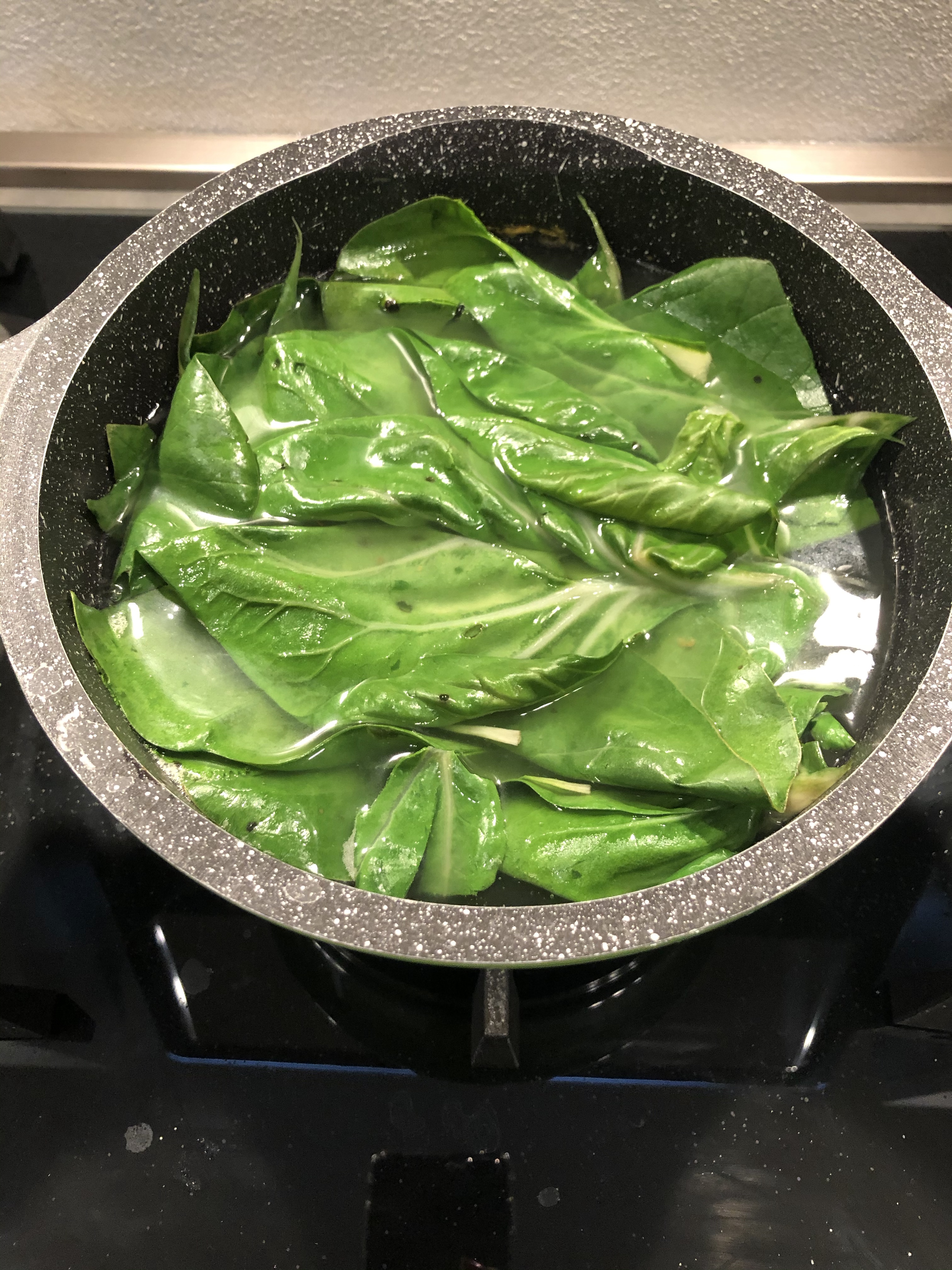 In una larga padella verso un goccio di olio e uno spicchio di aglio e quando é caldo verso gli spinaci, copro e lascio cuocere qualche minuto, quando calano di volume aggiungo sale e pepe e cuocio velocemente