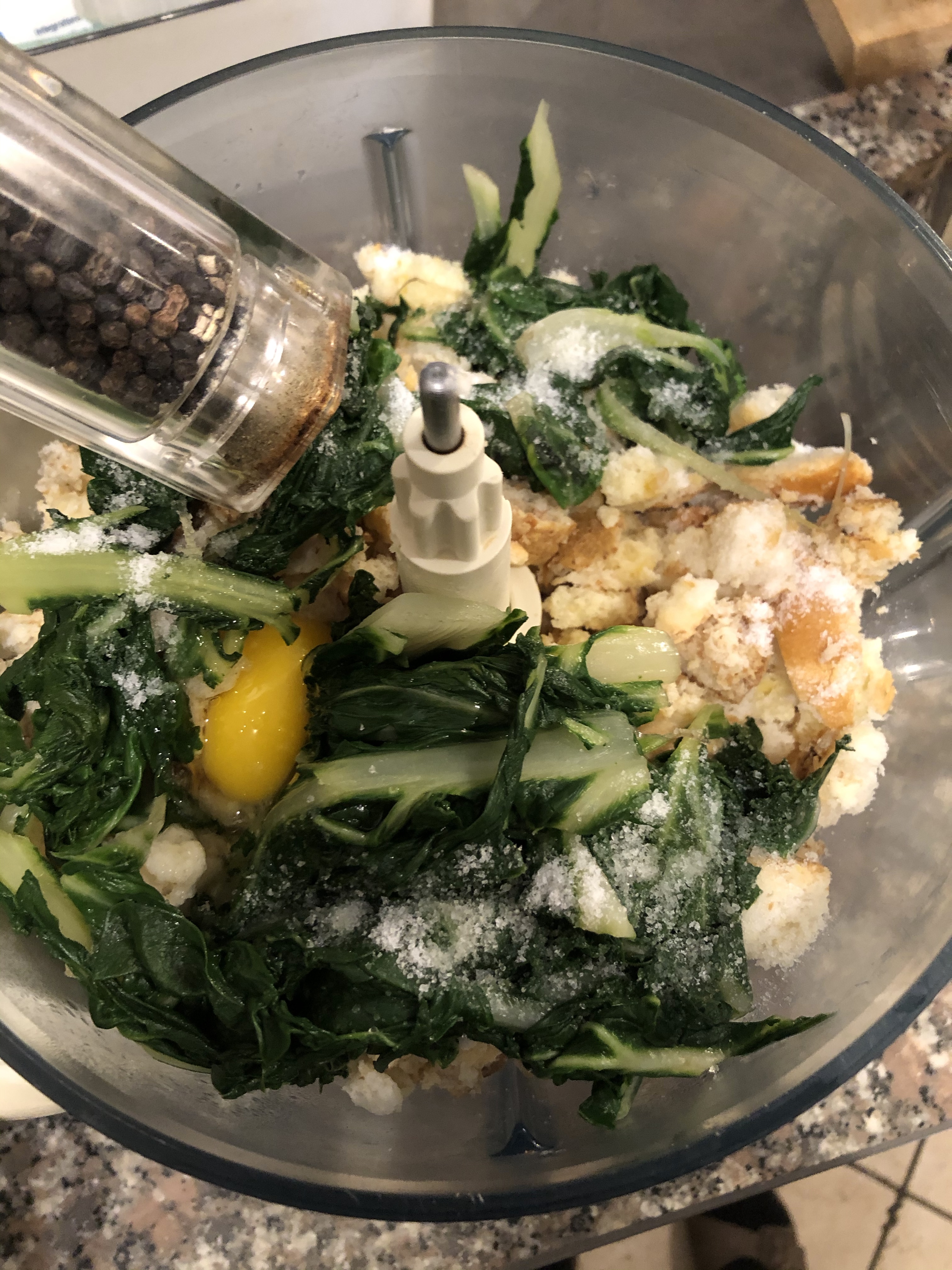 In un mixer verso il pane ammorbidito, le biete strizzate, l”uovo, sale e pepe