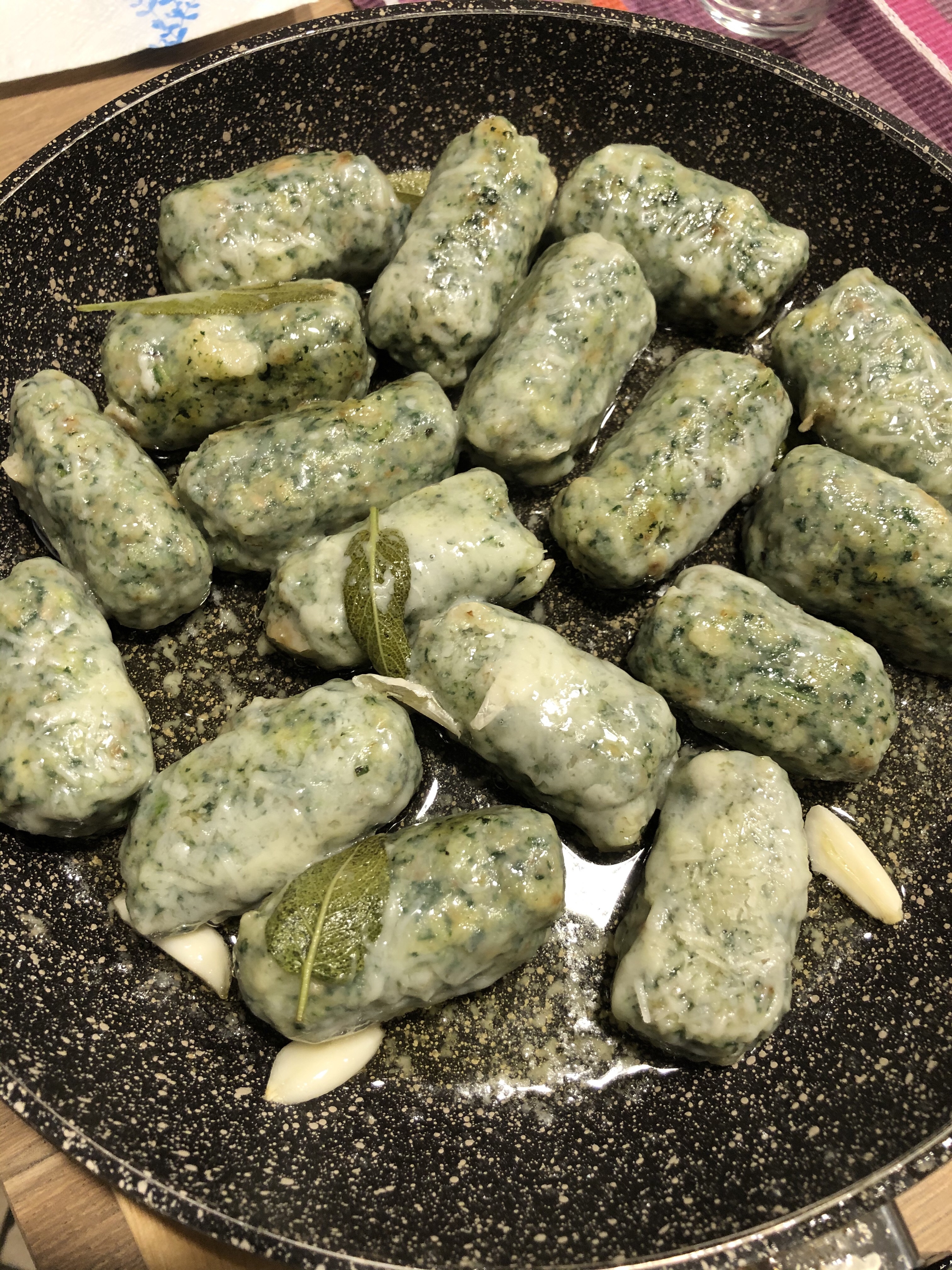 Intanto in una larga padella verso il burro, uno spicchio di aglio, la salvia e due cucchiai di acqua di cottura salata dei malfatti che nel frattempo ho portato a bollore