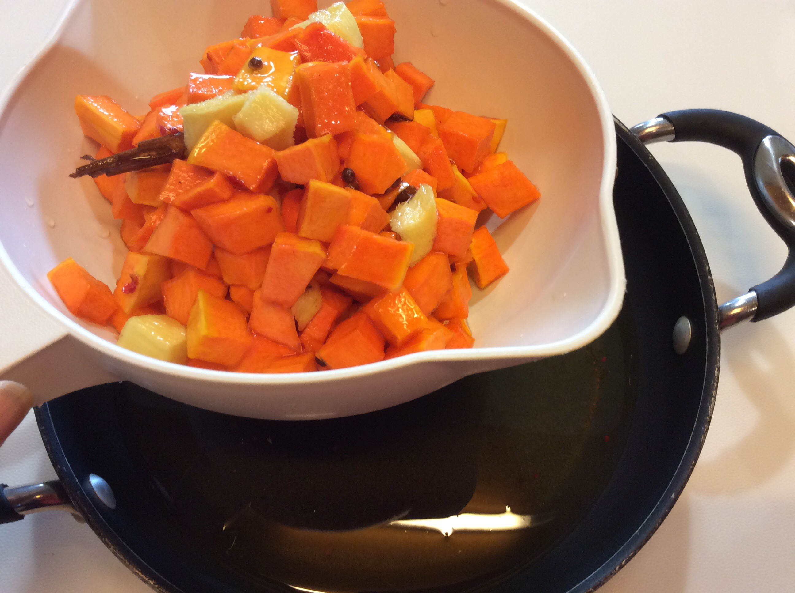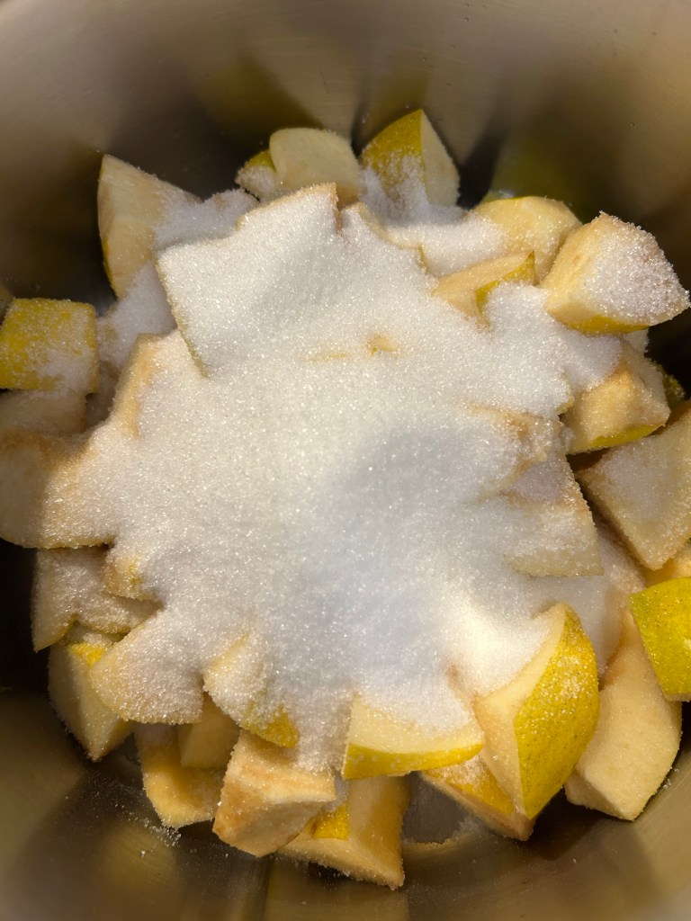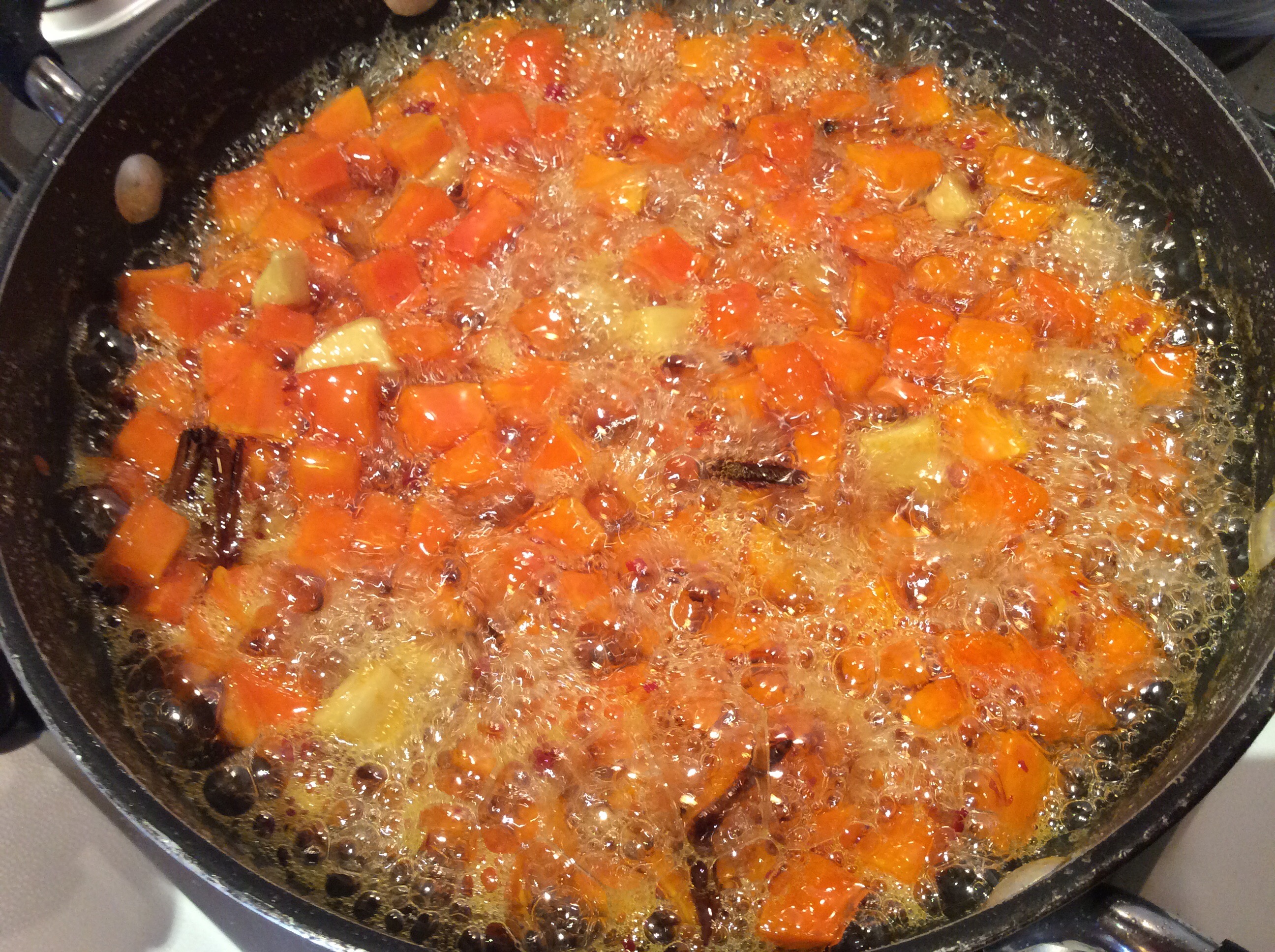 Trascorsi i 30 minuti di bollitura tolgo il coperchio, aggiungo lo zucchero, lo zenzero e la polvere di vaniglia o i semi di una bacca, mi raccomando non utilizzate la vanillina, piuttosto non mettetela