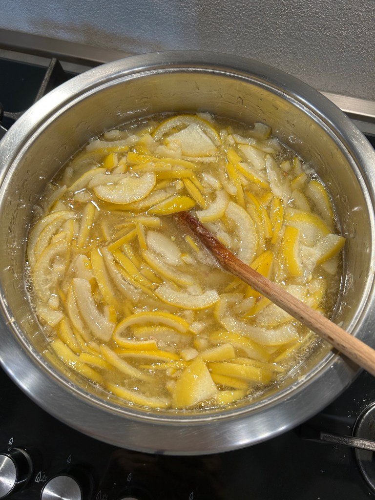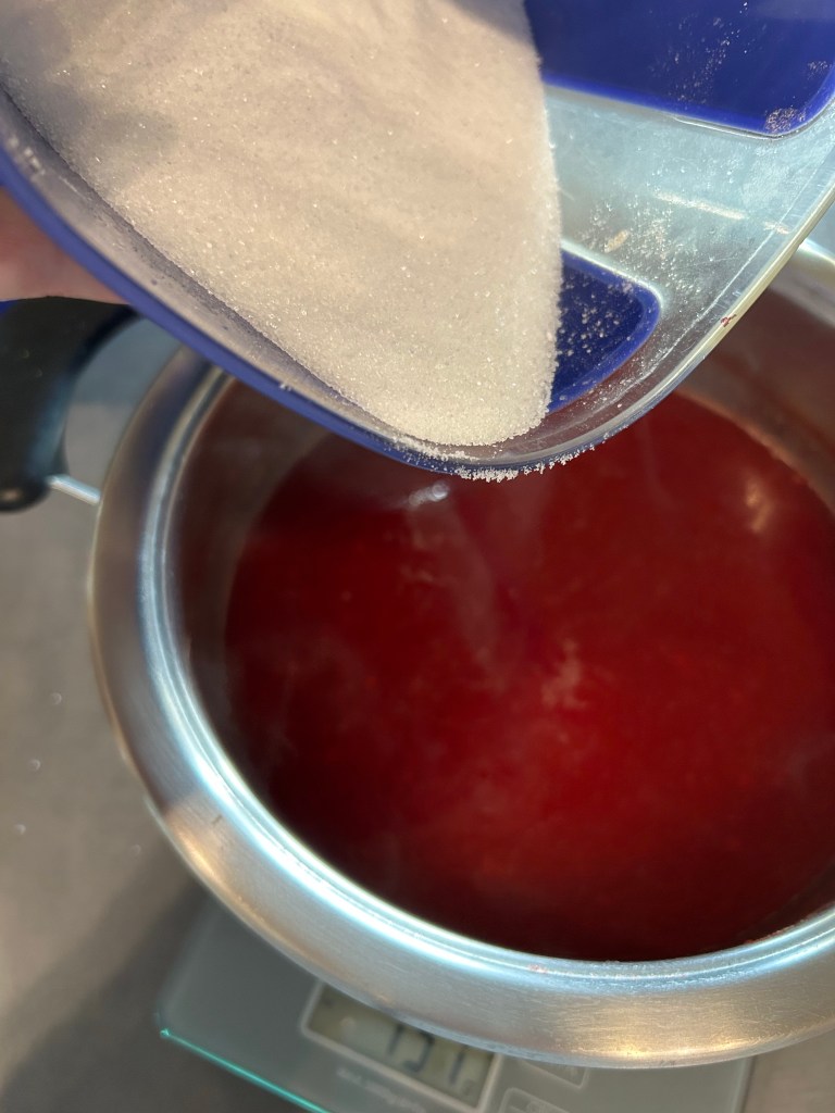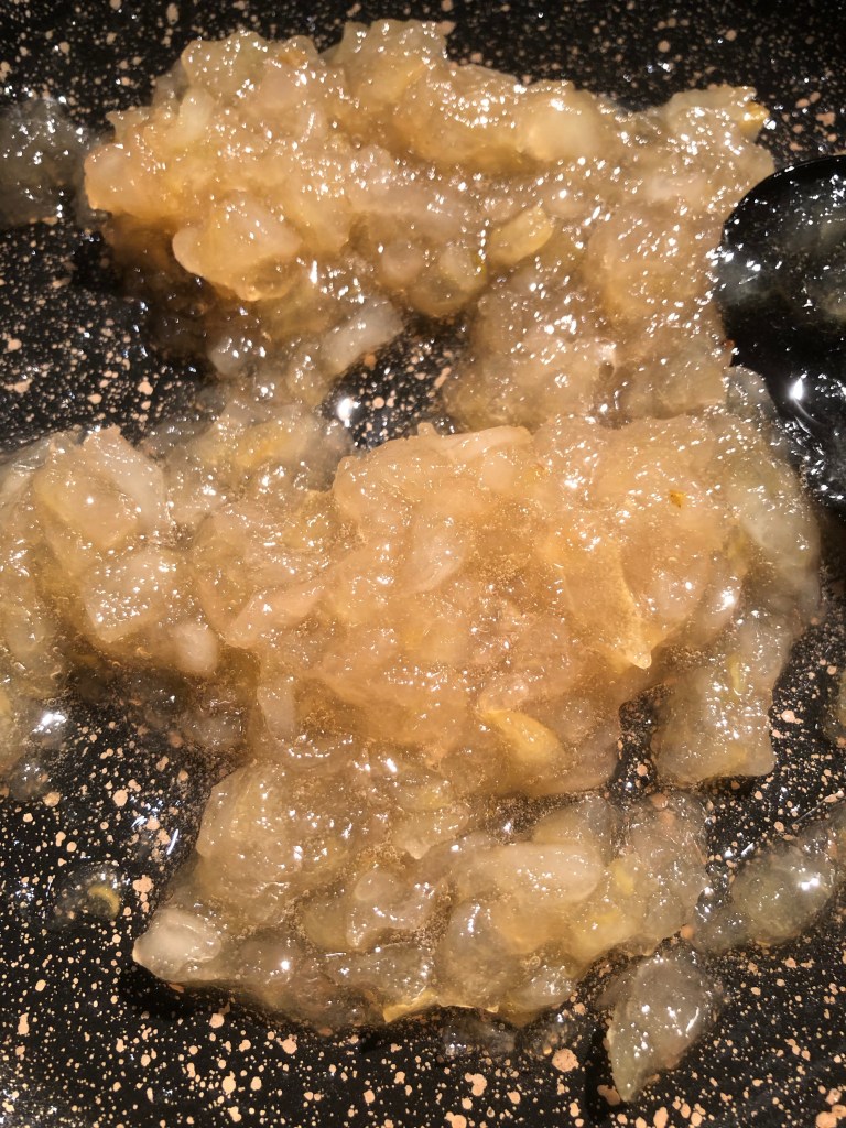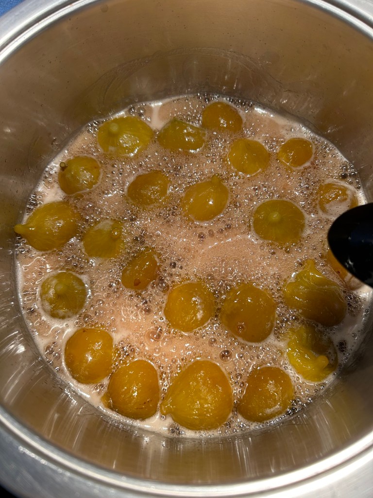 Lascio sobbollire dolcemente per circa 45/50 minuti mescolate spesso perché tende ad attaccare, si formerà una consistenza gelatinosa che sembrerà liquida ma che indurirà raffreddandosi,, nel frattempo sterilizzo i vasetti e i tappi facendoli bollire per 20 minuti