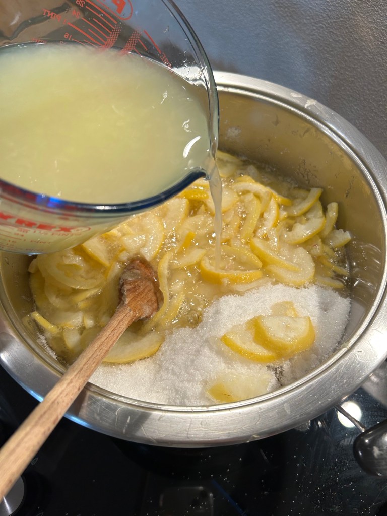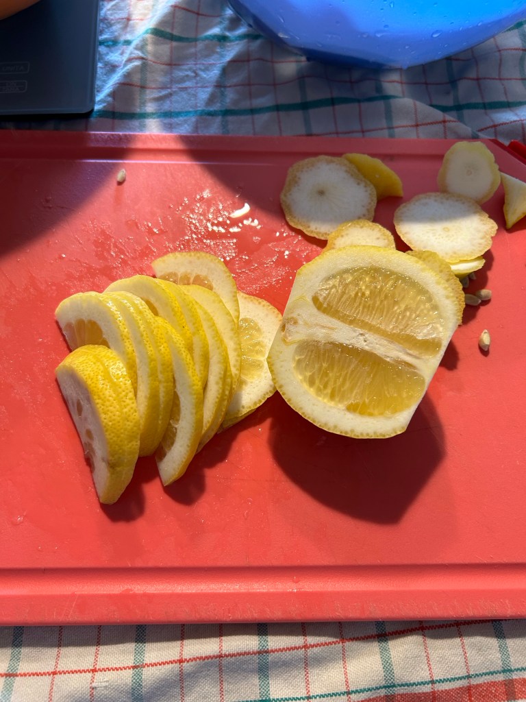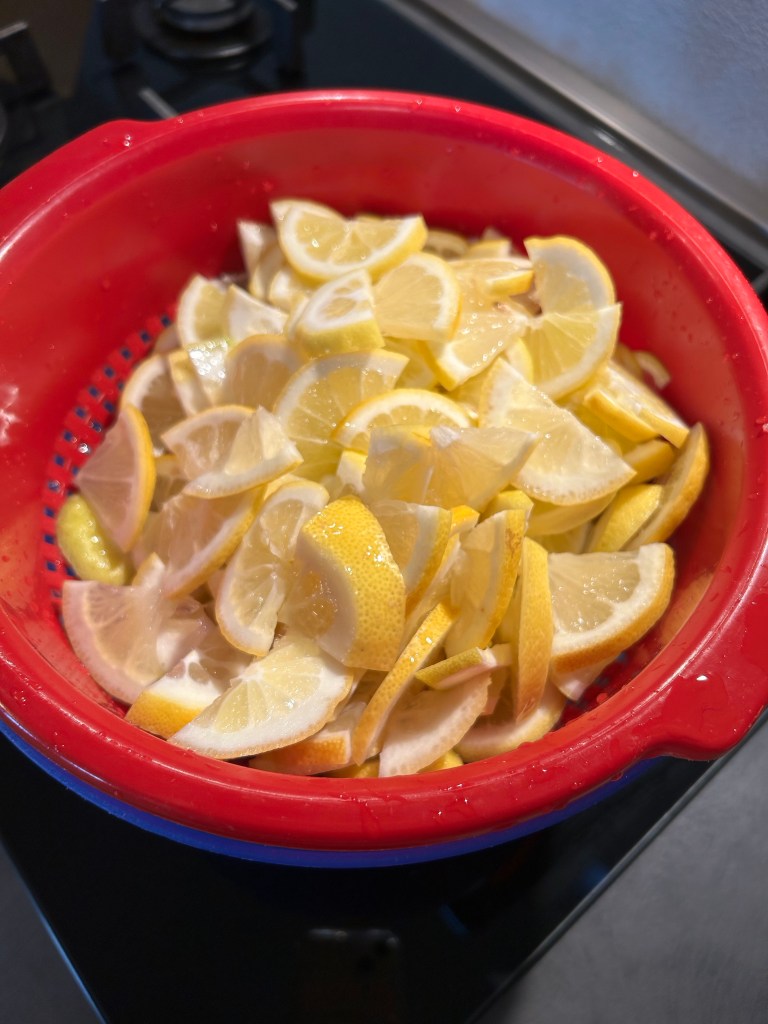 Divido i limoni a metà tagliandoli per il senso della lunghezza e li affetto sottilmente circa 2/3 mm eliminando eventuali semi e raccogliendo il succo che fuoriesce