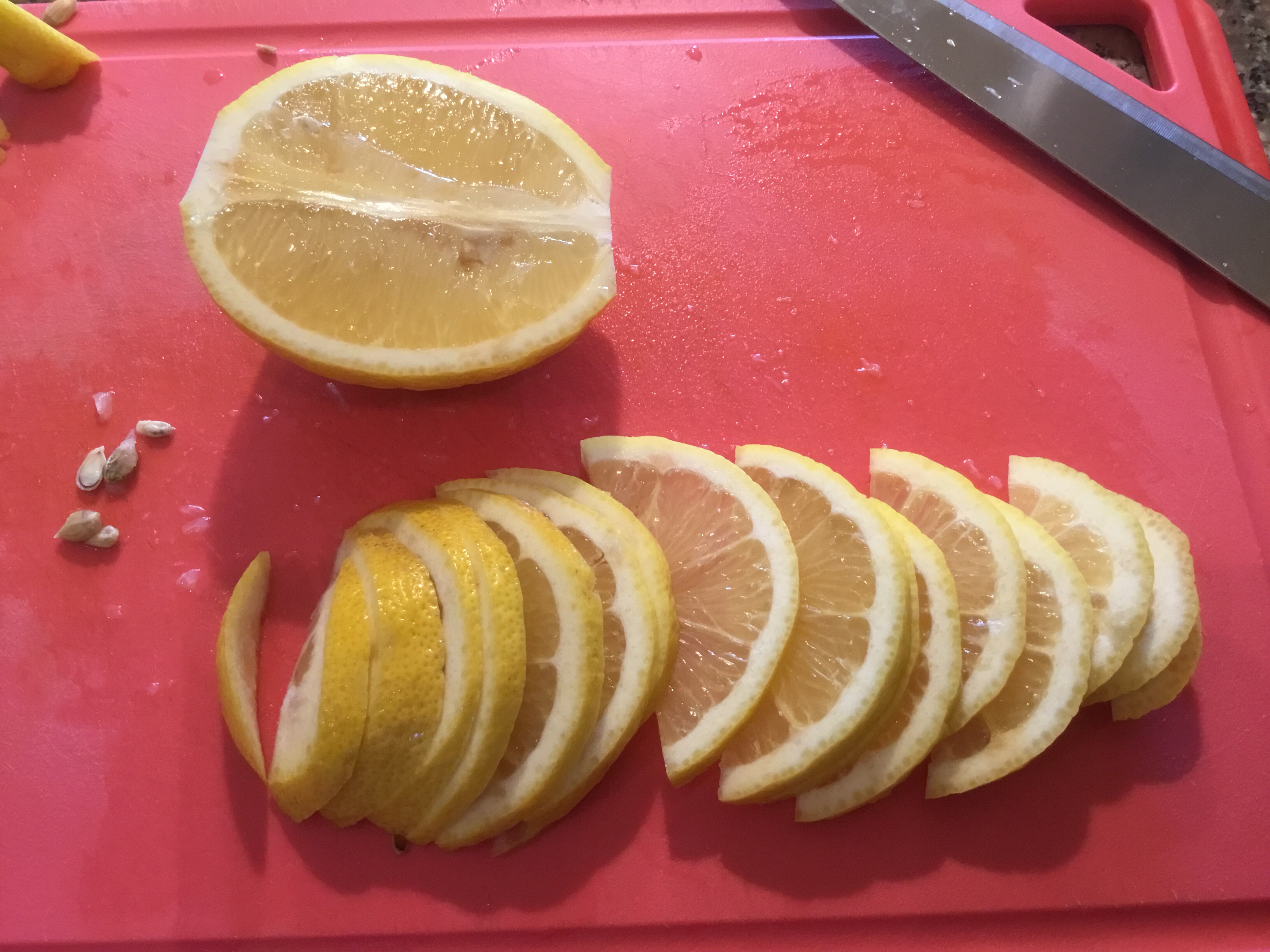 Divido i limoni a metà tagliandoli per il senso della lunghezza e li affetto sottilmente circa 2/3 mm eliminando eventuali semi e raccogliendo il succo che fuoriesce