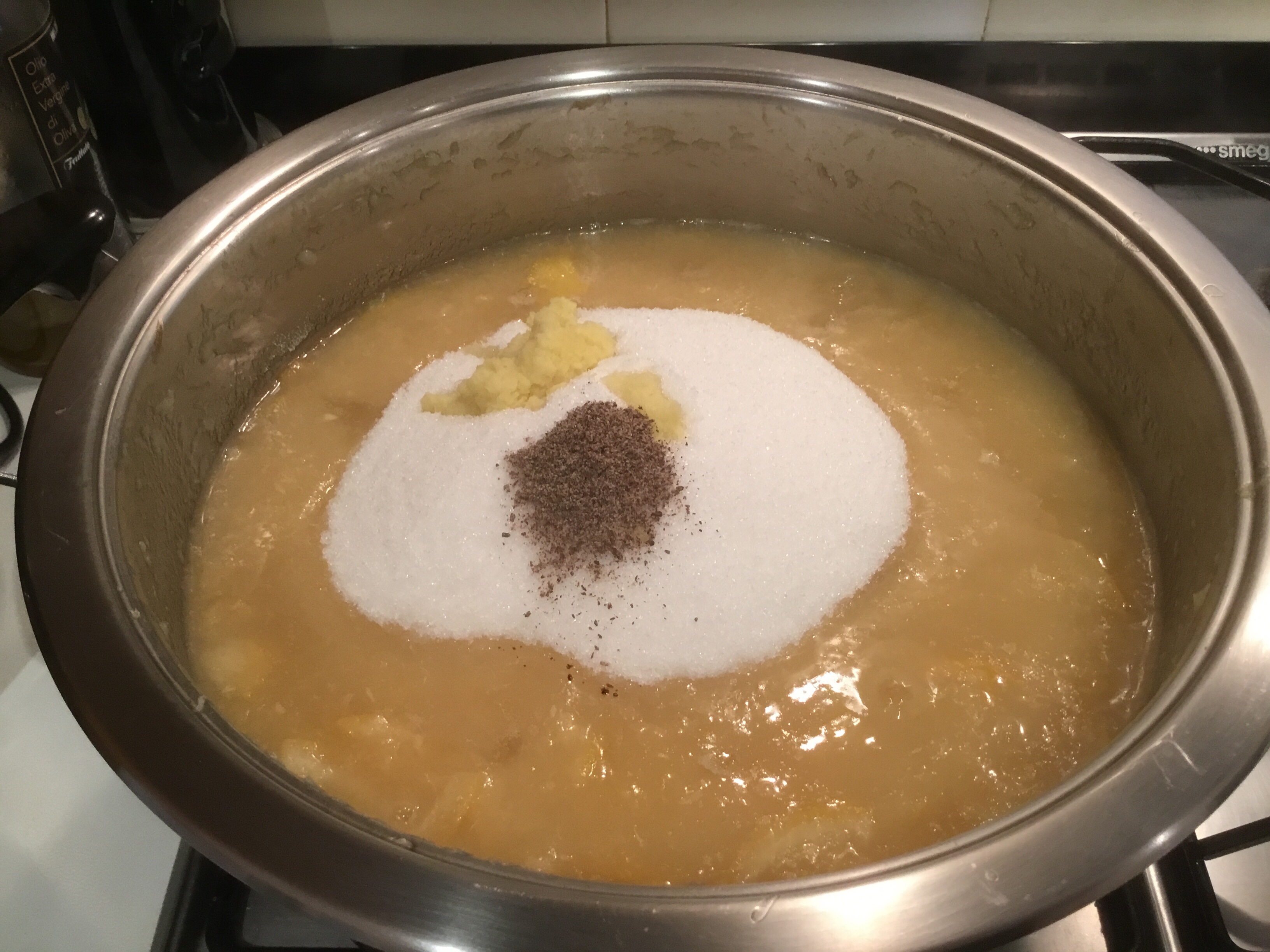 Trascorsi i 30 minuti di bollitura tolgo il coperchio, aggiungo lo zucchero, lo zenzero e la polvere di vaniglia o i semi di una bacca, mi raccomando non utilizzate la vanillina, piuttosto non mettetela