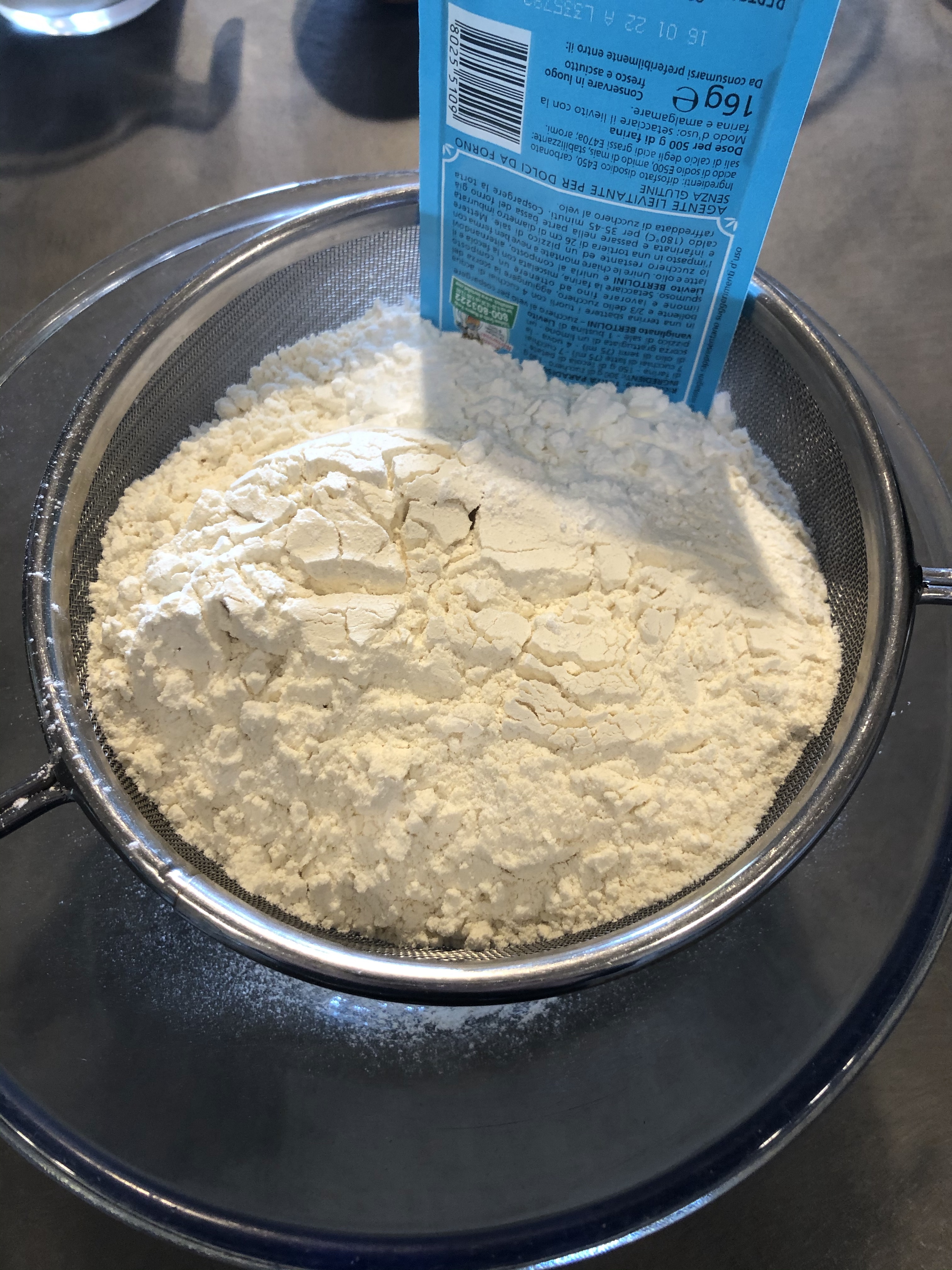 Setaccio le due farine, aggiungo il lievito e la vaniglia