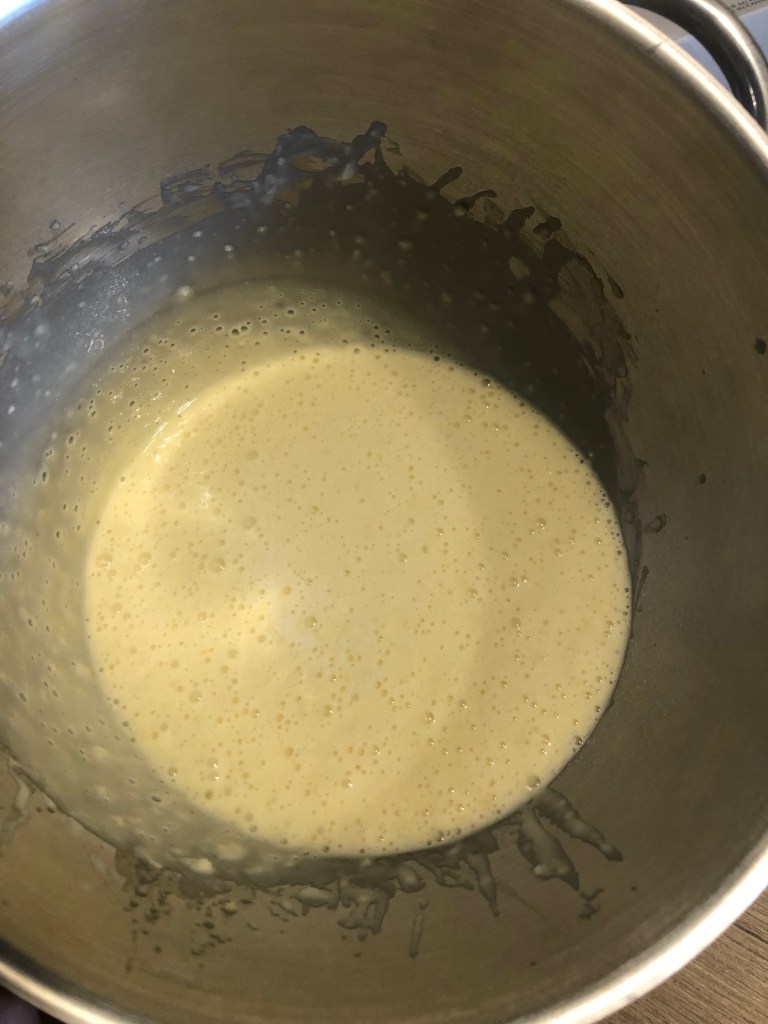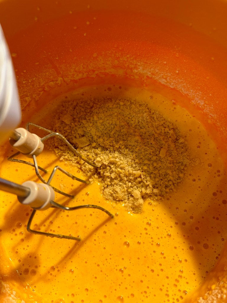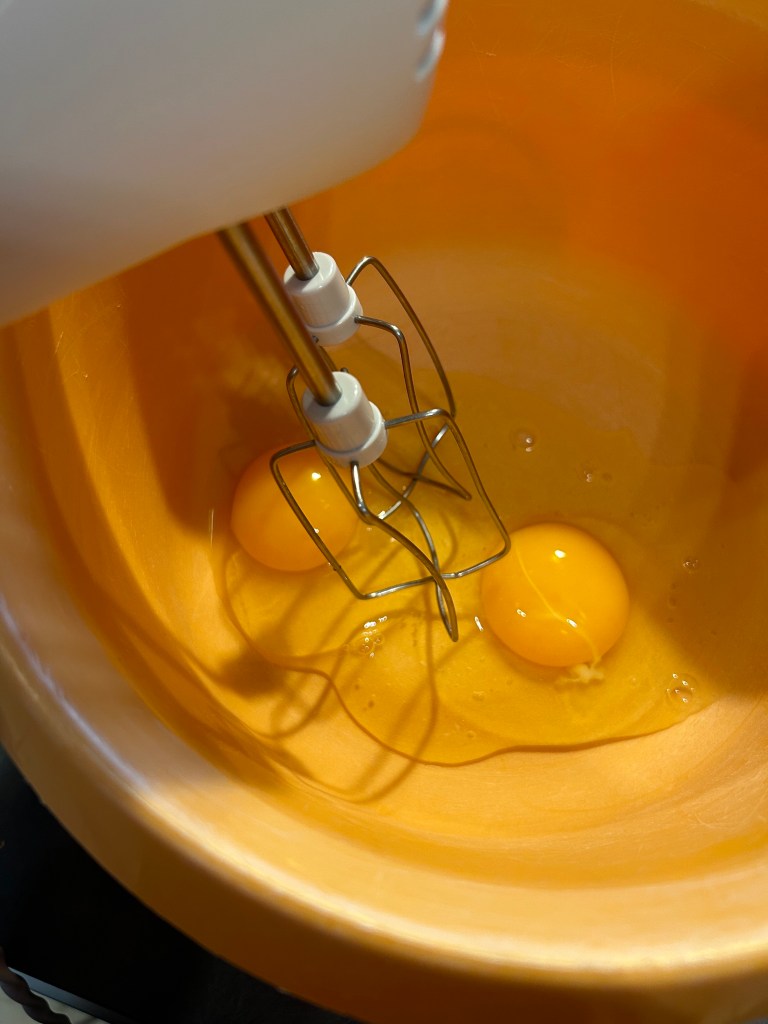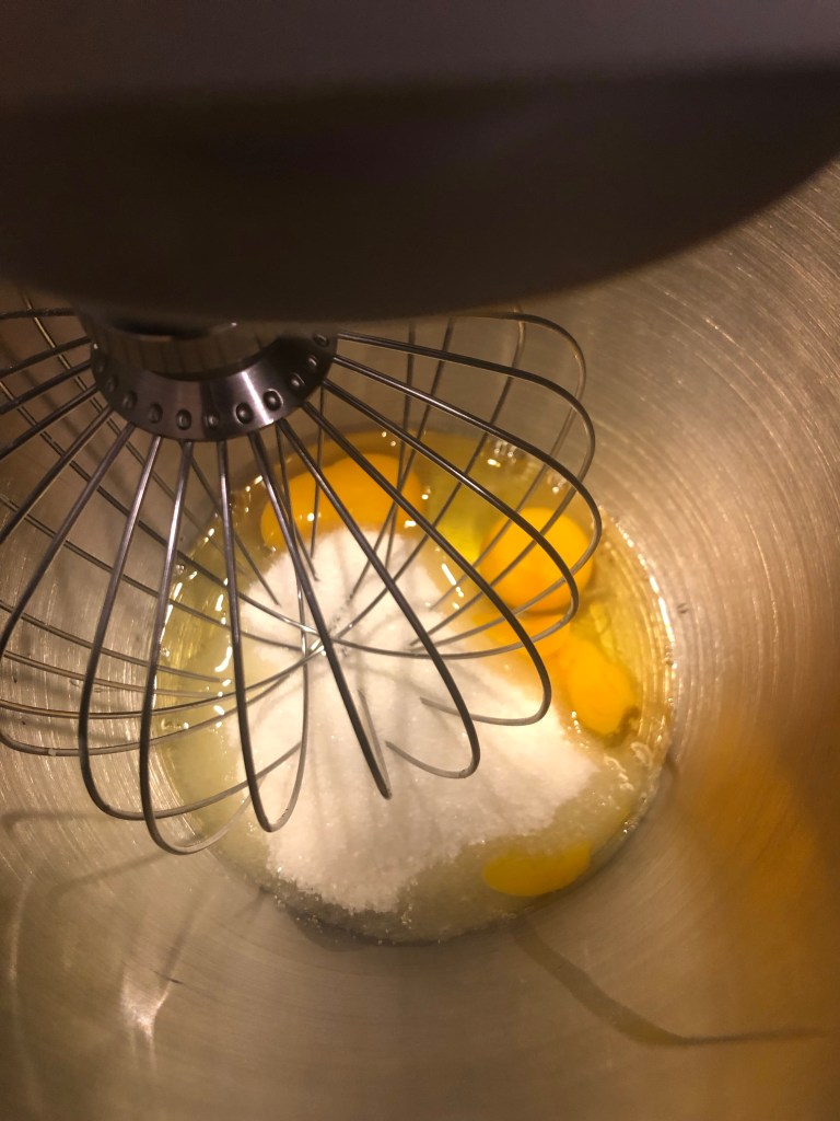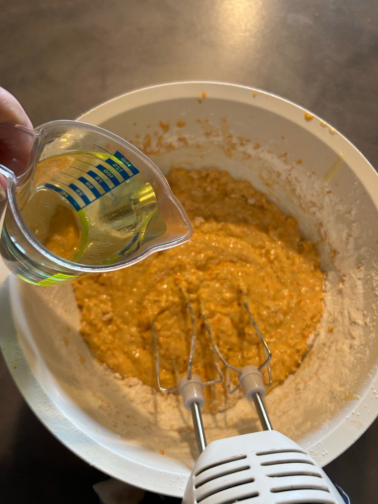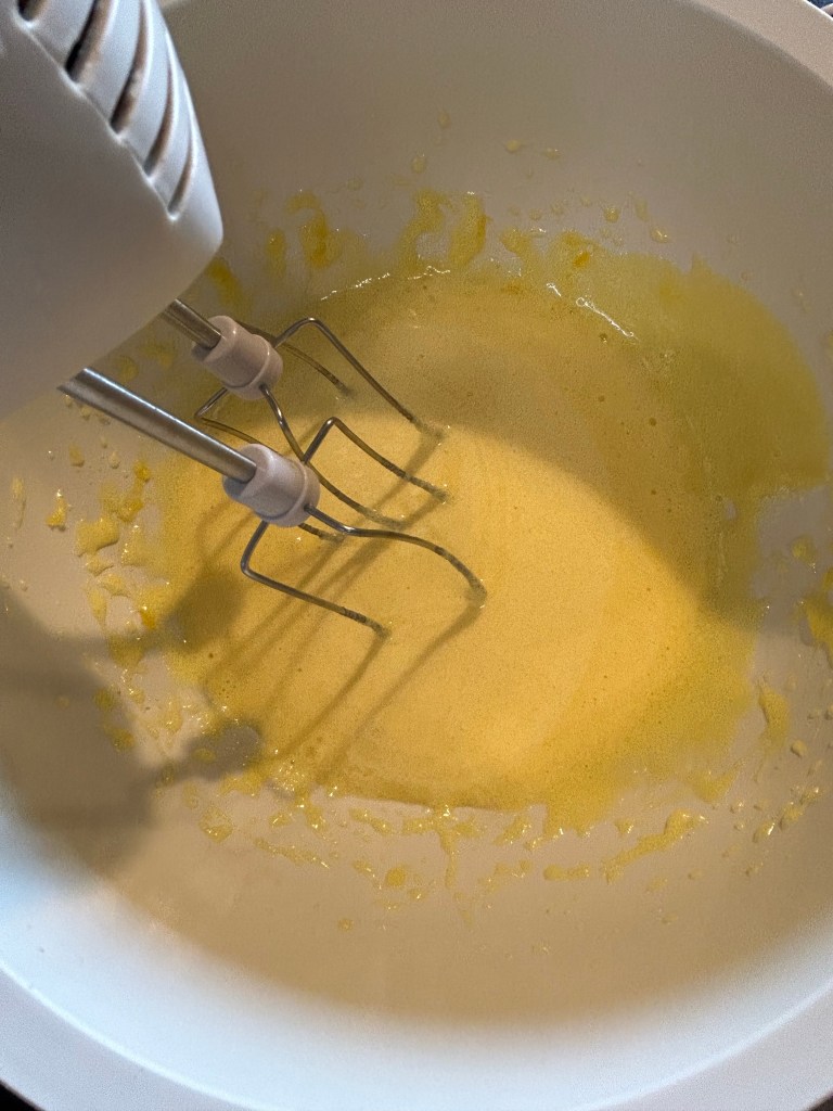 Monto con le fruste elettriche finché il composto diventa chiaro e ben spumoso, poi aggiungo a filo l’olio di semi