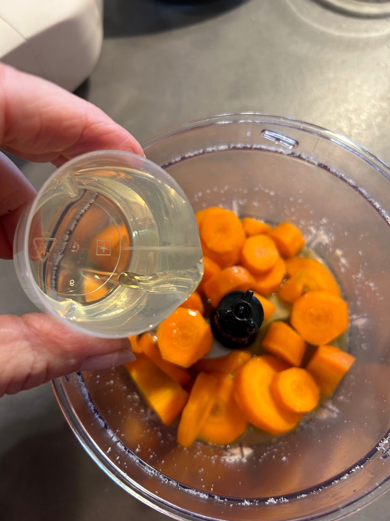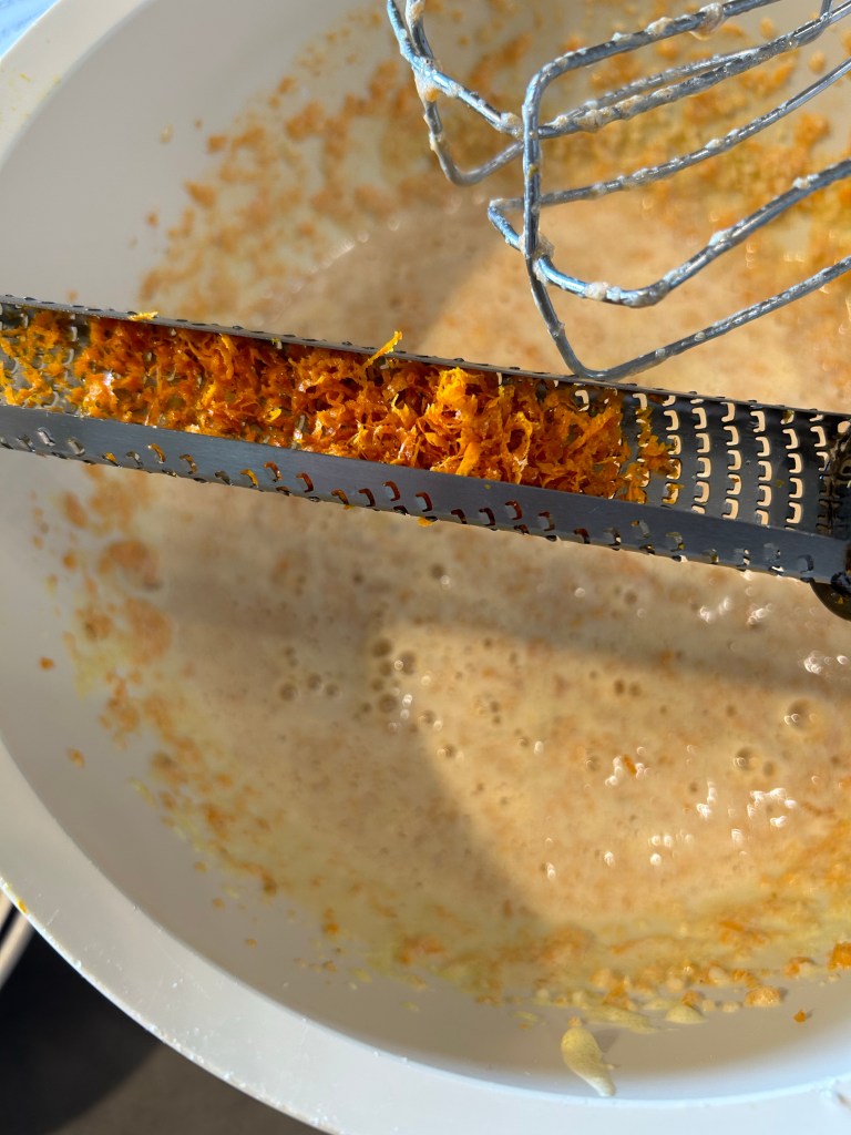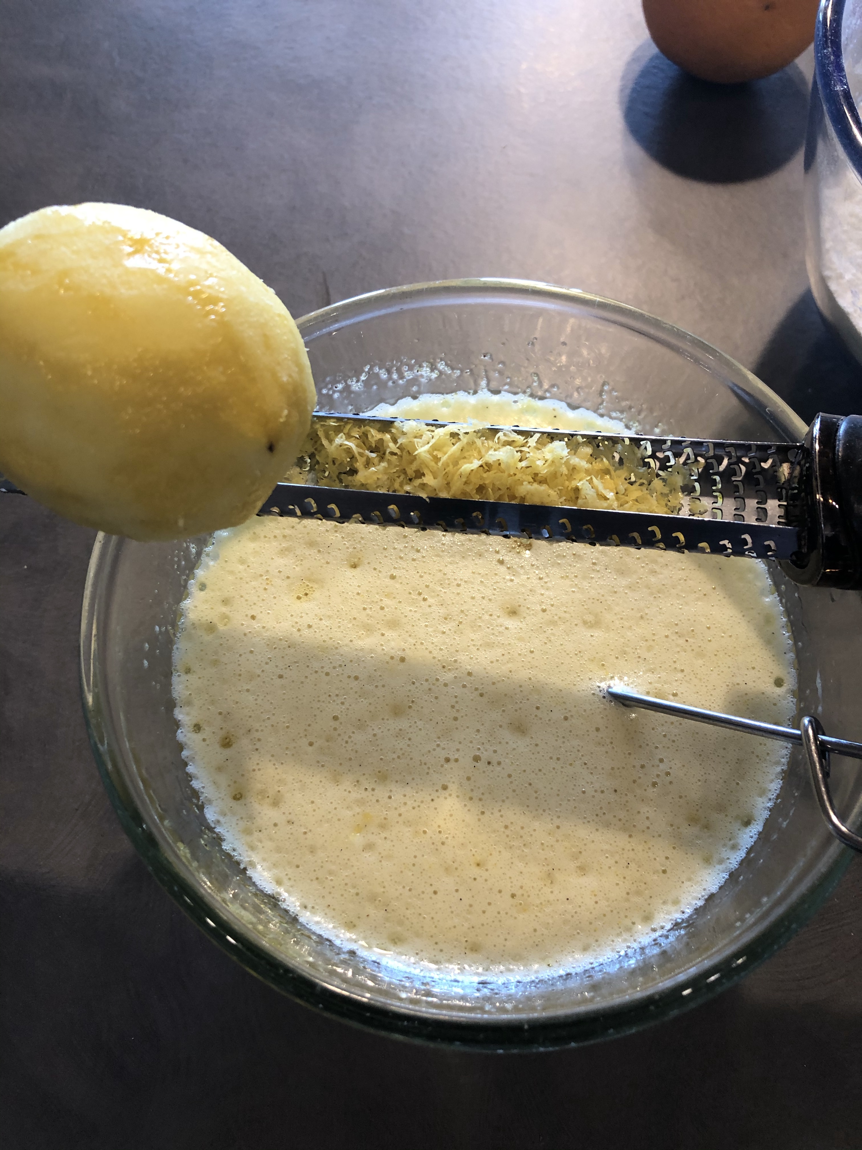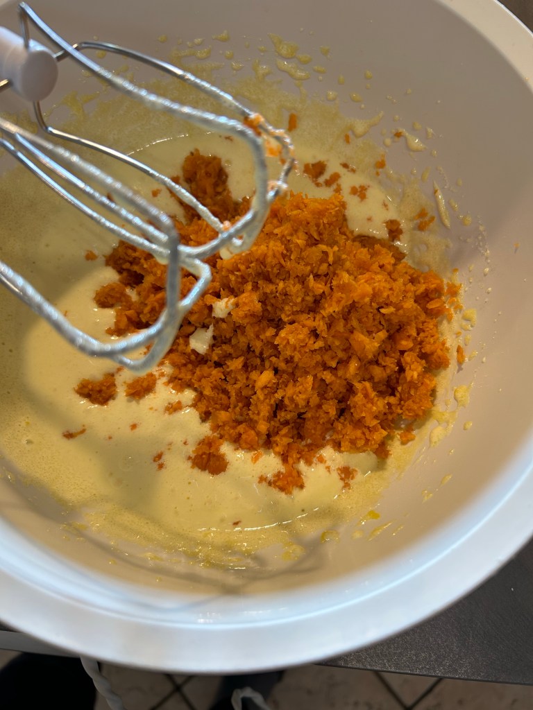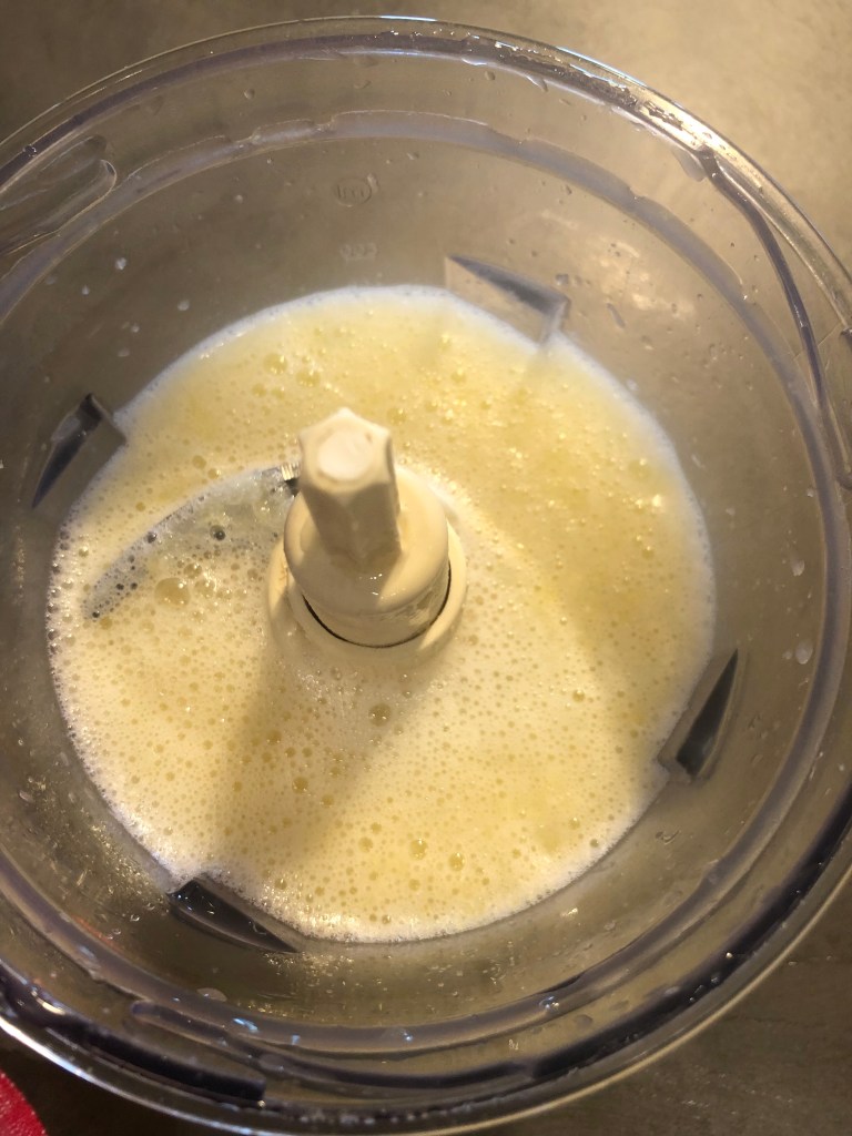 Monto con le fruste elettriche finché il composto diventa chiaro e ben spumoso, poi aggiungo a filo l’olio di semi