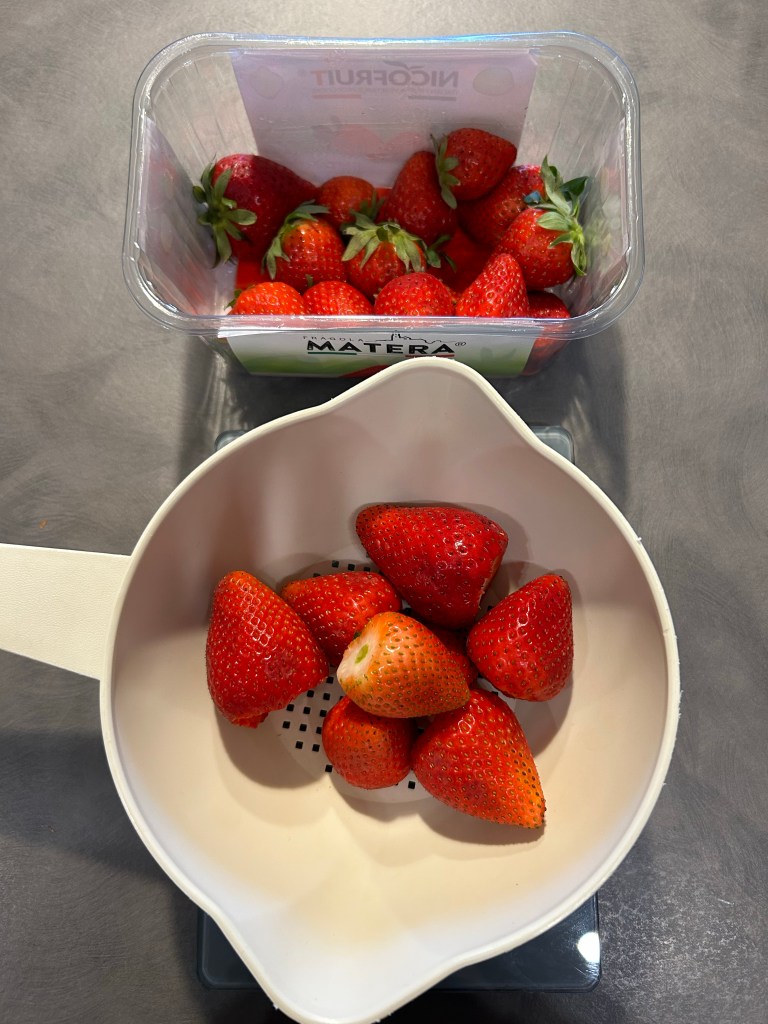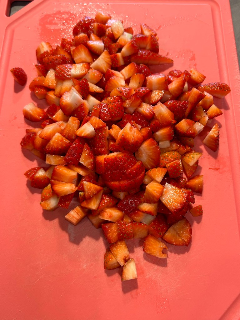 Ricopro con una parte dei cubetti di fragole, la metà circa
