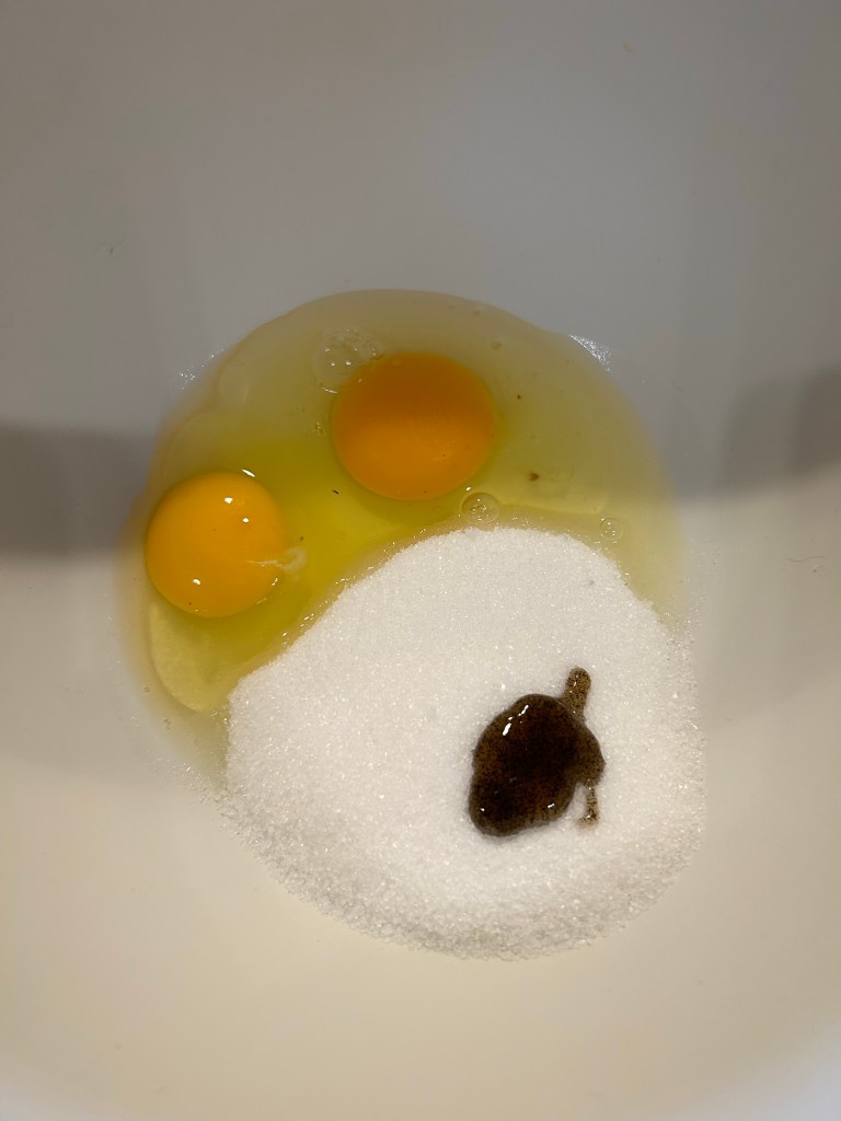 In una ciotola rompo le uova, aggiungo lo zucchero e l’estratto di vaniglia