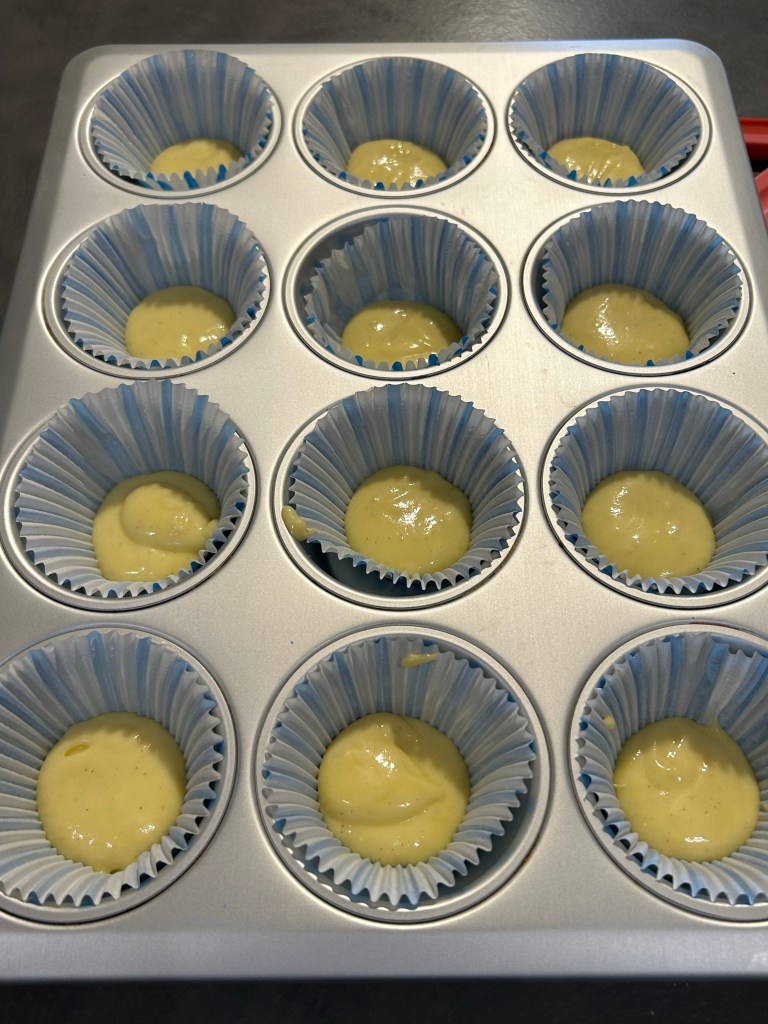 Prendo lo stampo di muffin e lo rivesto con i pirottini di carta e metto un cucchiaio di impasto i ogni pirottini