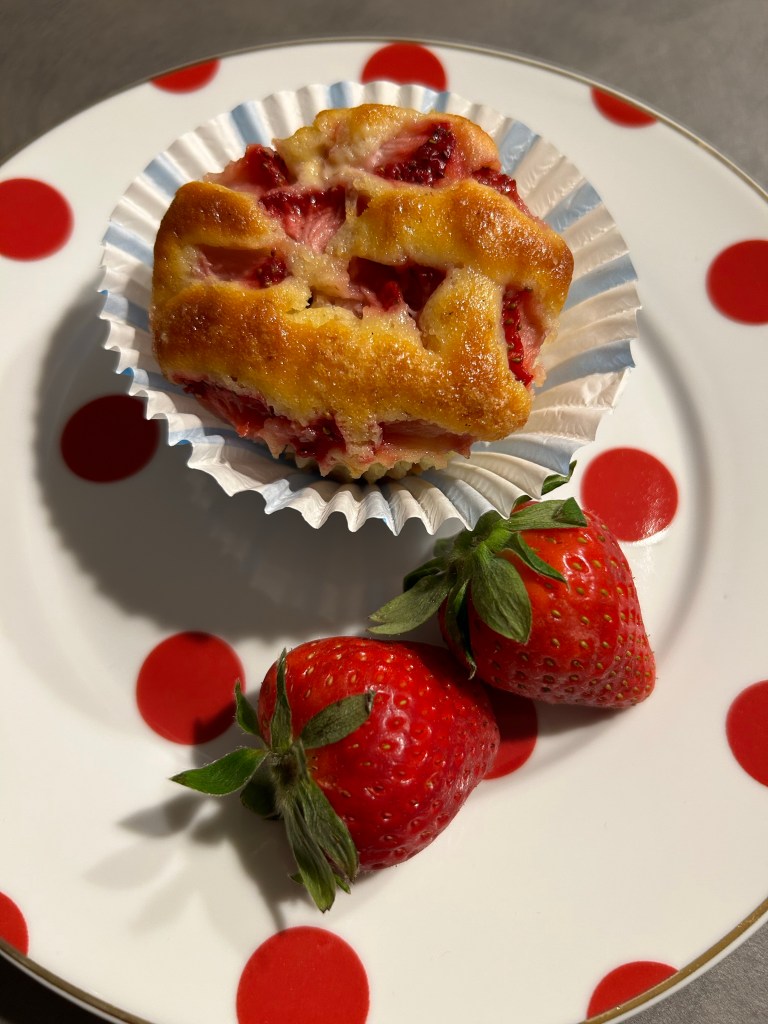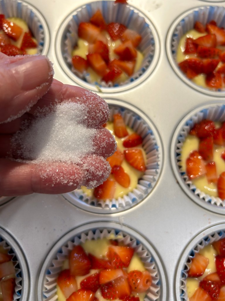 Suddivido l’impasto rimasto in ogni pirottino e aggiungo il resto delle fragole