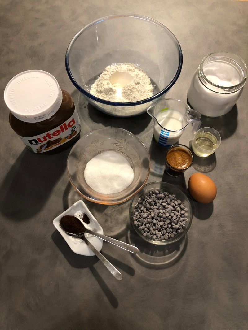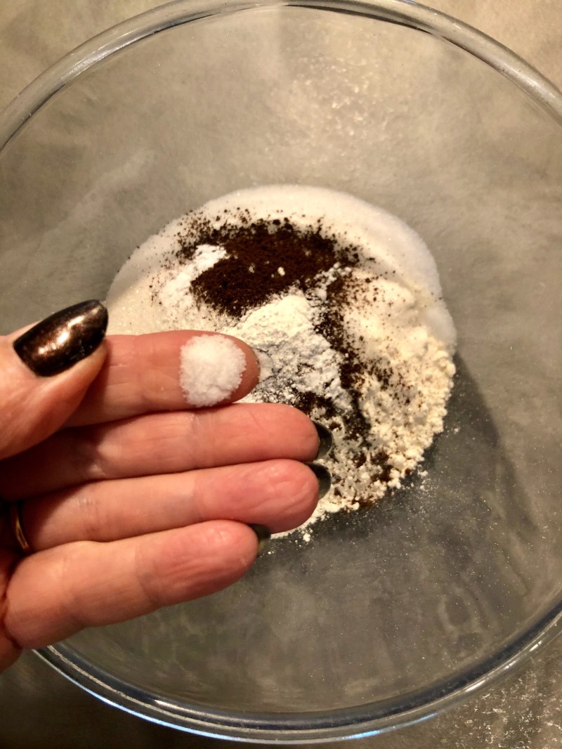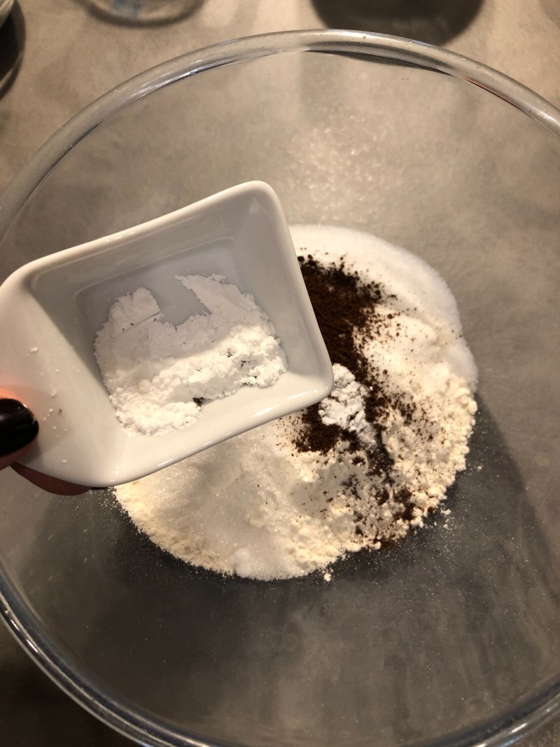 In una ciotola verso tutte le polveri, farina, zucchero, bicarbonato, caffè solubile e lievito