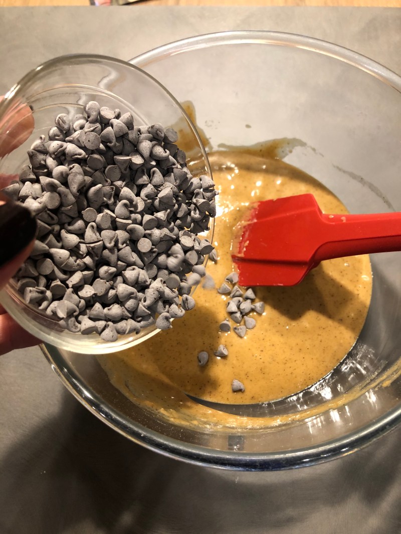 Per ultimo le gocce di cioccolato e mescolo con la spatola