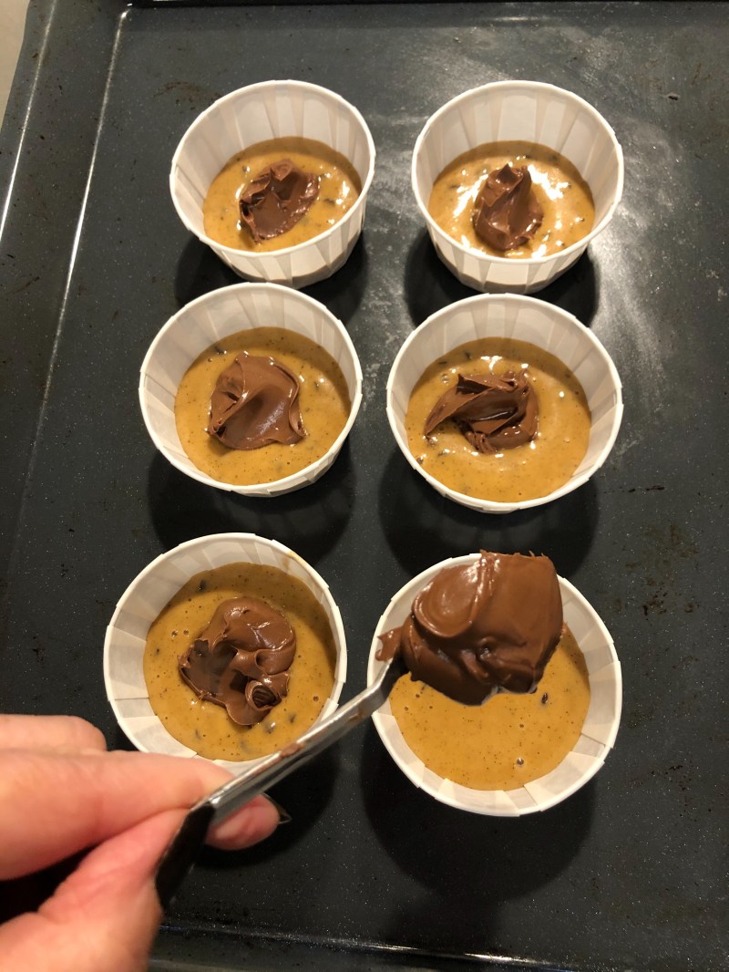 In uno stampo da muffin sistemo dei pirottini di carta verso un cucchiaio di impasto, al centro metto un cucchiaino abbondante di nutella