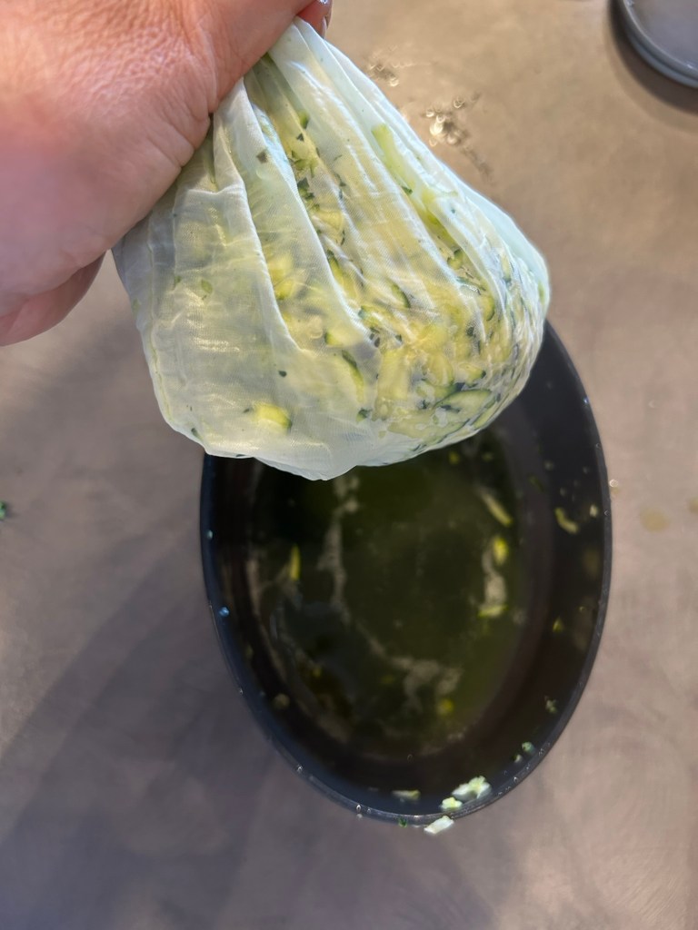 Metto le zucchine in un sacchetto per alimenti e strizzo molto bene per eliminare l’acqua di vegetazione