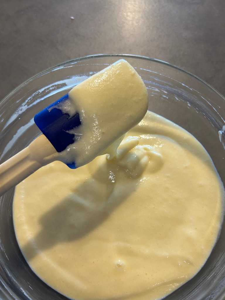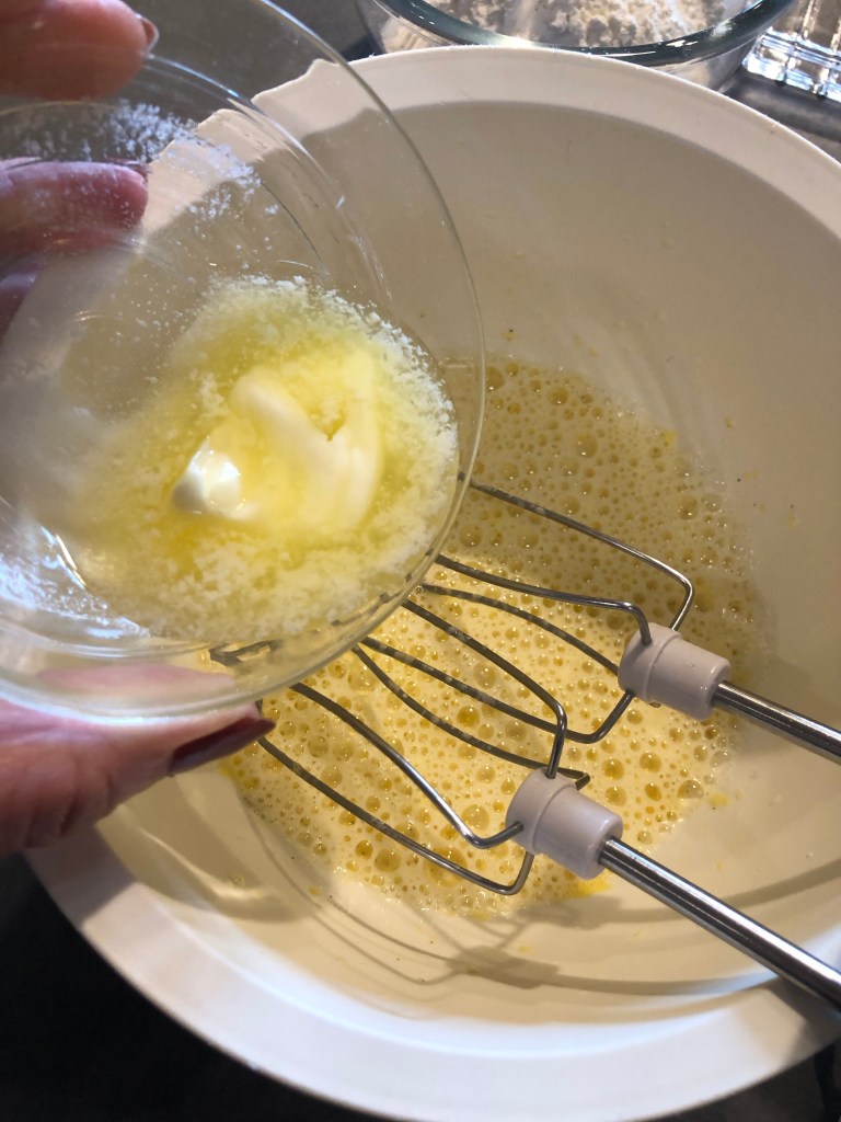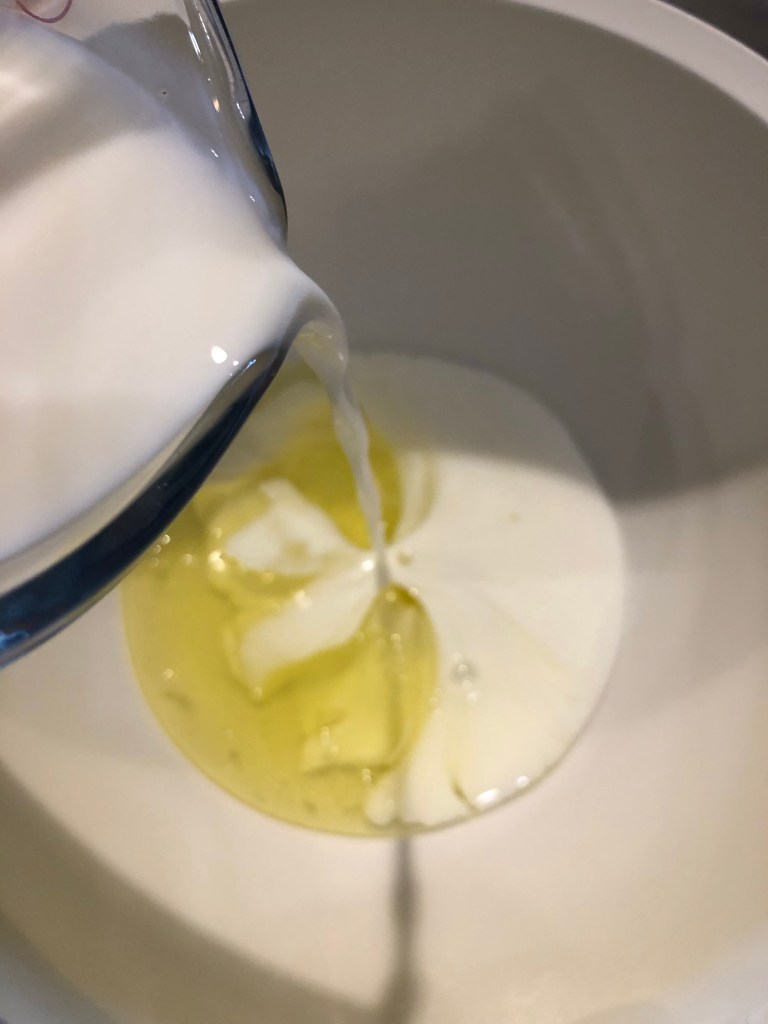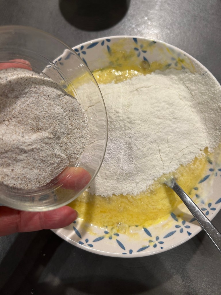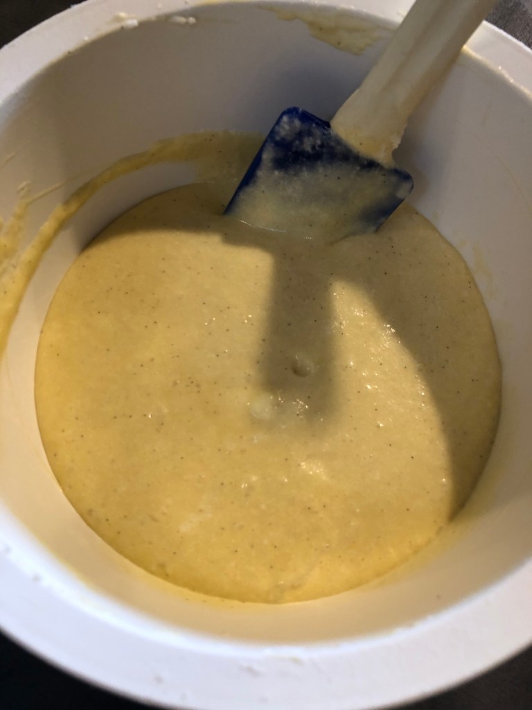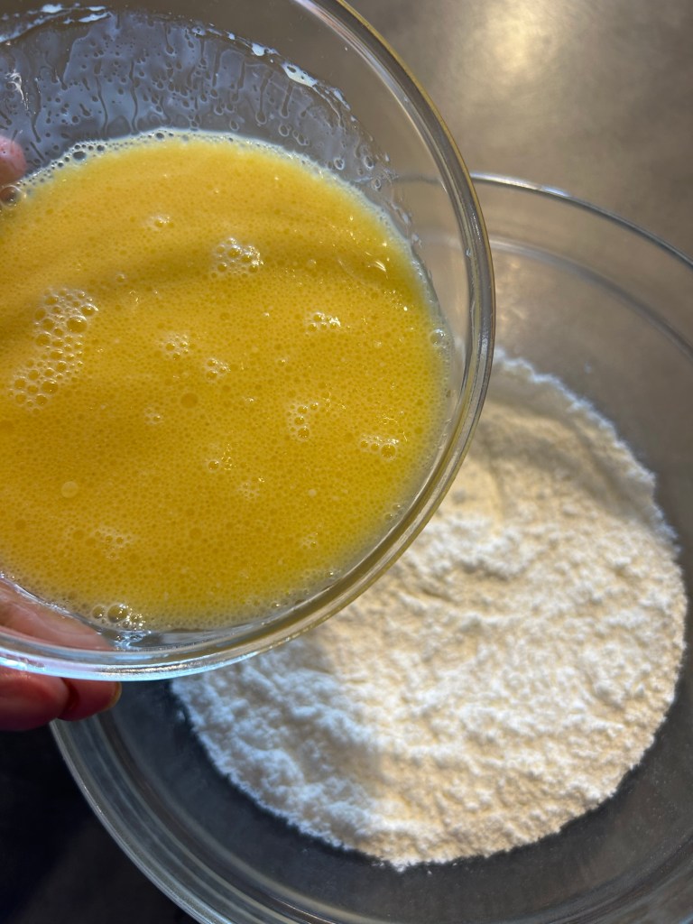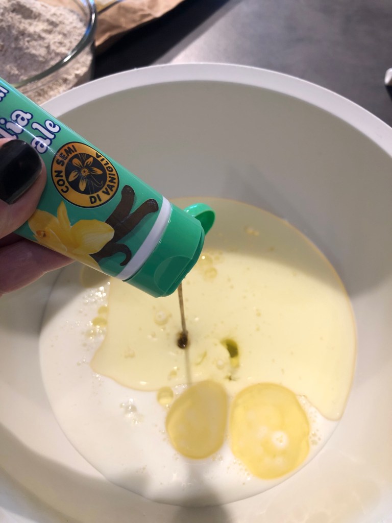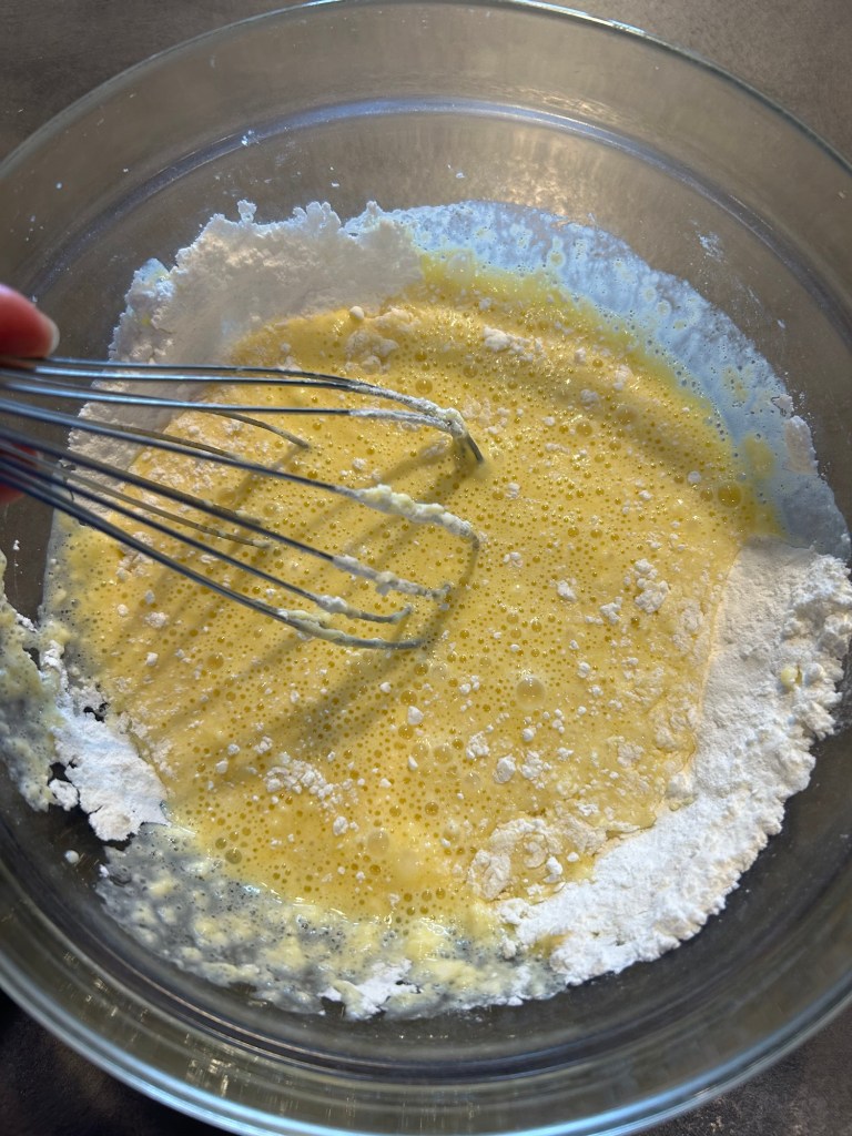 Mescolo con una frusta, a mano va benissimo, deve risultare una pastella morbida non occorre lavorare troppo