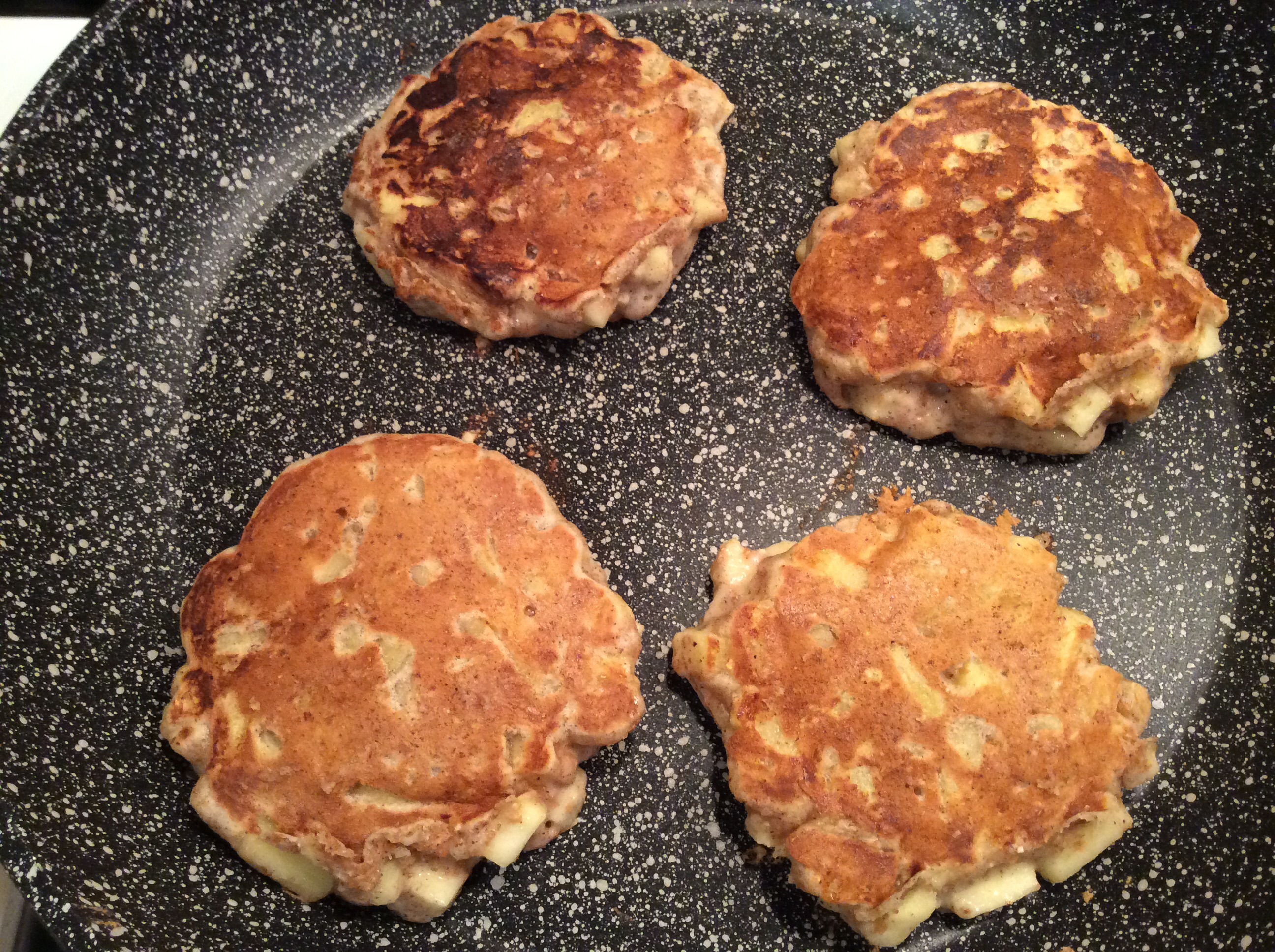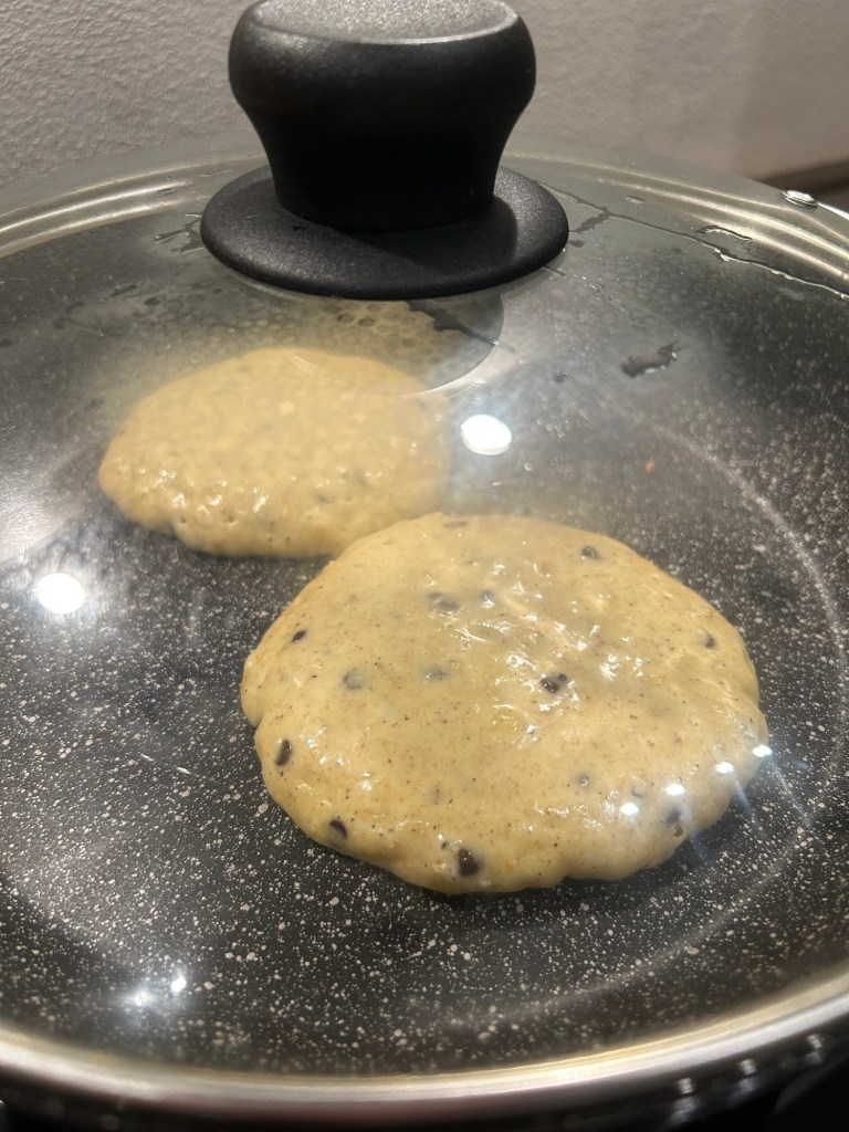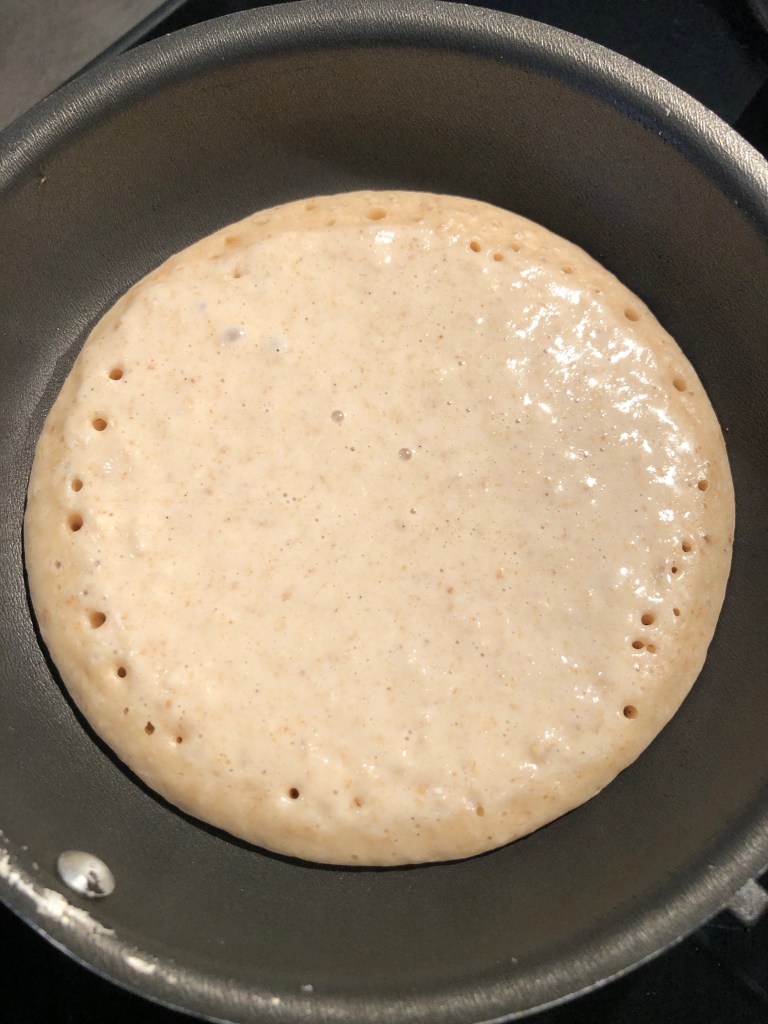Ungo con pochissimo olio una padella antiaderente verso un mestolo di impasto e copro, cuocio per 2 minuti finché si formano sui pancake delle bollicine