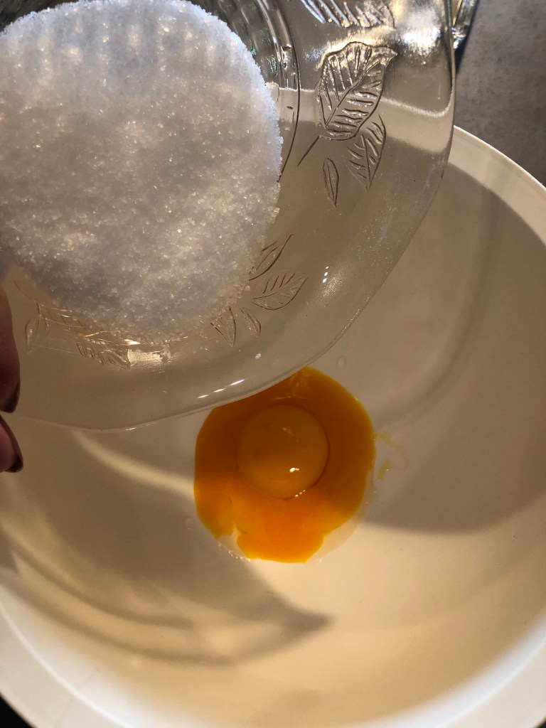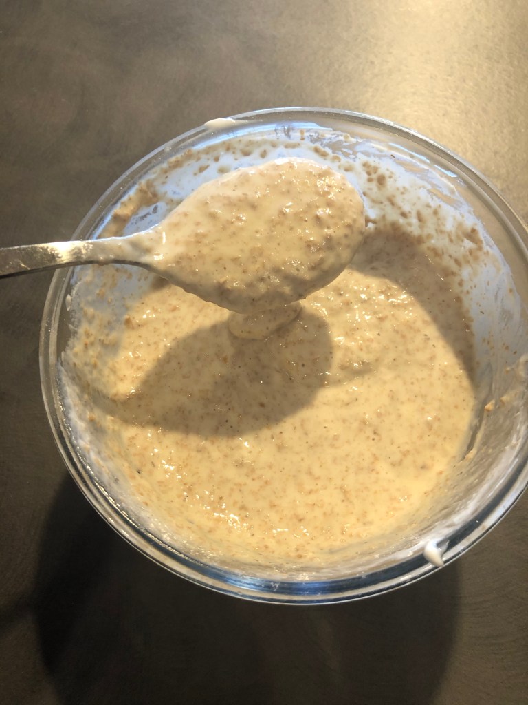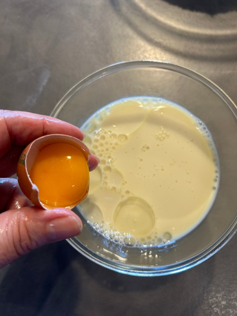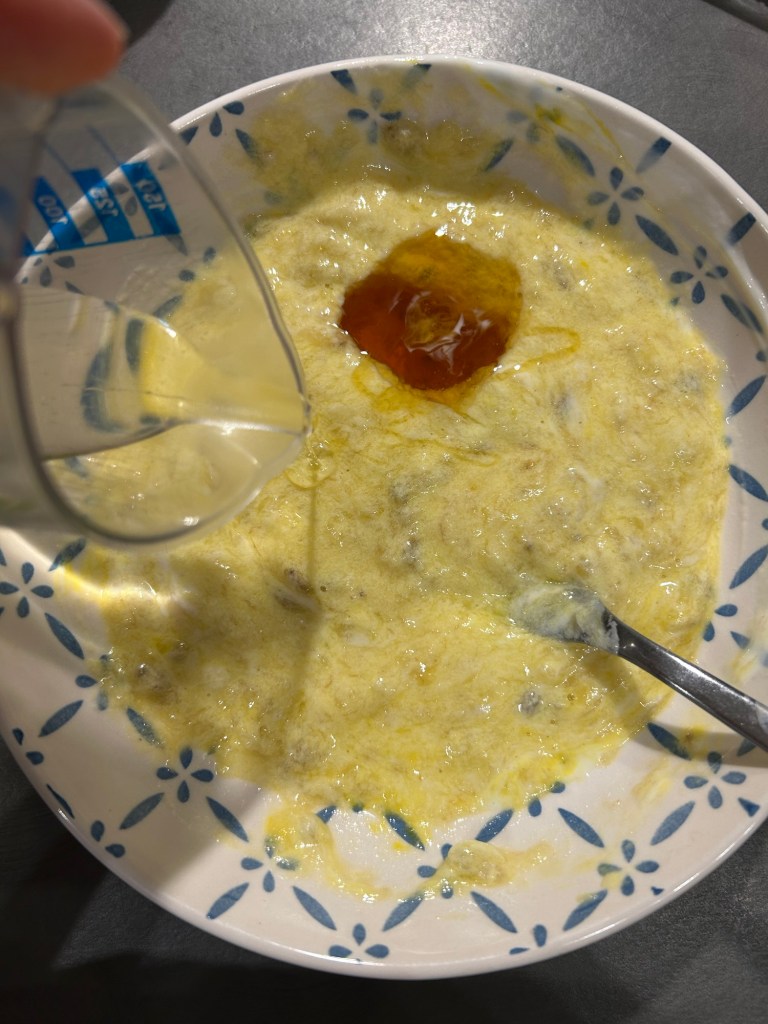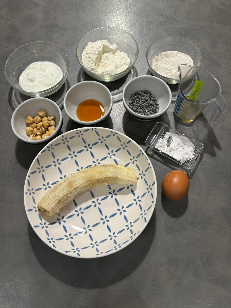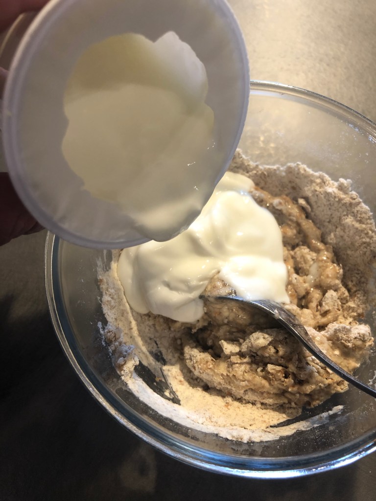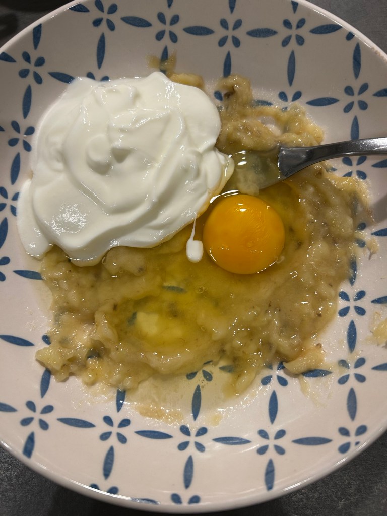 Schiaccio la banana con la forchetta, aggiungo l’uovo e lo yogurt