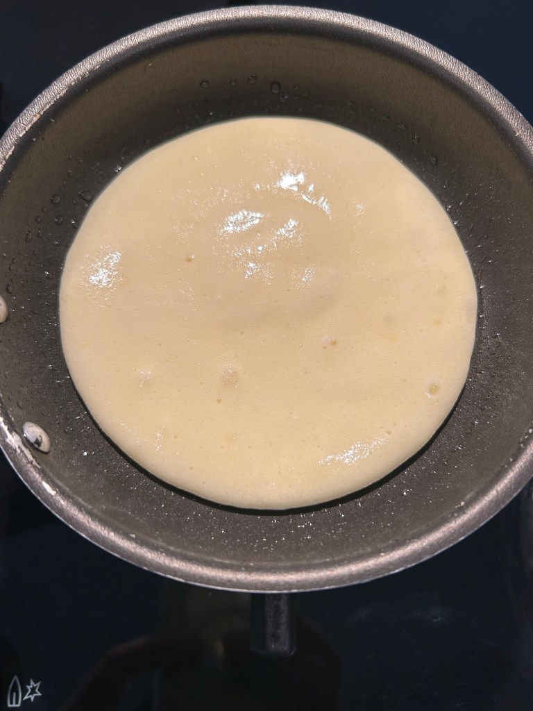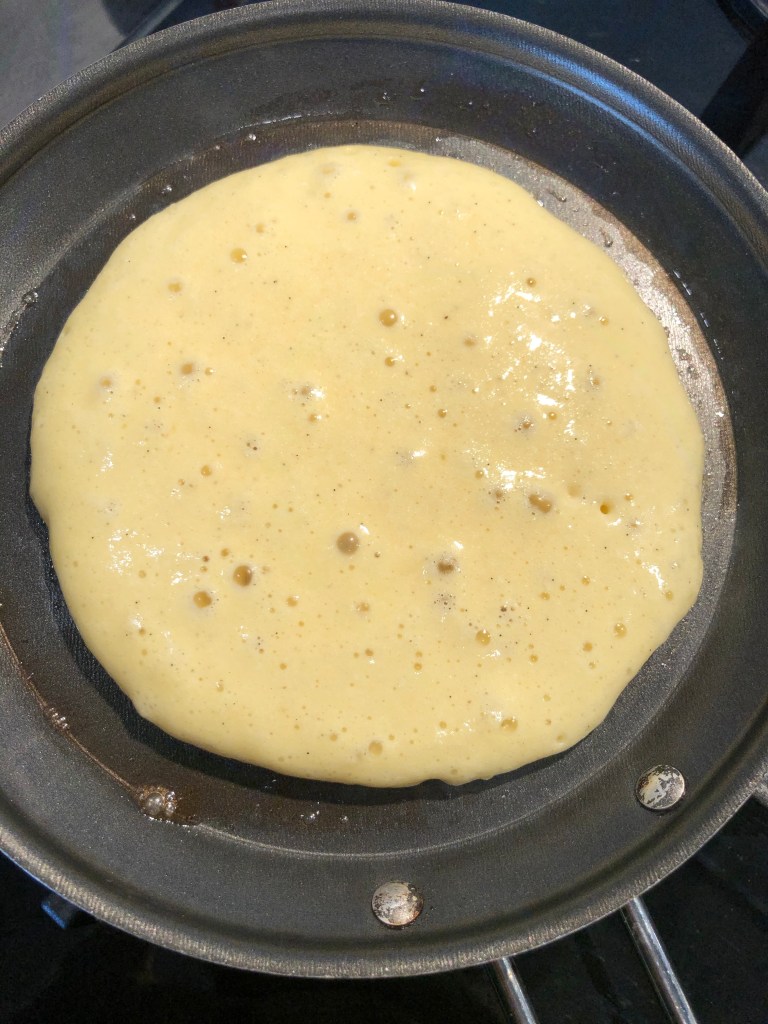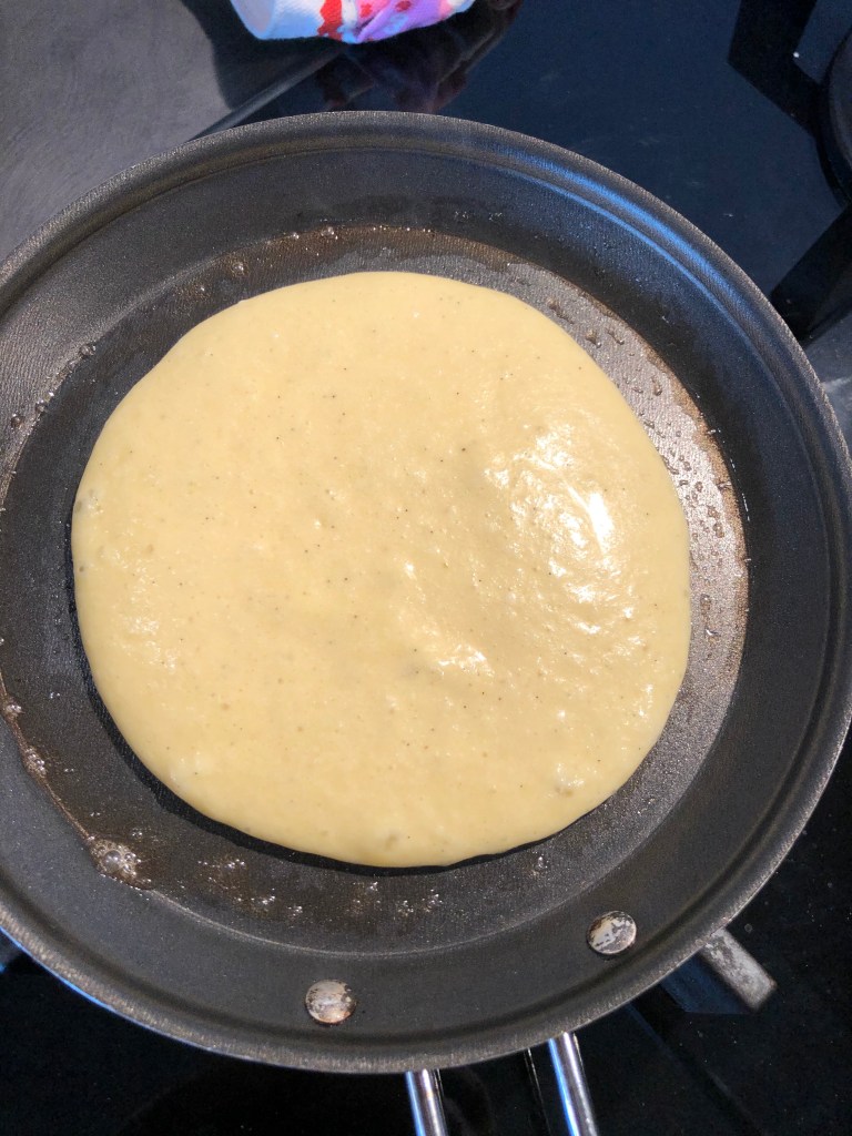 Lascio riposare l”impasto per 5 minuti poi scaldo una padella antiaderente e ne verso un mestolo al centro