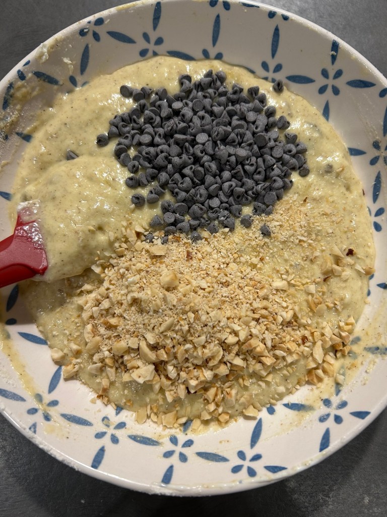 Mescolo e aggiungo le gocce di cioccolato e le nocciole tritate