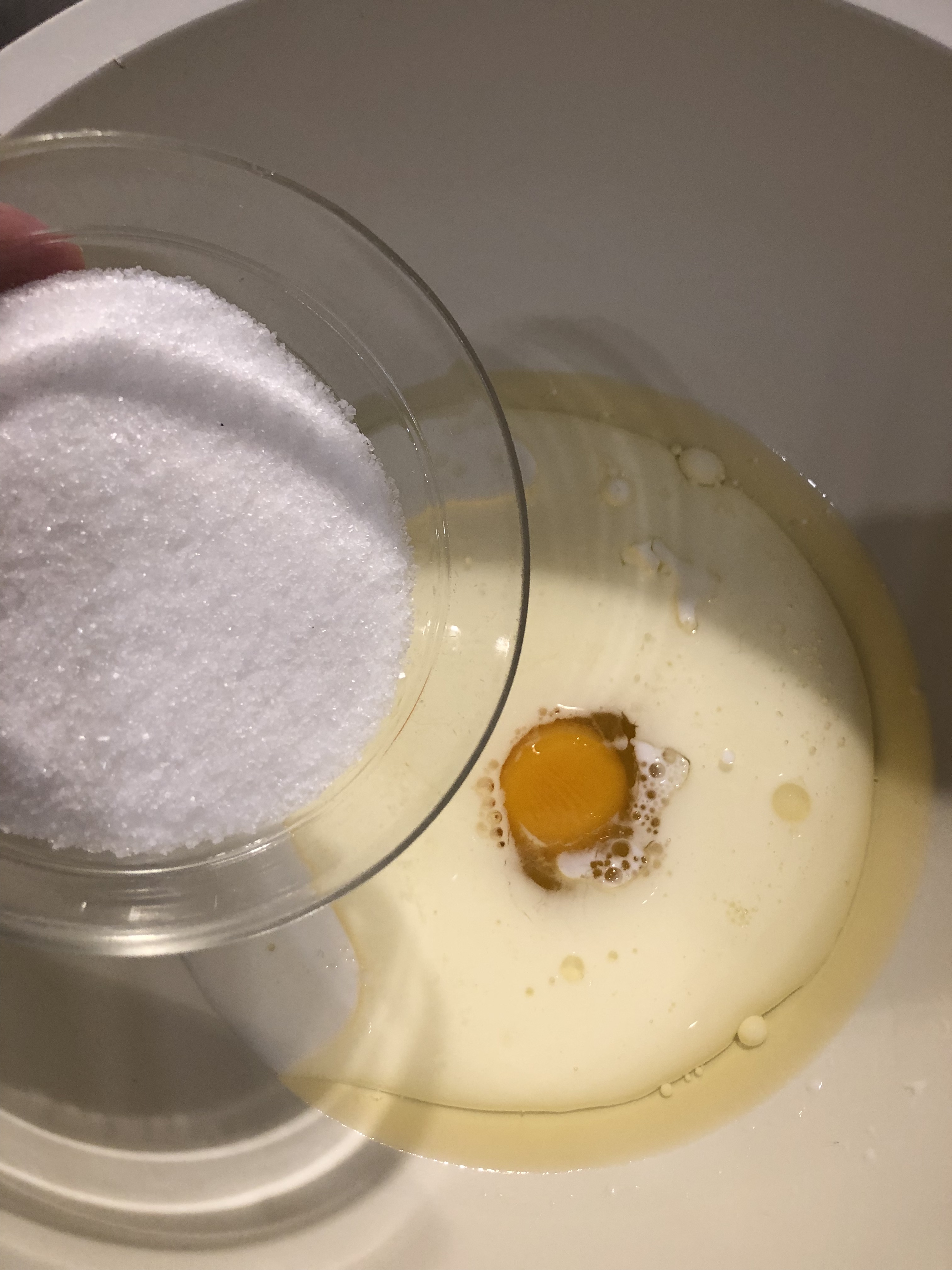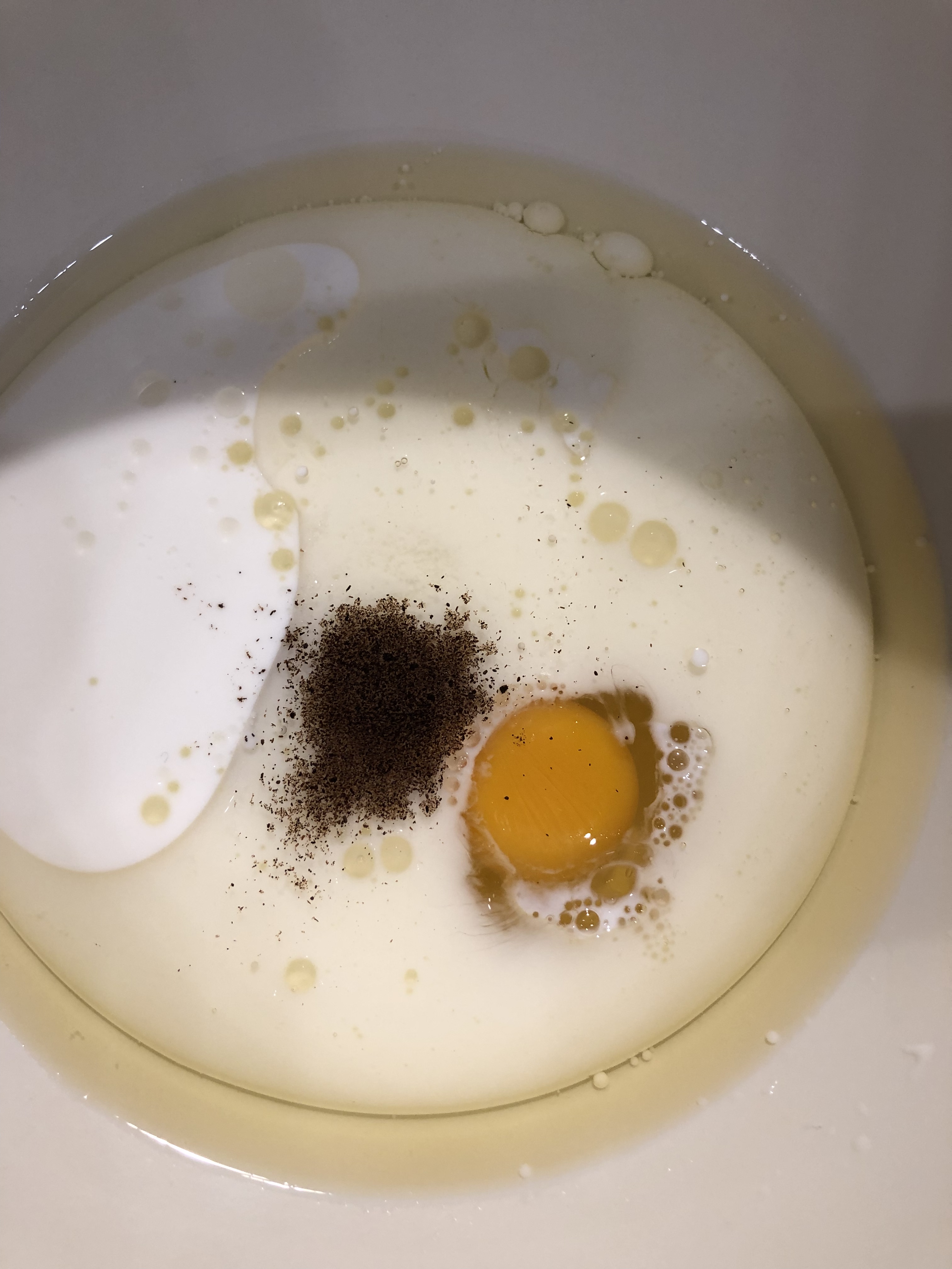 Schiaccio la banana con la forchetta, aggiungo l’uovo e lo yogurt