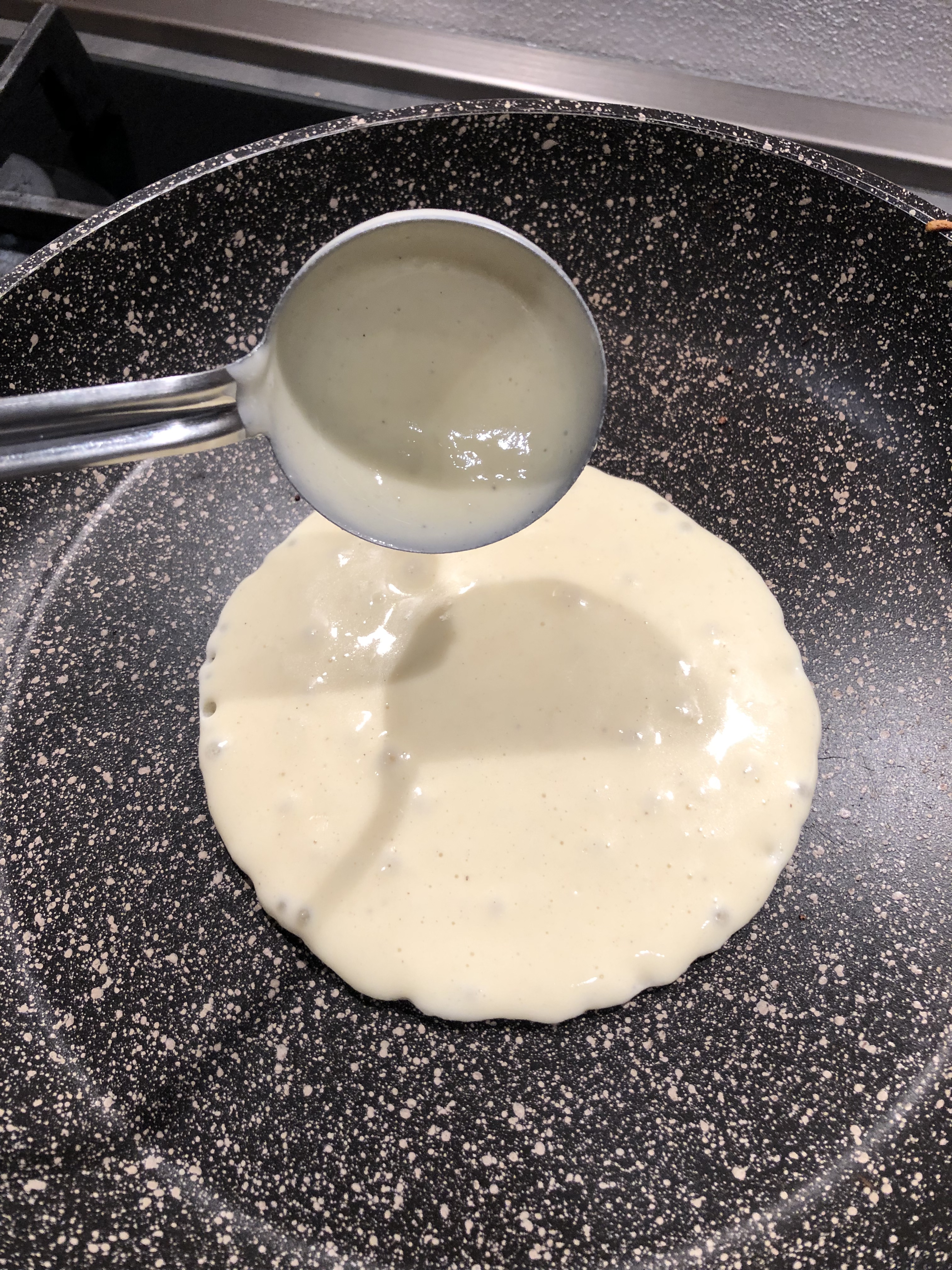 Lascio riposare l”impasto per 5 minuti poi scaldo una padella antiaderente e ne verso un mestolo al centro