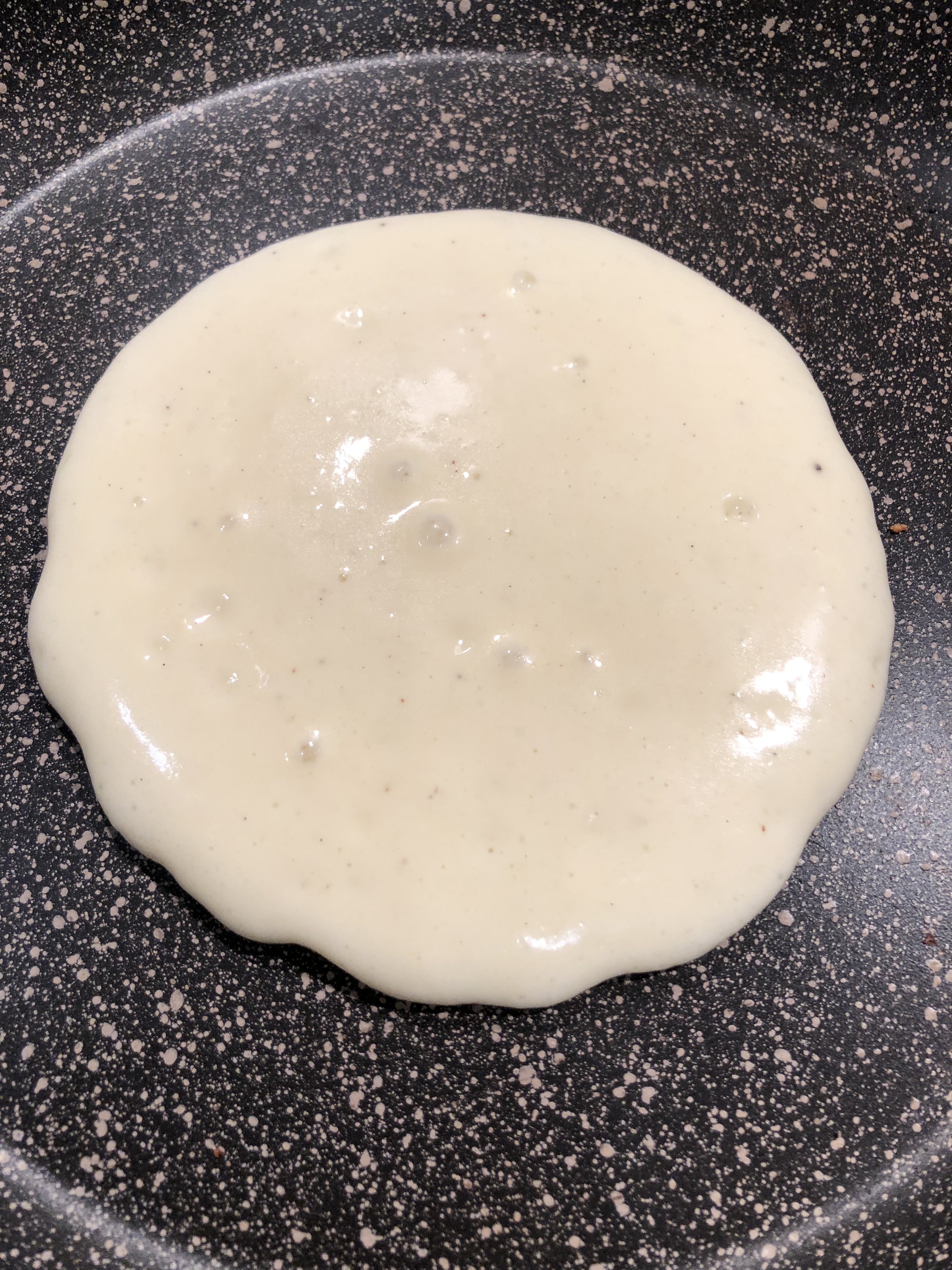 Ungo con pochissimo olio una padella antiaderente verso un mestolo di impasto e copro, cuocio per 2 minuti finché si formano sui pancake delle bollicine