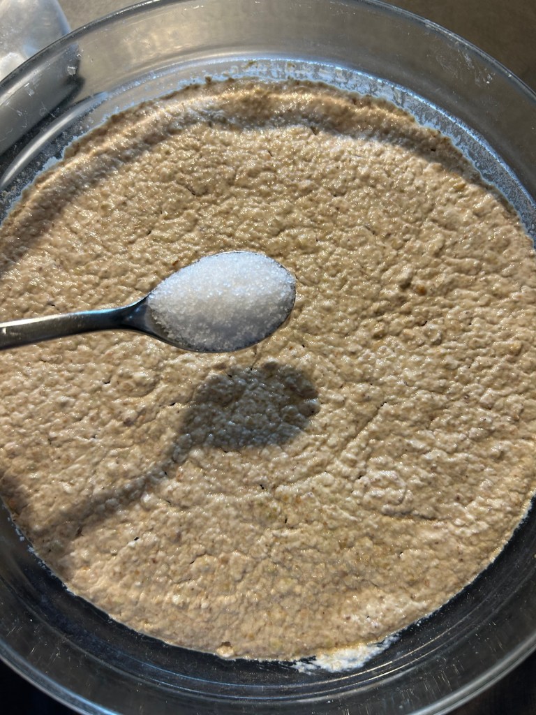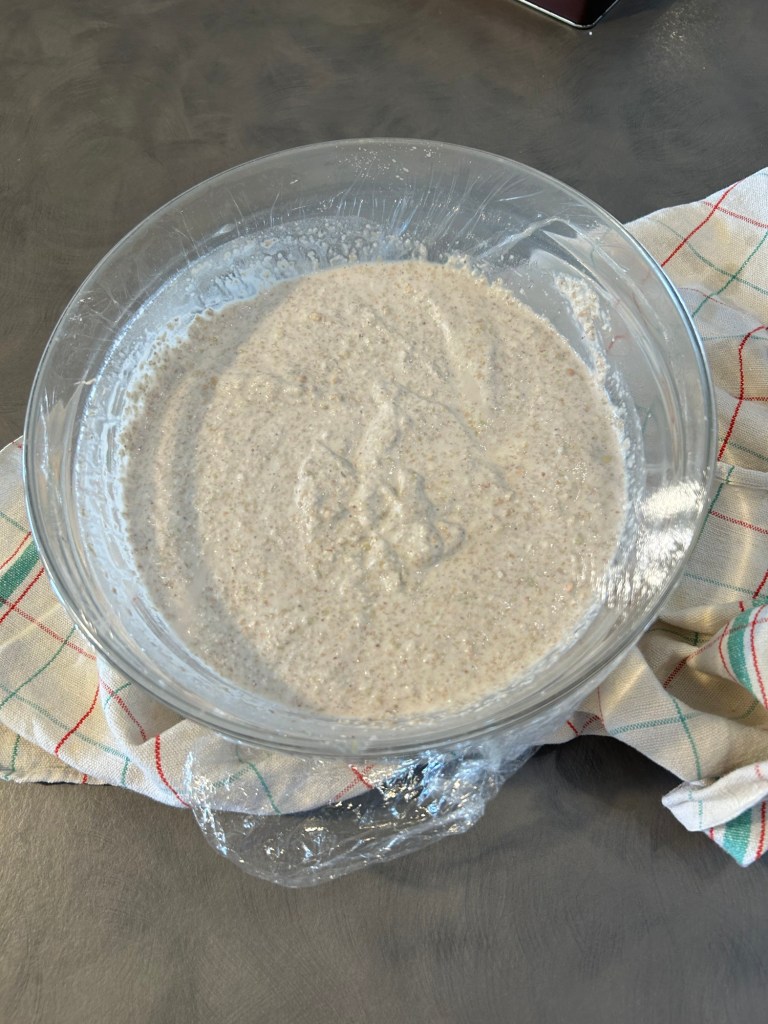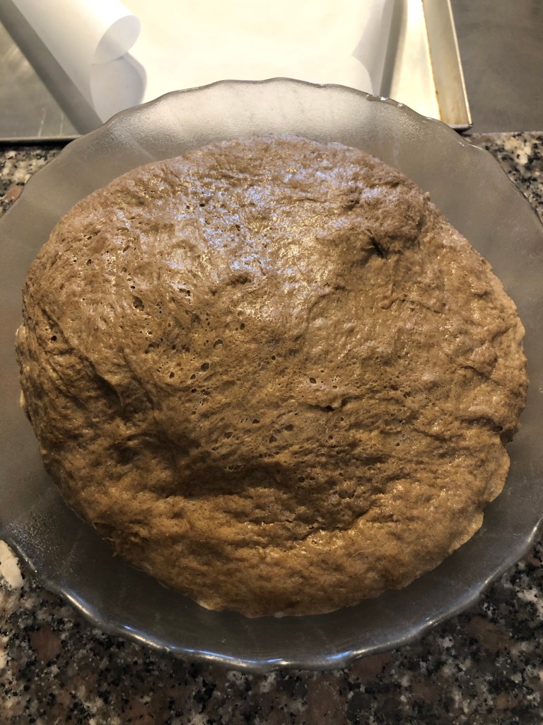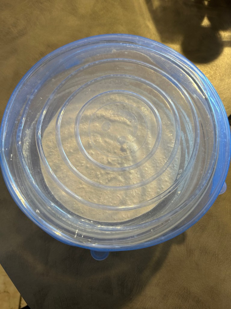 Lascio fermentare ancora 12 ore, se é un ambiente freddo potete accendere la luce del forno, se non lo fosse allungate i tempi, deve gonfiare e formare delle bollicine