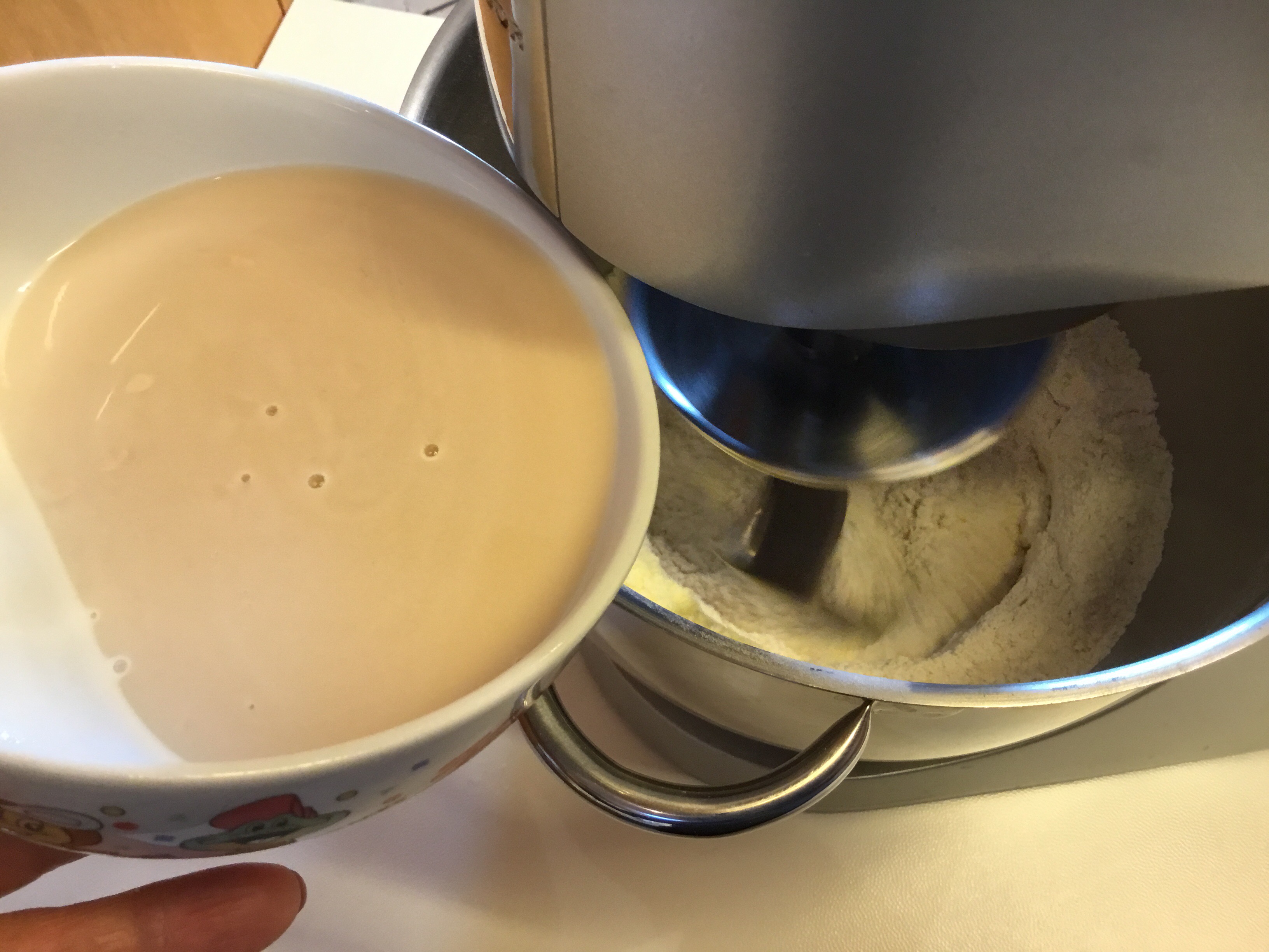 Aggiungo 550 gr di infuso e inizio ad impastare con il gancio