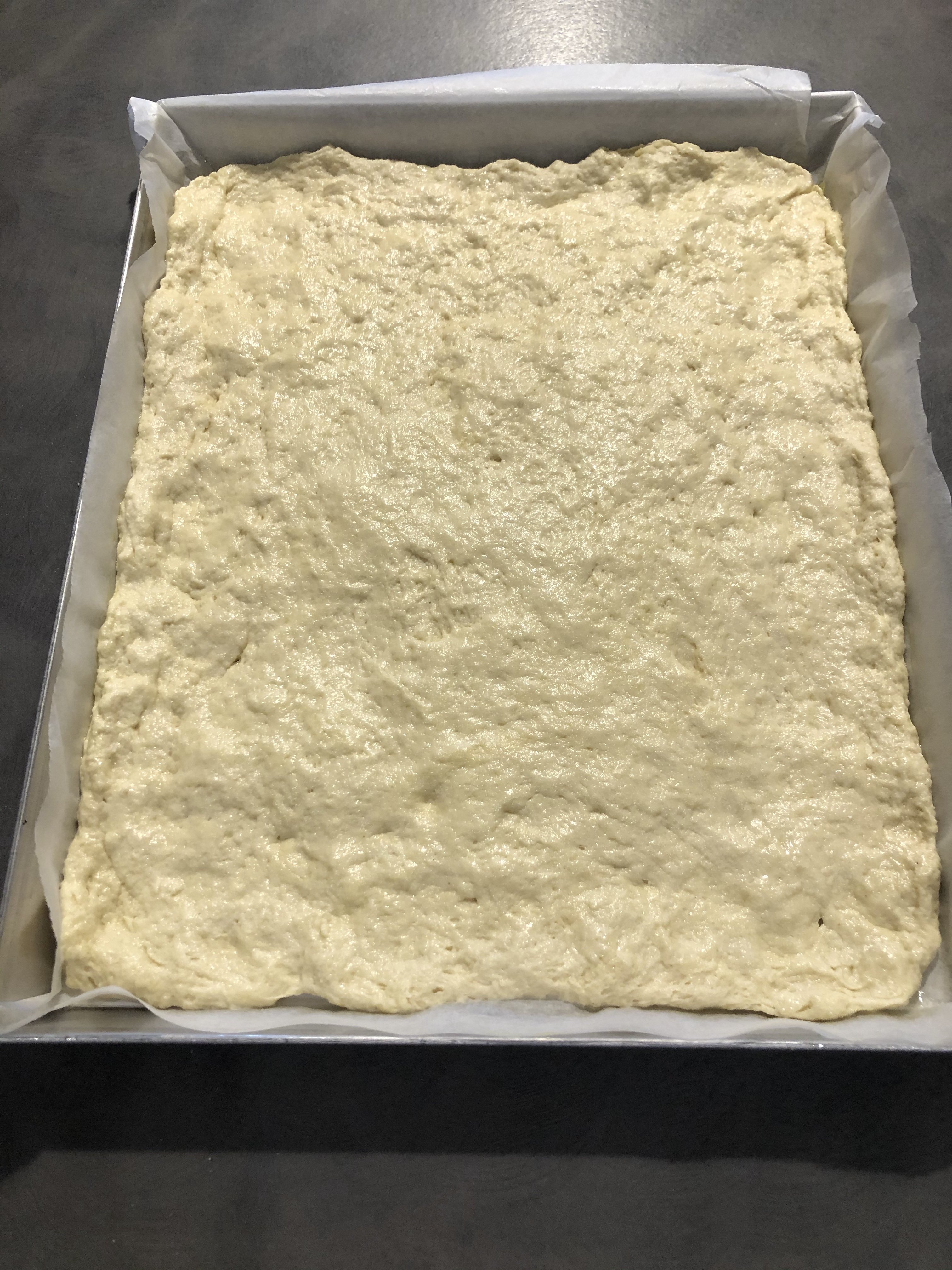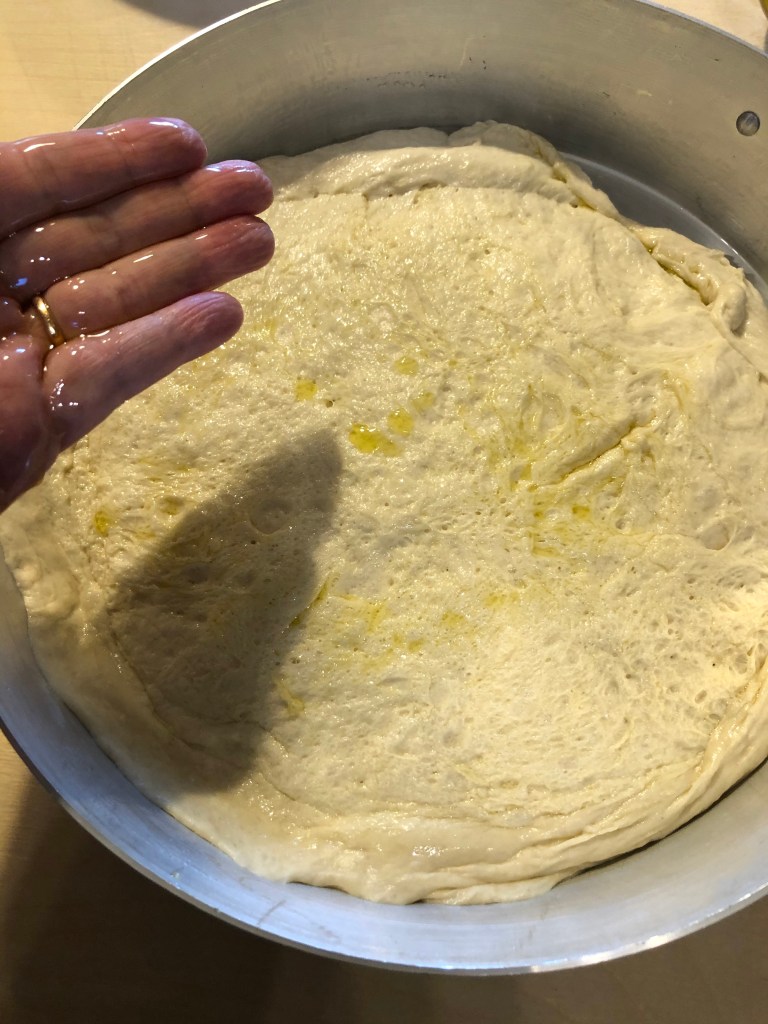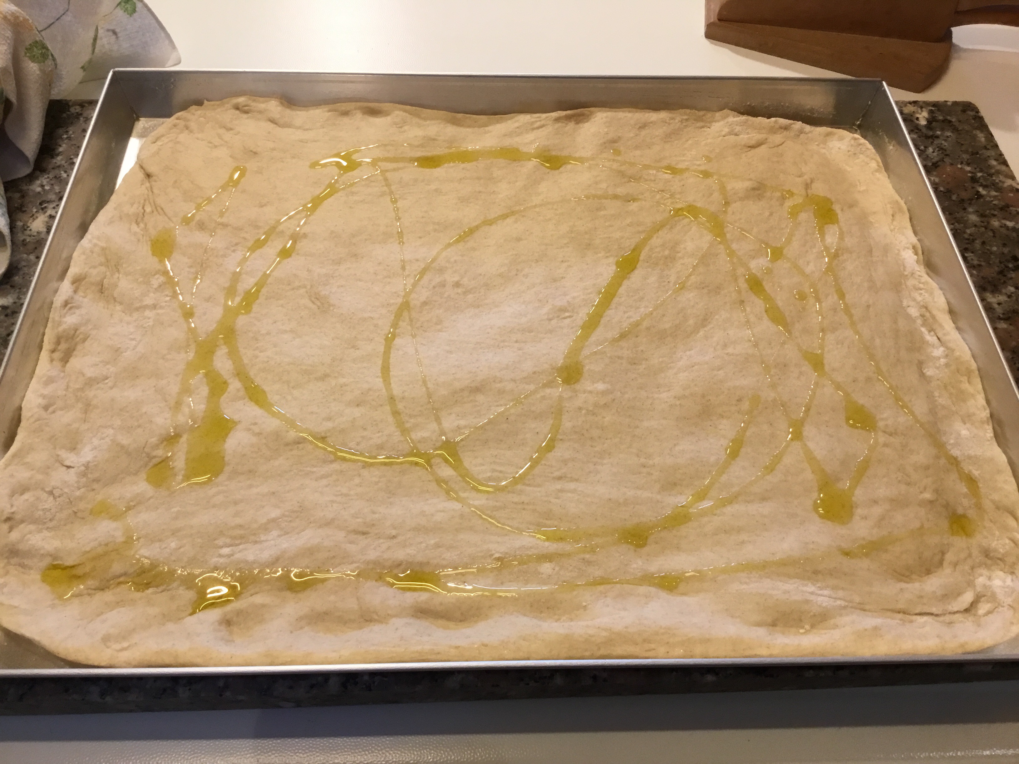 Trascorso il tempo ungo con un velo di burro la teglia, appoggio l’impasto e lo allargo con le mani