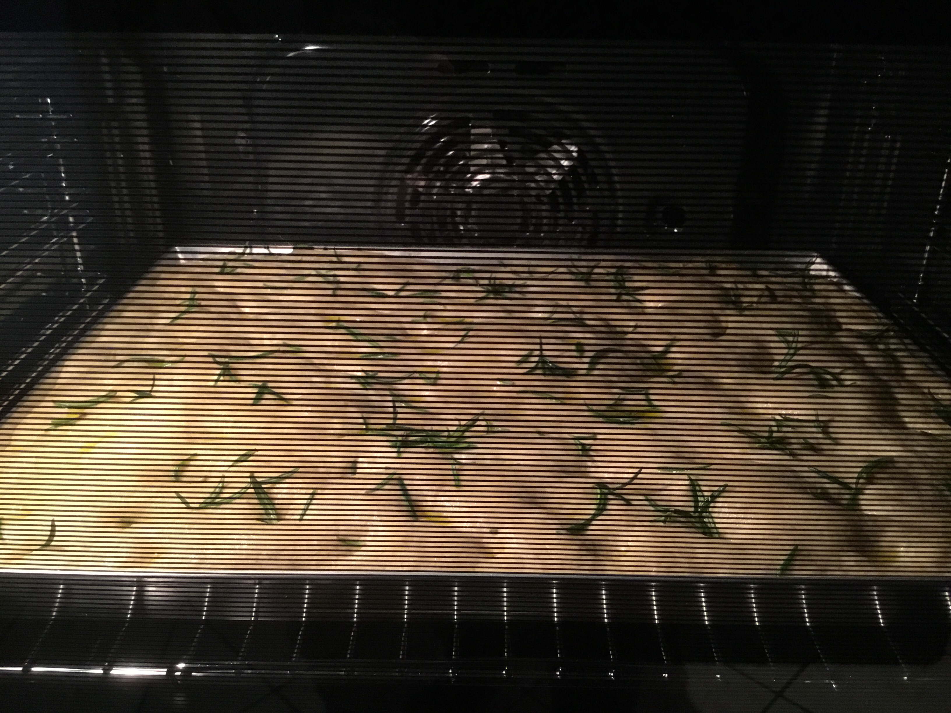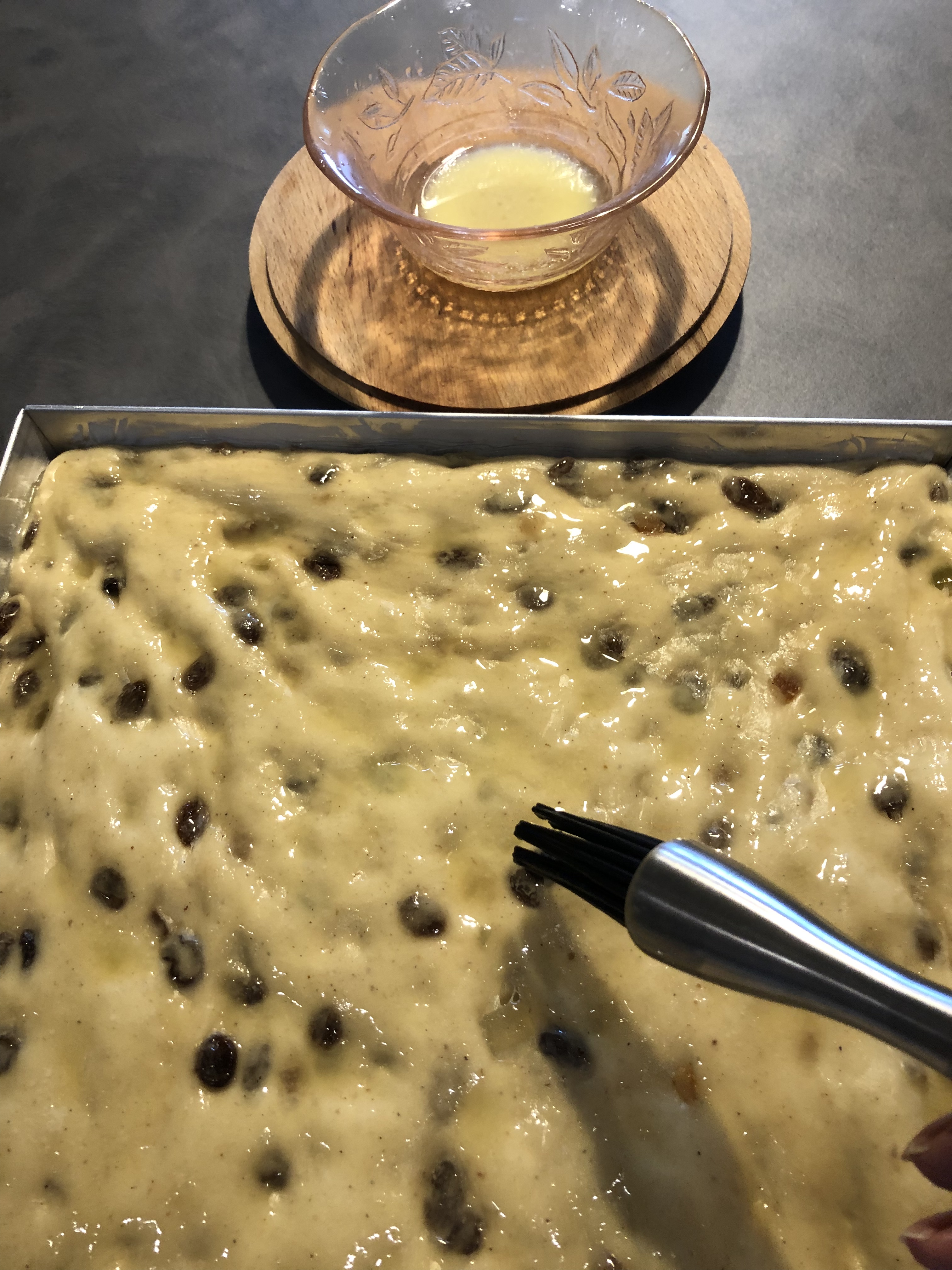 Ricopro la teglia con la pellicola e la metto nuovamente in forno spento con la luce accesa per circa 2 ore, vedrete che l’impasto si gonfierà, a questo punto tolgo la pellicola, spennello delicatamente con il burro fuso