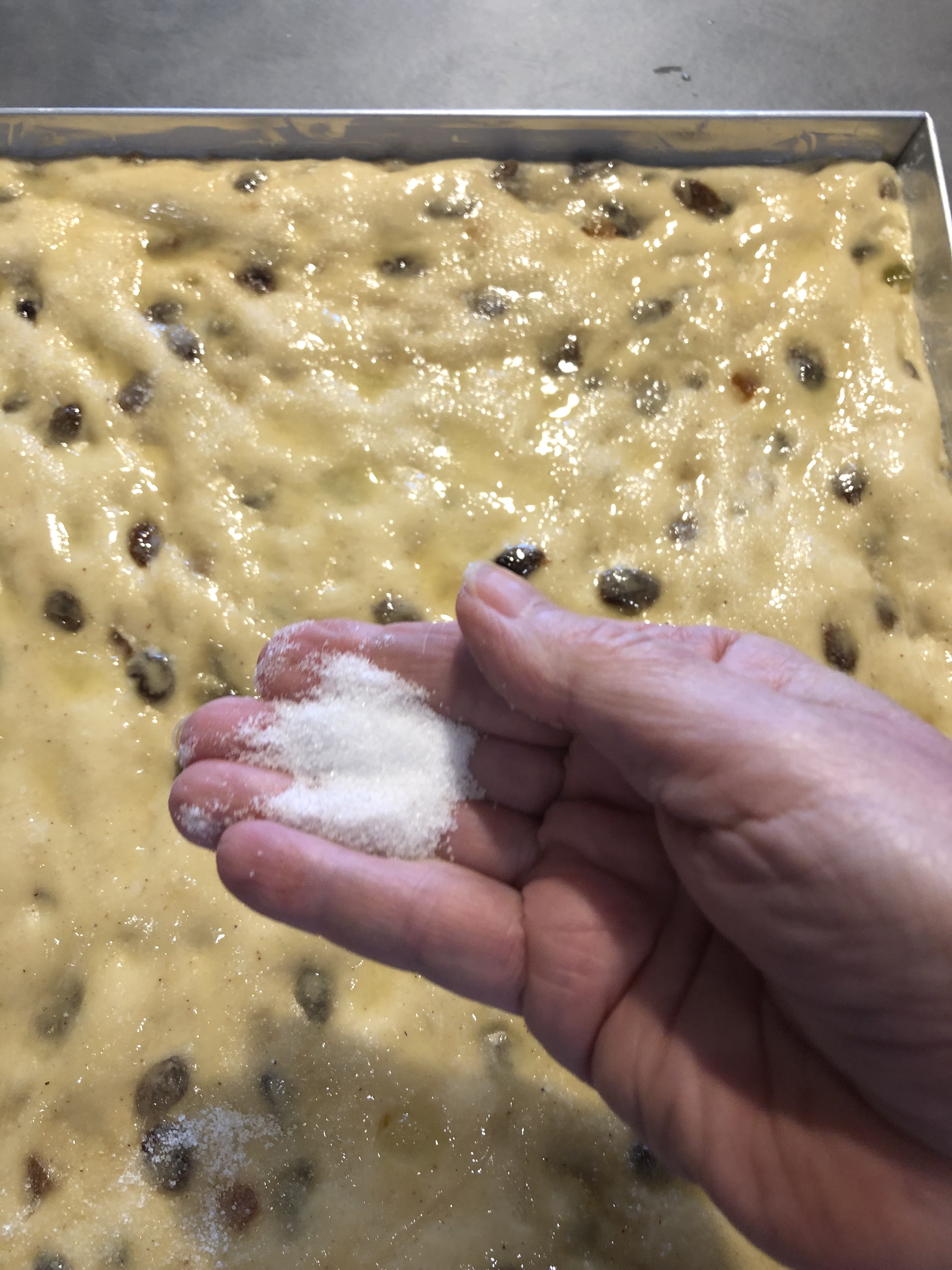 Spolverizzo tutta la superficie con abbondante zucchero, semolato o di canna come preferite