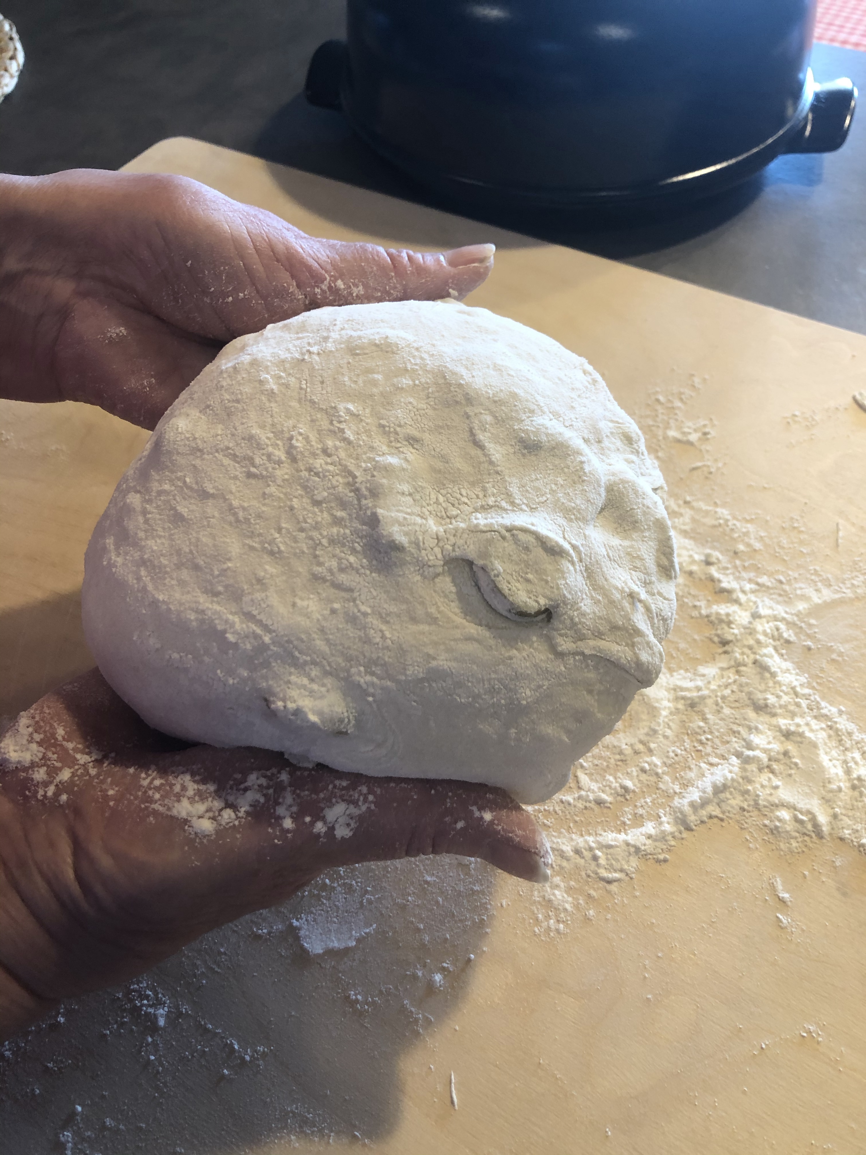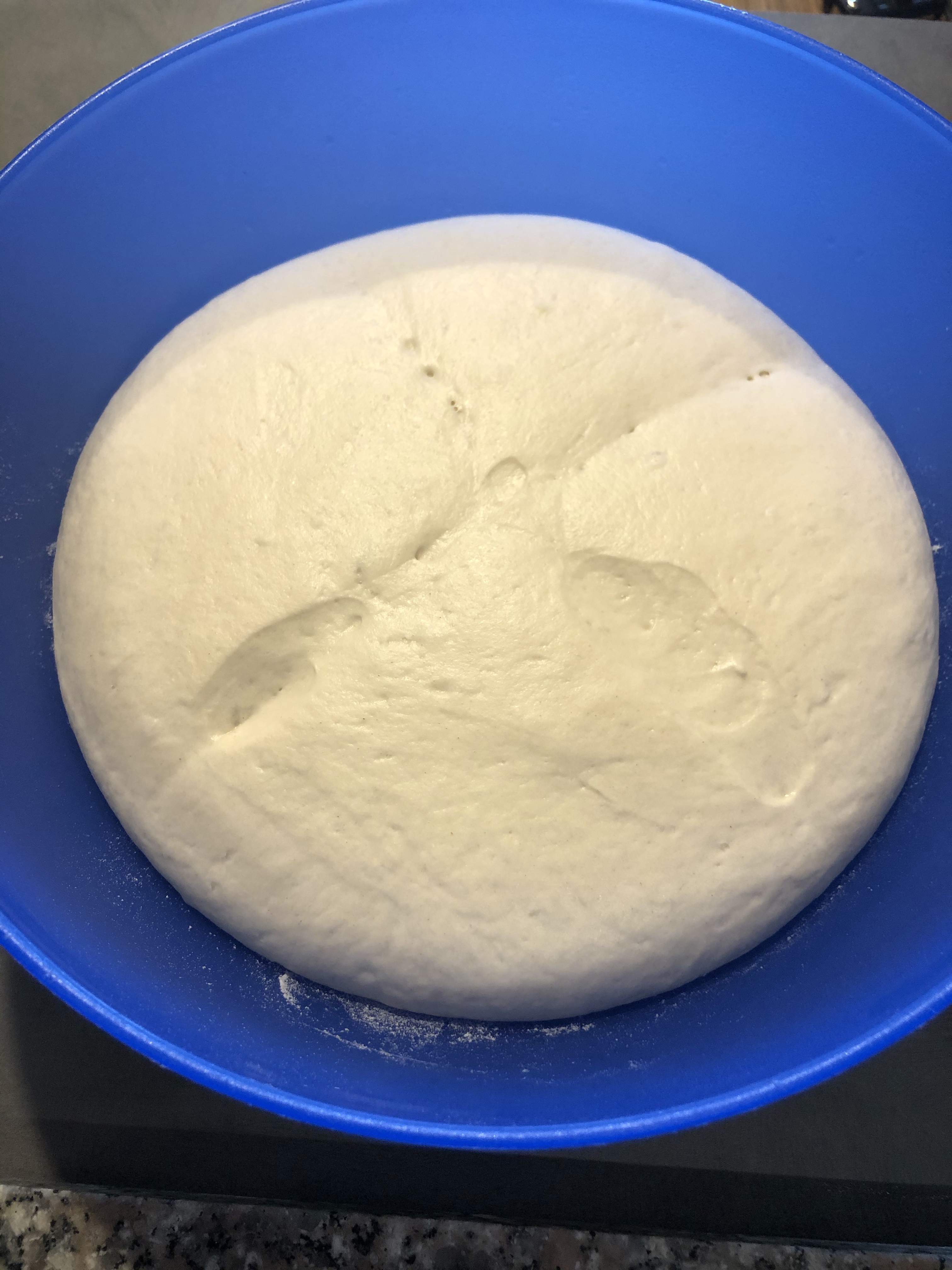 Formo una palla e la trasferisco in una grande ciotola leggermente infarinata e pratico un taglio a croce copro con un coperchio o con la pellicola e lascio lievitare per circa 2 ore in forno spento con la luce accesa