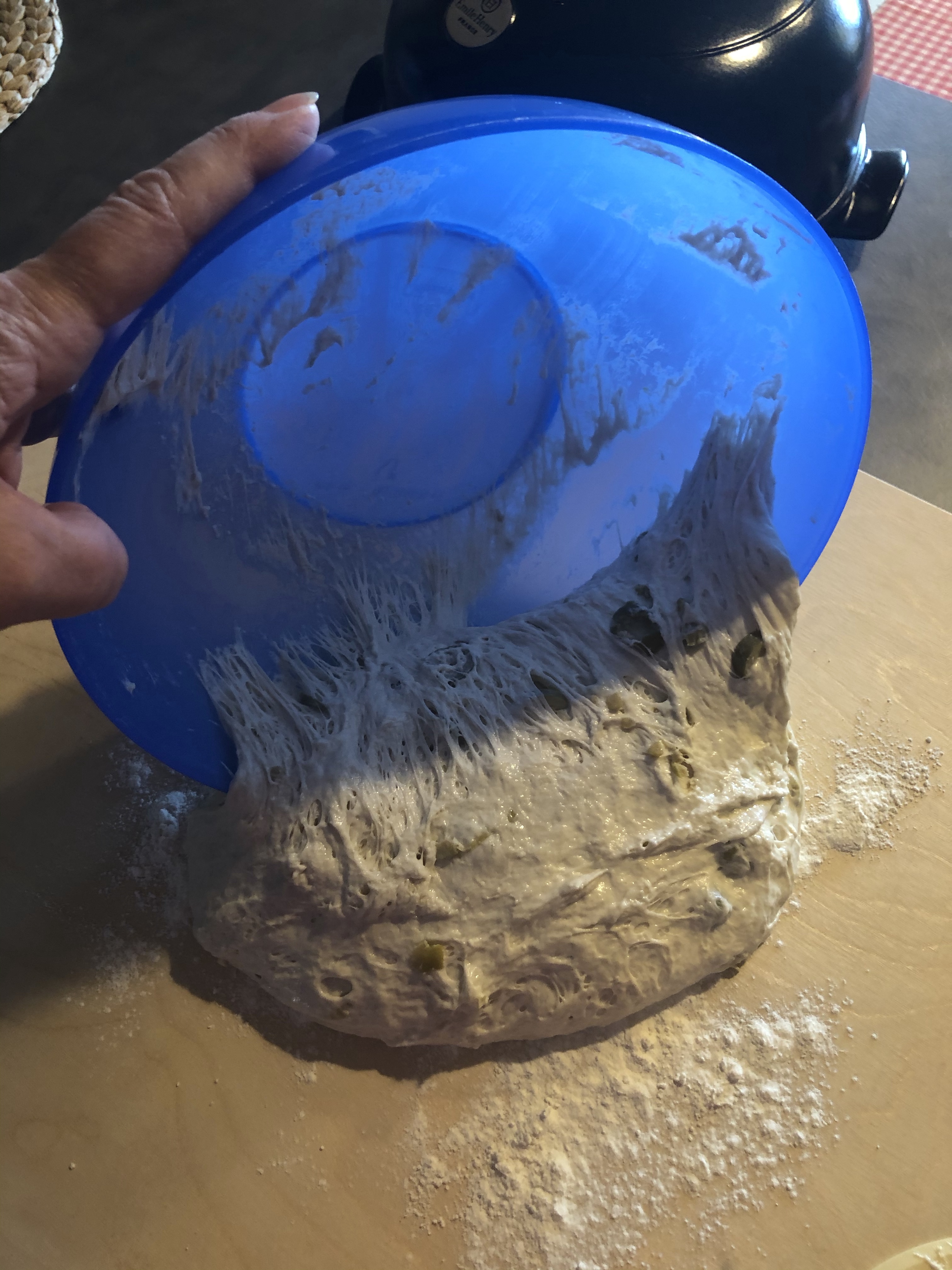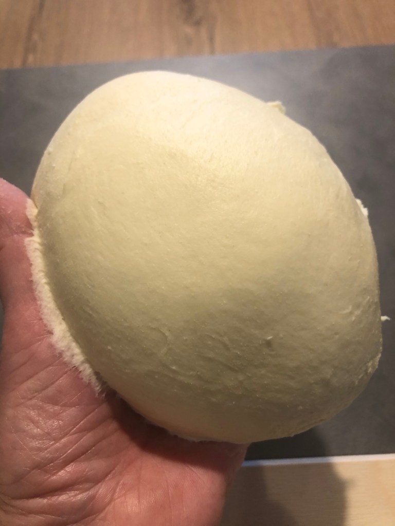 Lascio lavorare a lungo, deve risultare liscio asciutto ed elastico, meglio non superare mai la temperatura di 25 gradi dell’impasto, quando é ben incordato lo tolgo dal cestello lo lavoro un attimo sulla spianatoia e formo una palla liscia