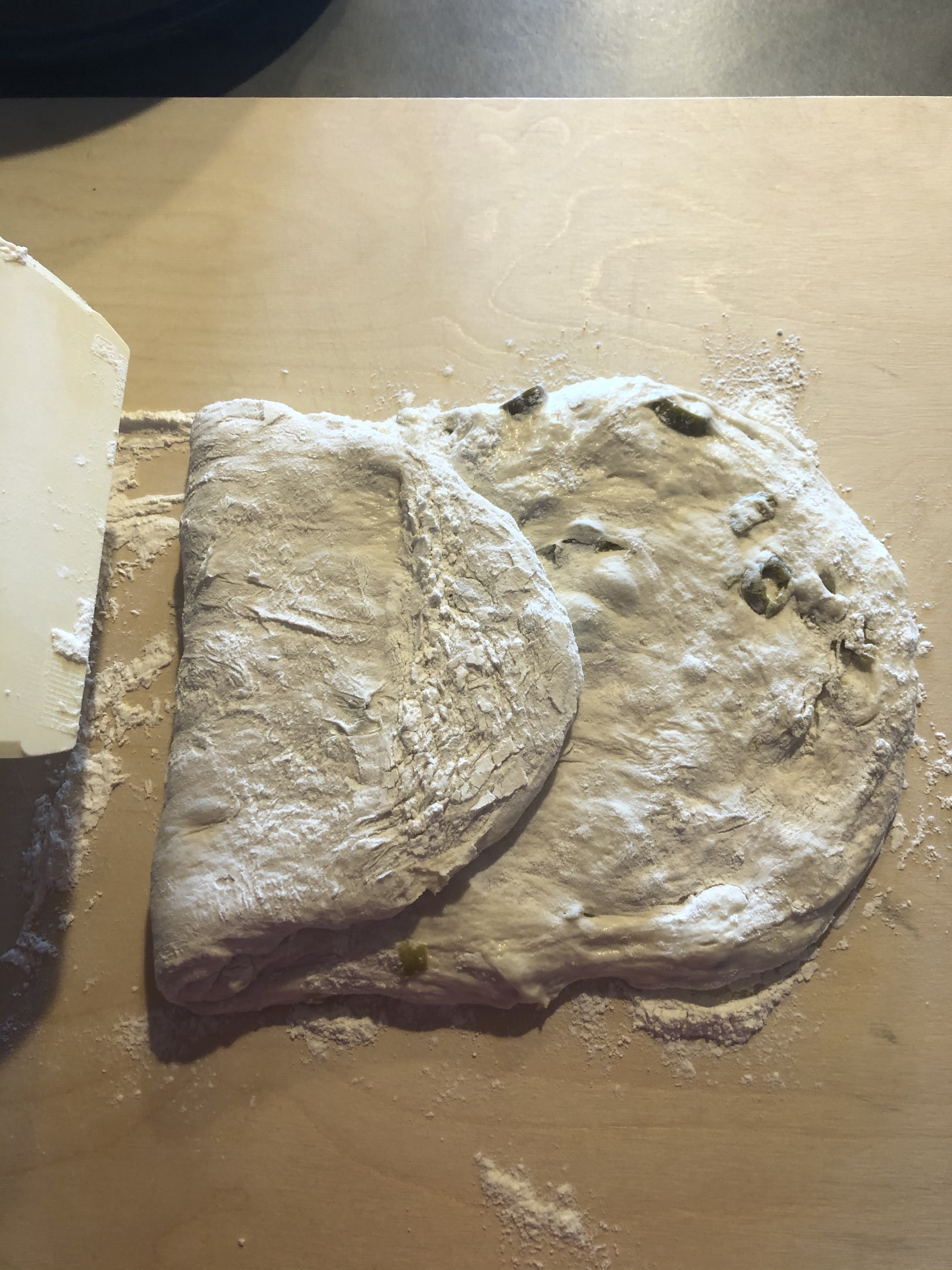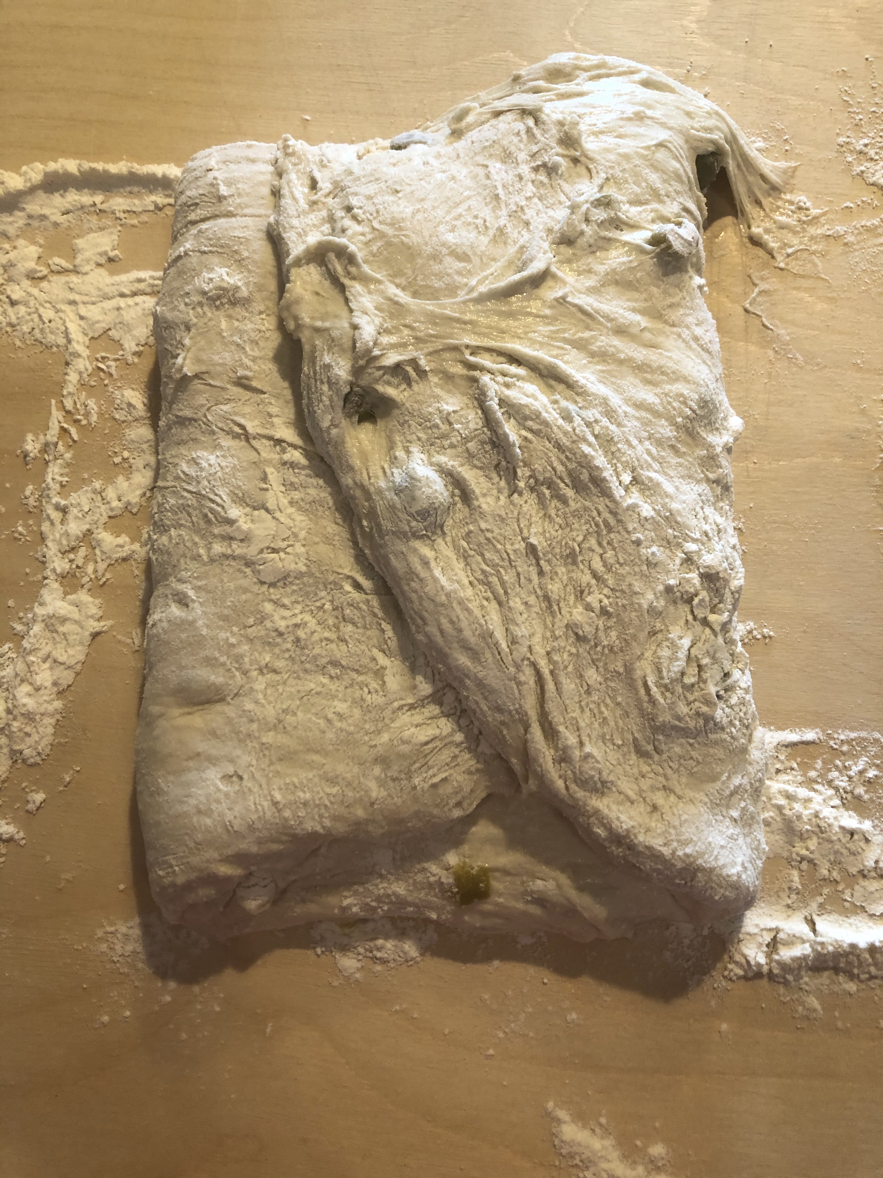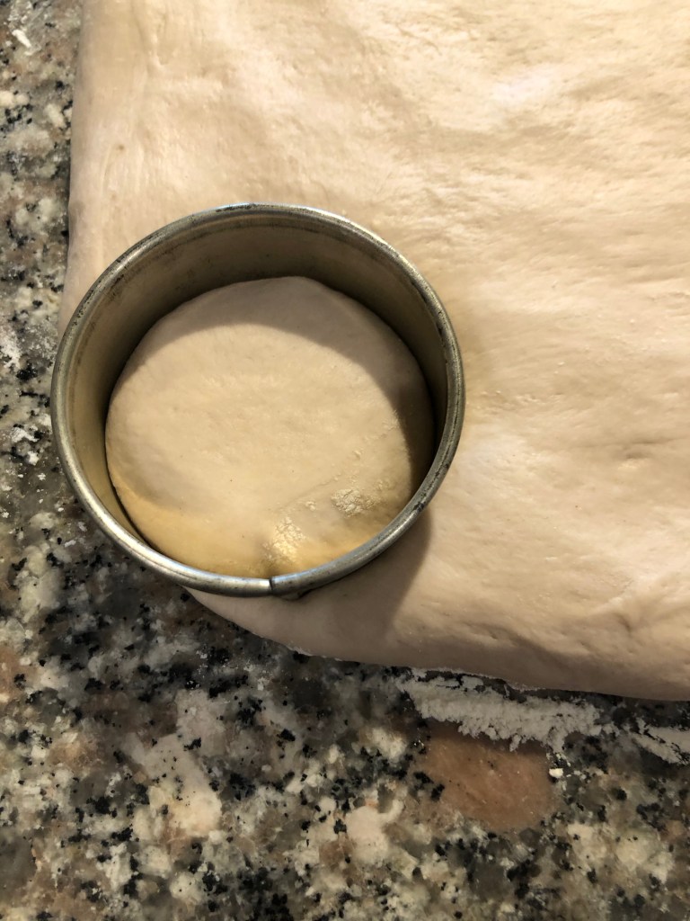 Una volta che l’impasto è lievitato lo stendo con le mani delicatamente, (non utilizzate il matterello) sul piano di lavoro leggermente infarinato e lo appiattisco ad uno spessore di circa 1cm e mezzo