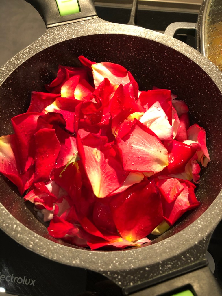 Prima di tutto preparo l”infuso di rose, porto quasi a bollore 600 gr di acqua, poi aggiungo i petali delle rose che ho lavato
