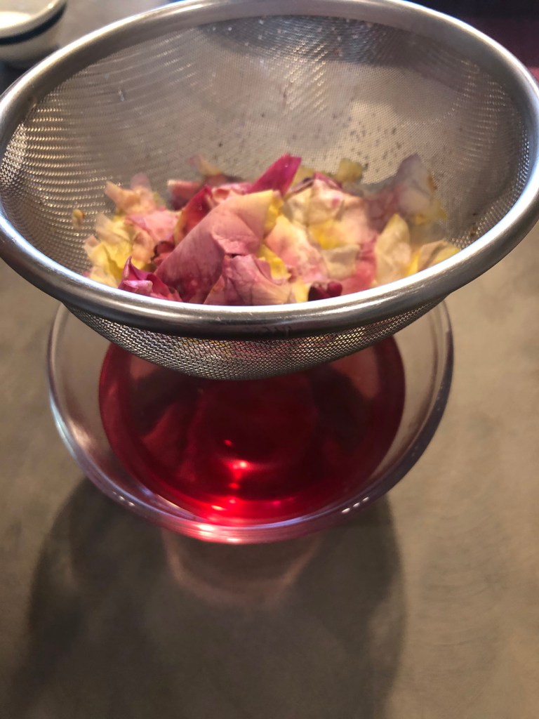 Li lascio macerare per 10 minuti coperti, poi filtro con un colino, lascio raffreddare in frigorifero, i petali li elimino