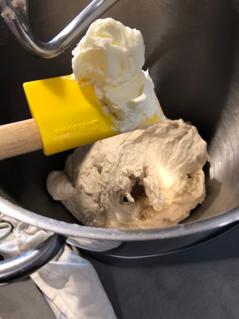 Lascio lavorare molto bene, deve incordarsi, controllate comunque l’impasto non deve essere duro, ma morbido e non troppo appiccicoso, questo dipende molto dal tipo di farina che utilizzate e da quanto assorbirà i liquidi, quindi se é troppo duro unite un goccio di latte se viceversa é troppo molle unite poca farina per volta, l’impasto deve iniziare a staccarsi dalle pareti, a questo punto aggiungete il burro morbido a piccoli pezzi poco per volta, aggiungete il secondo pezzo quando il primo si è incorporato