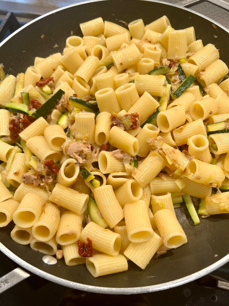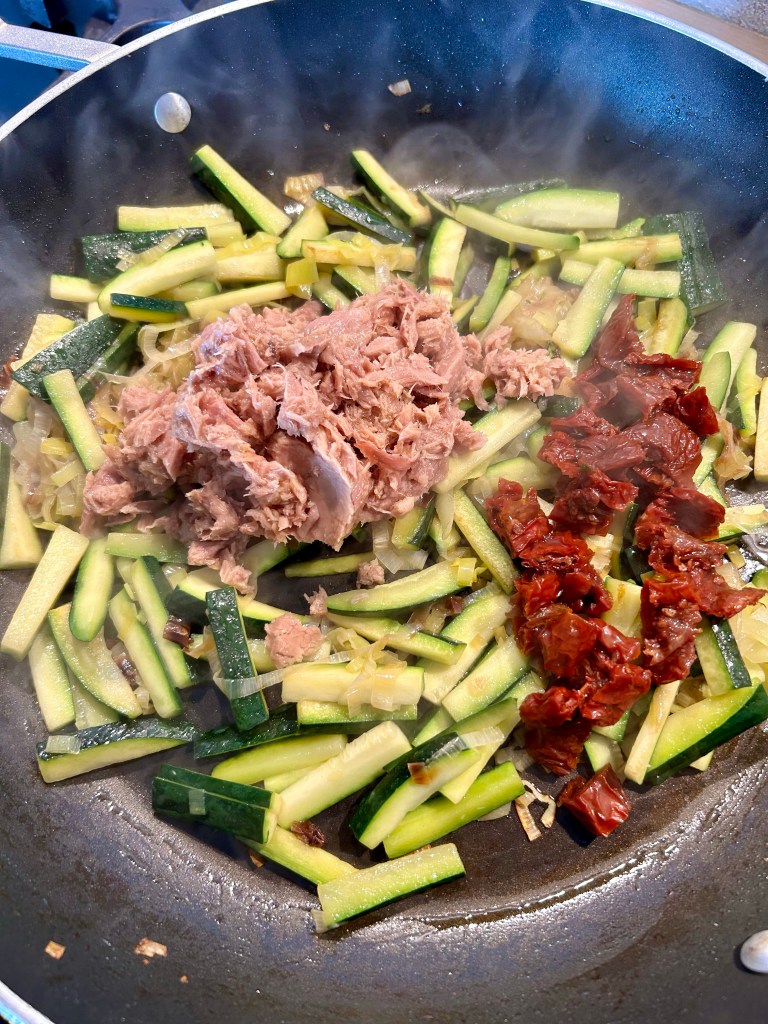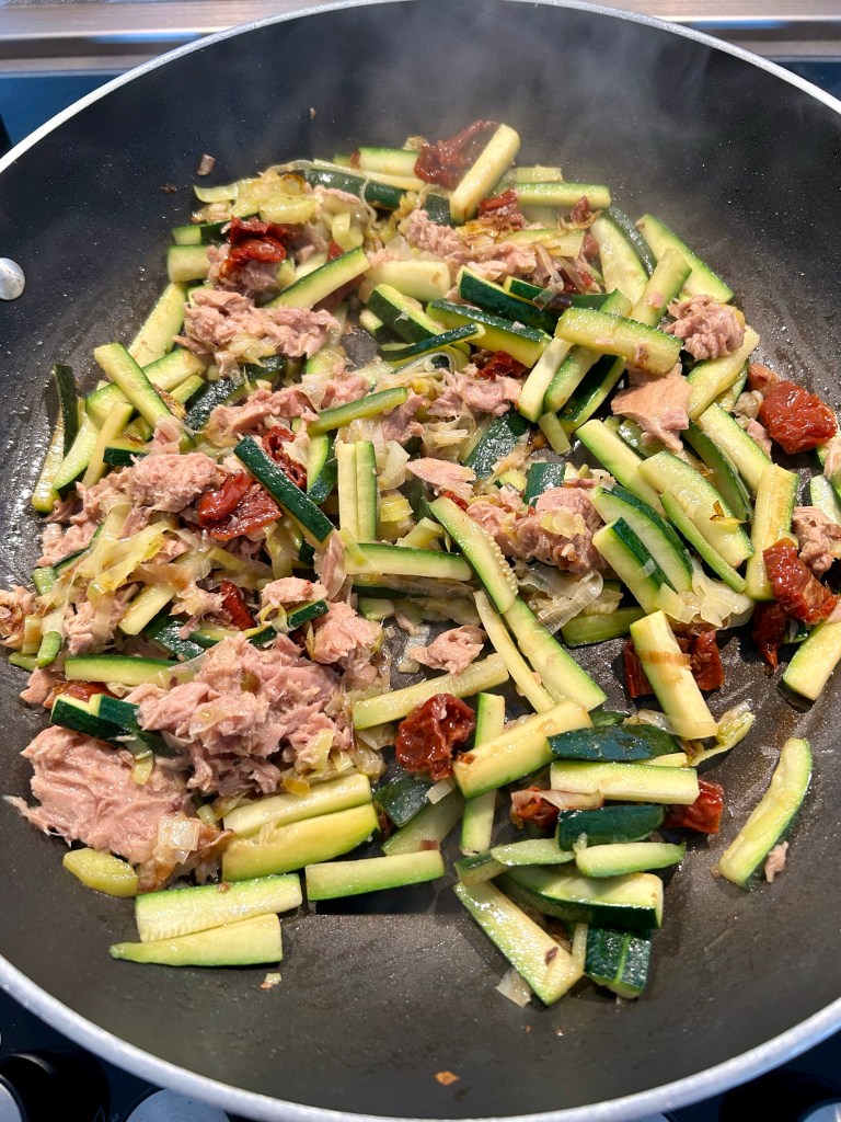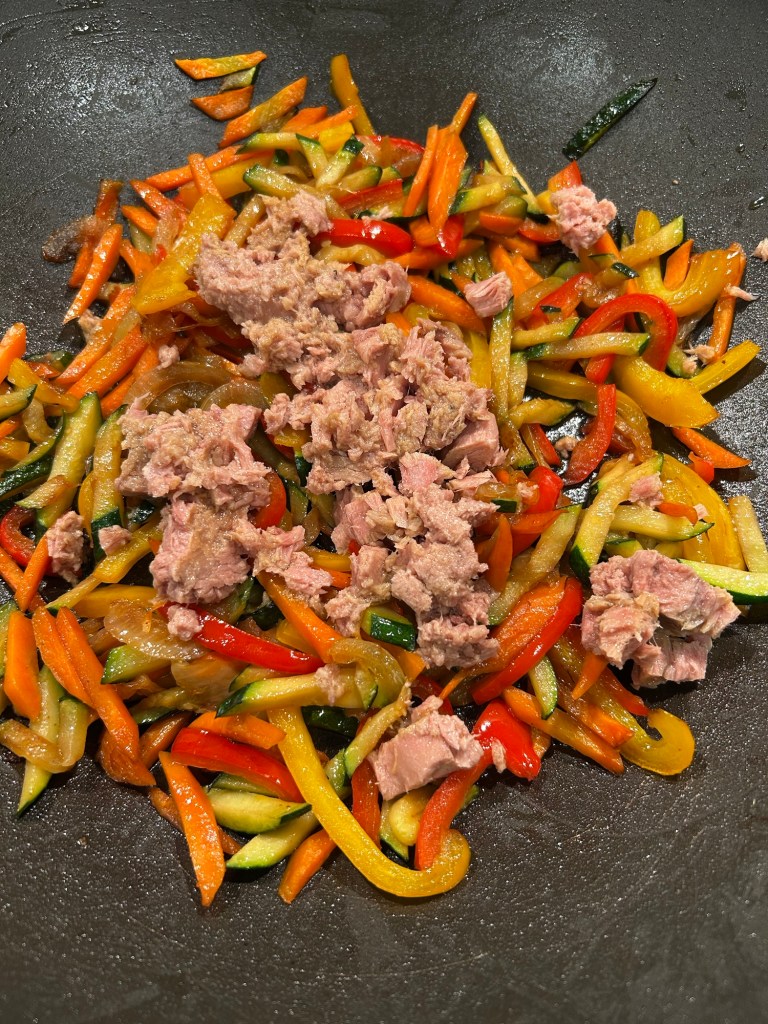 Le verdure devono rimanere croccanti, aggiungo il tonno, tengo da parte
