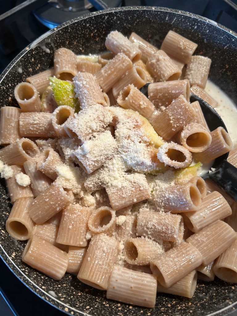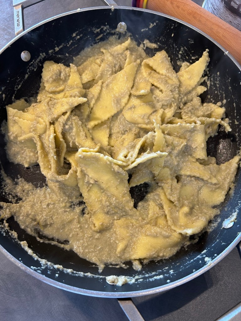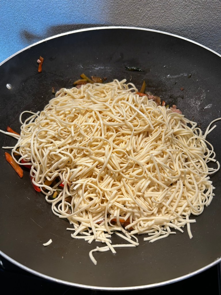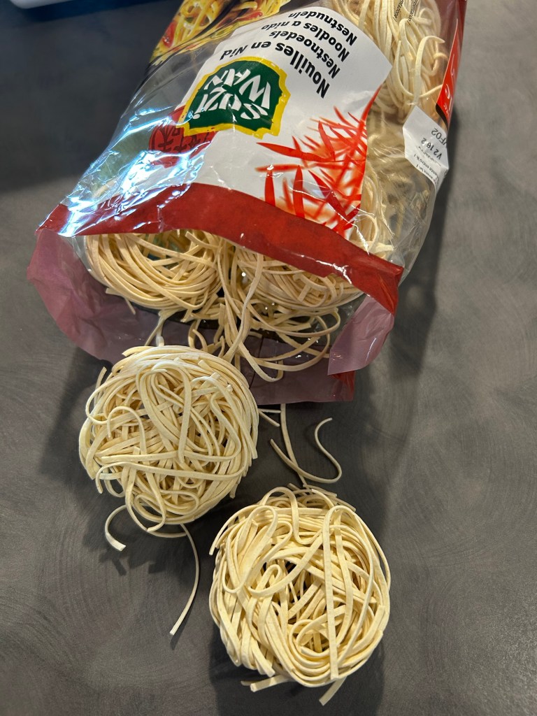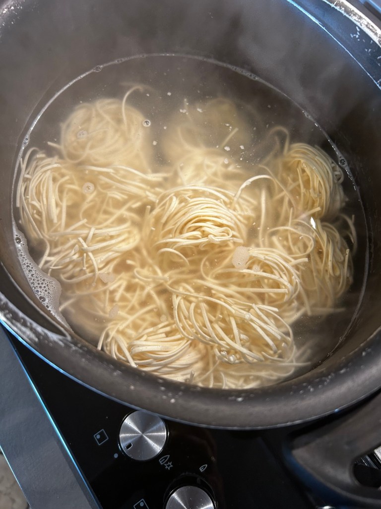 Porto a bollore una pentola con abbondante acqua leggermente salata poi seguo le istruzioni sulla confezione, raggiunto il bollore spengo il fuoco, aggiungo le matassine di noodles a fiamma spenta e lascio per 4 minuti, seguite le istruzioni altrimenti i noodles si rompono, dopo un paio di minuti li muovo delicatamente per disfare le matassine poi li scolo, tengo un pochino di acqua di cottura che potrebbe servire per mantecare