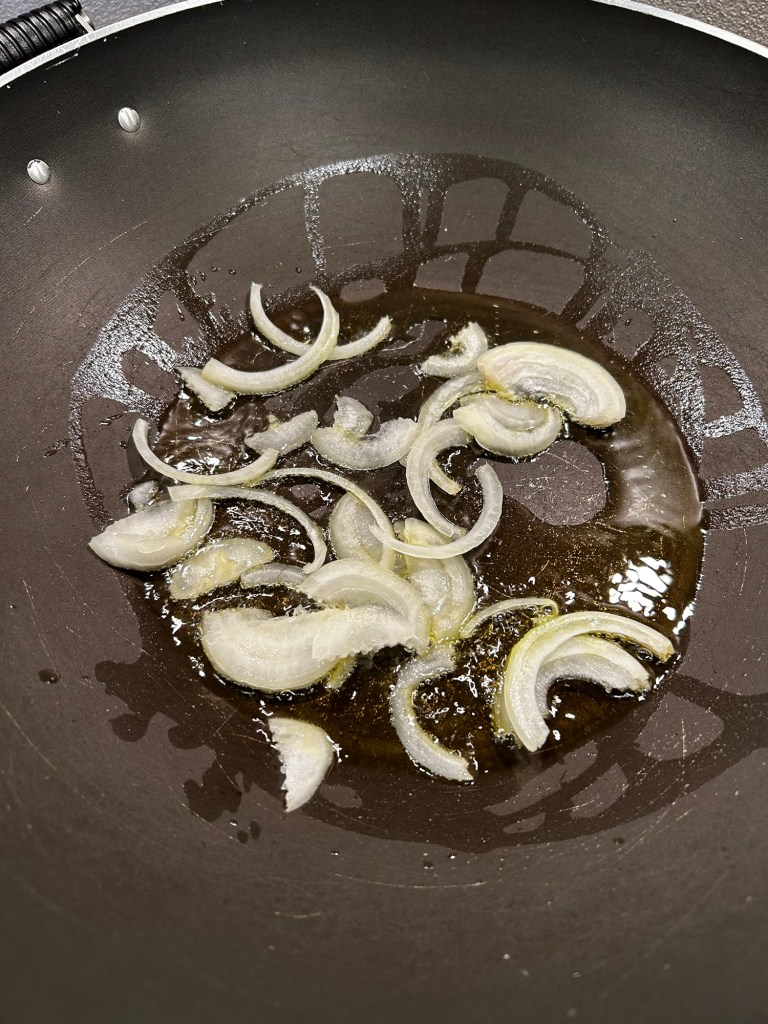 Affetto la cipolla sottilmente e la metto nella wok con un po’ di olio