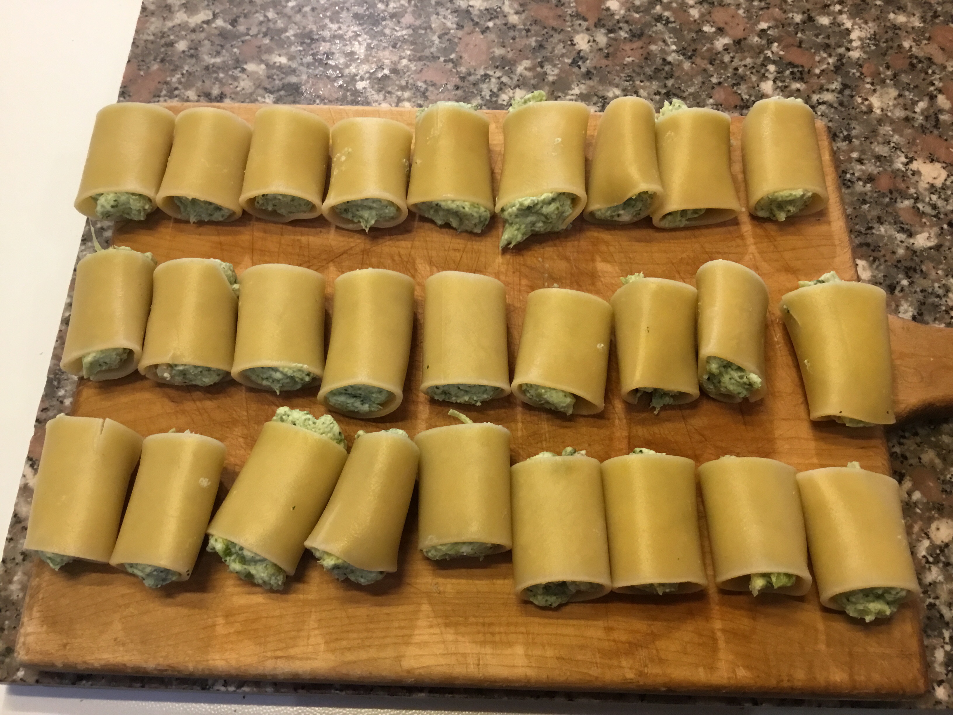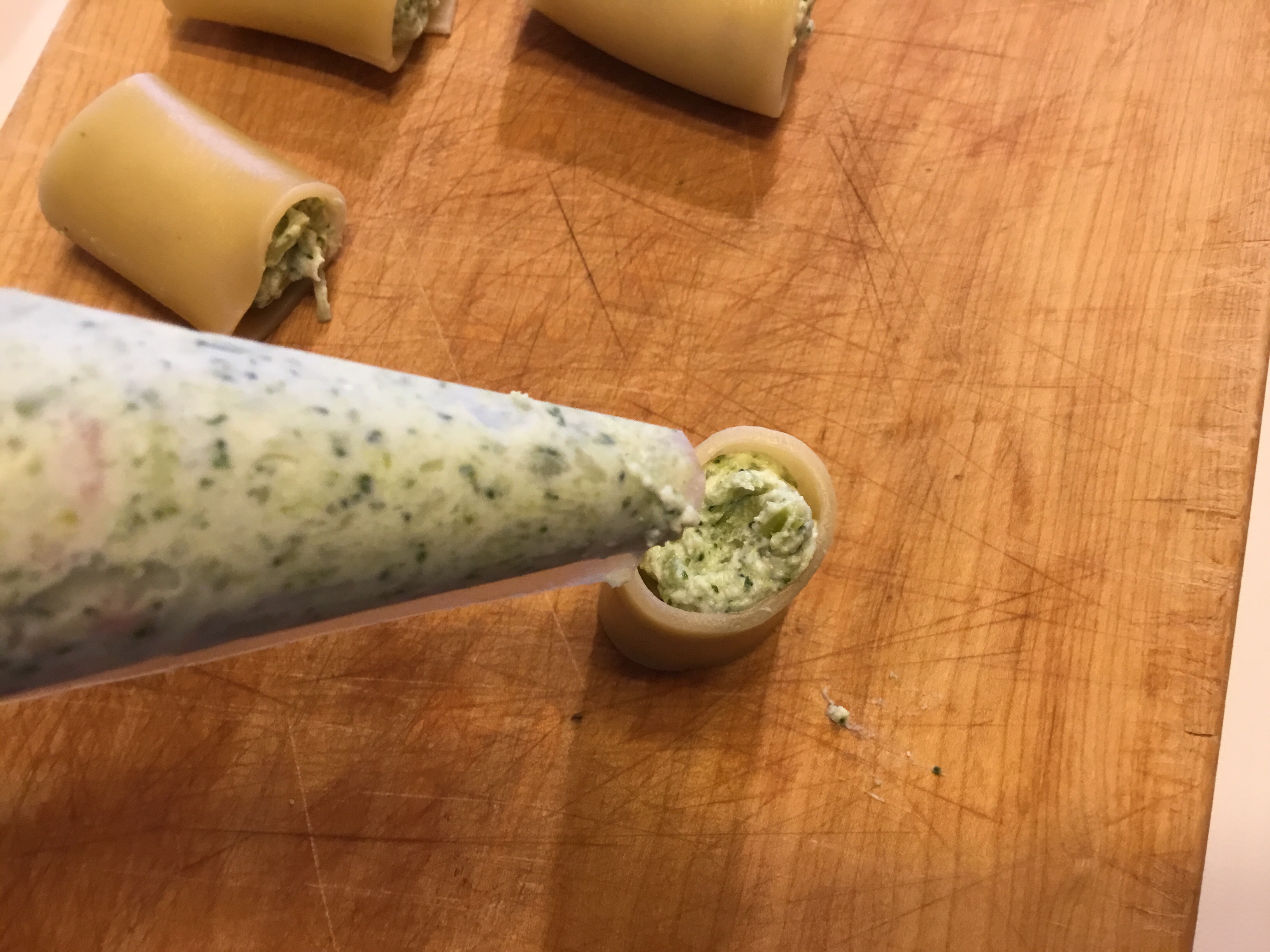 Dispongo i Paccheri in piedi e con un cucchiaino oppure un sac a poche li farcisco