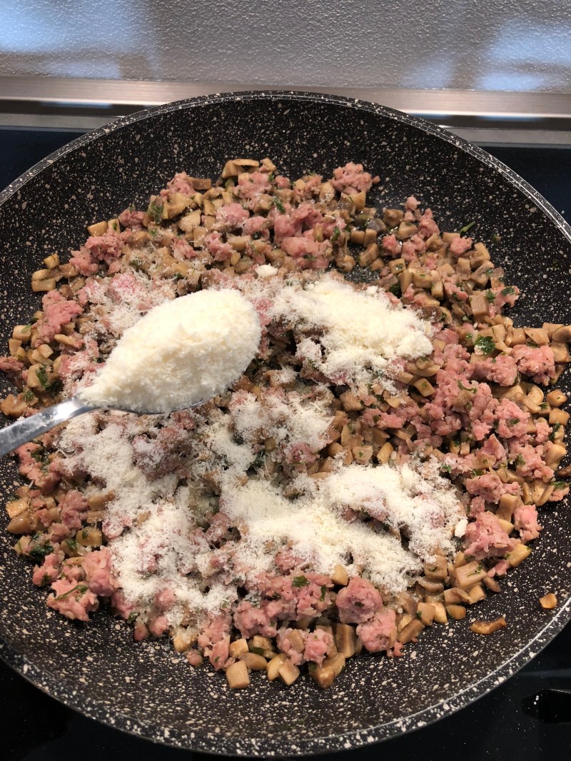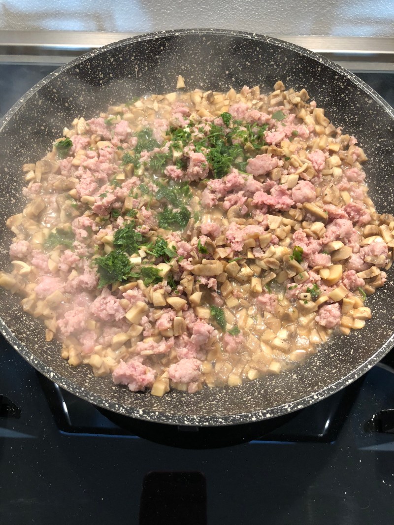 In una larga padella verso dell’olio extravergine e aggiungo i funghi, poi la luganega, sale, pepe, il prezzemolo tritato e porto a cottura
