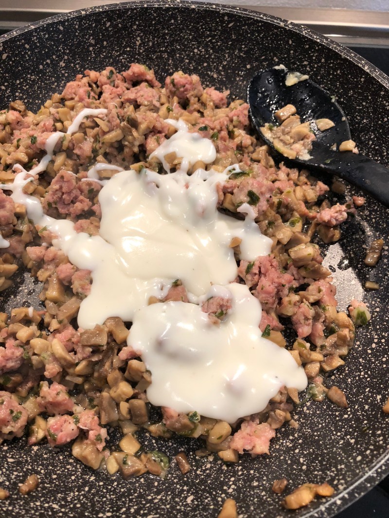 Prendo 3/4 cucchiai di besciamella e li aggiungo al sugo di funghi e salsiccia e amalgamo bene