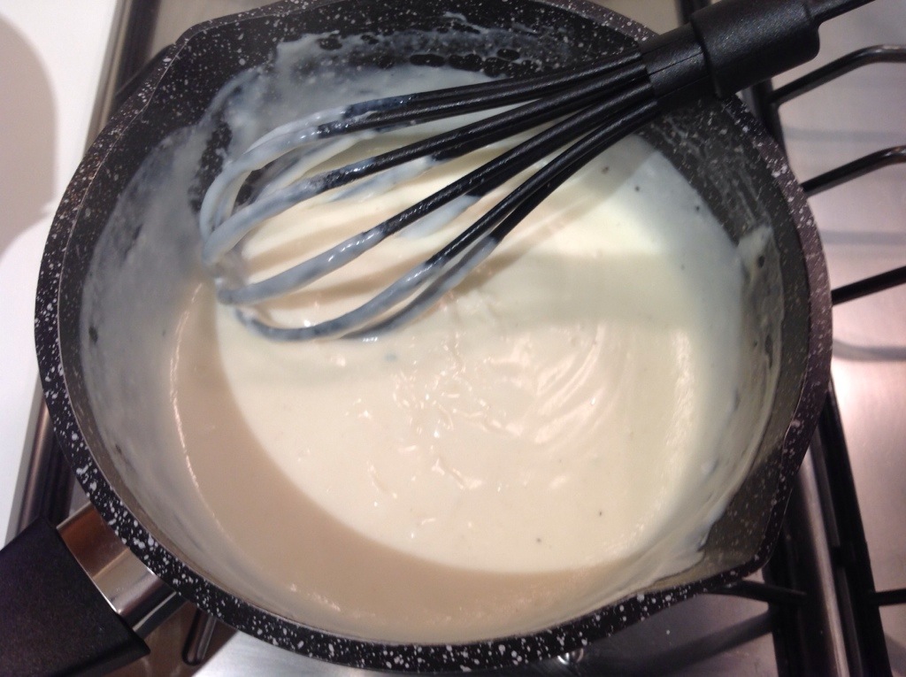 Preparo del burro fuso, con poco olio, 2 spicchi di aglio, salvia e aggiungo un paio di cucchiai di acqua di cottura ed emulsiono , ne verso una parte in una teglia e affetto il rotolo dello spessore di circa 1 cm